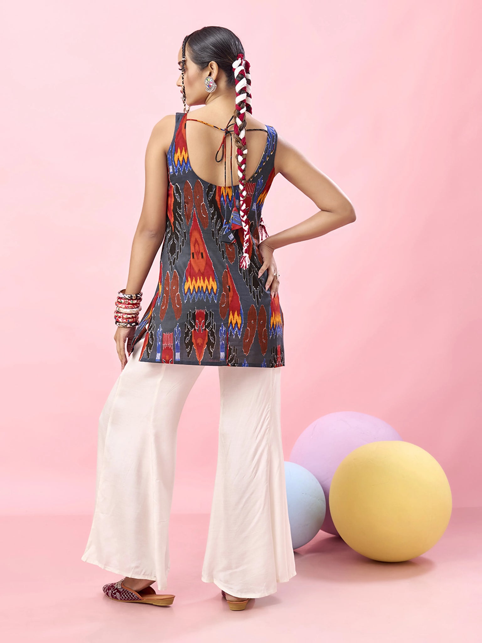 Bluish Grey Multicolor Ikat Printed Cotton Short Kurti with Tie-Back Detail