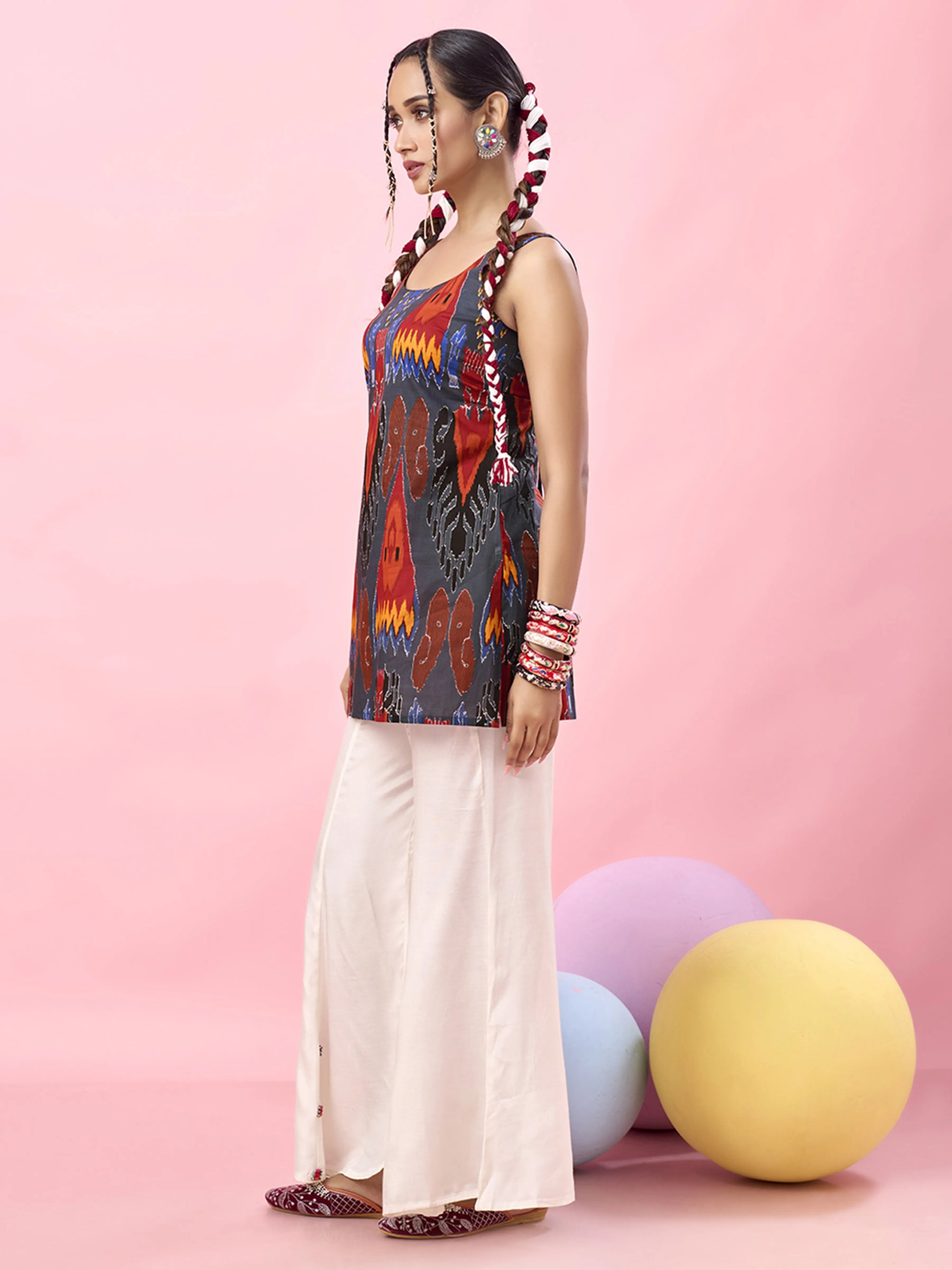 Bold yet balanced, this bluish-grey short kurti is crafted for women who love statement prints with an easy, wearable silhouette. Made from breathable cotton, the kurti features a striking all-over multicolor Ikat-inspired print that brings vibrant energy while maintaining a grounded, contemporary aesthetic—ideal for daywear that stands out without trying too hard.