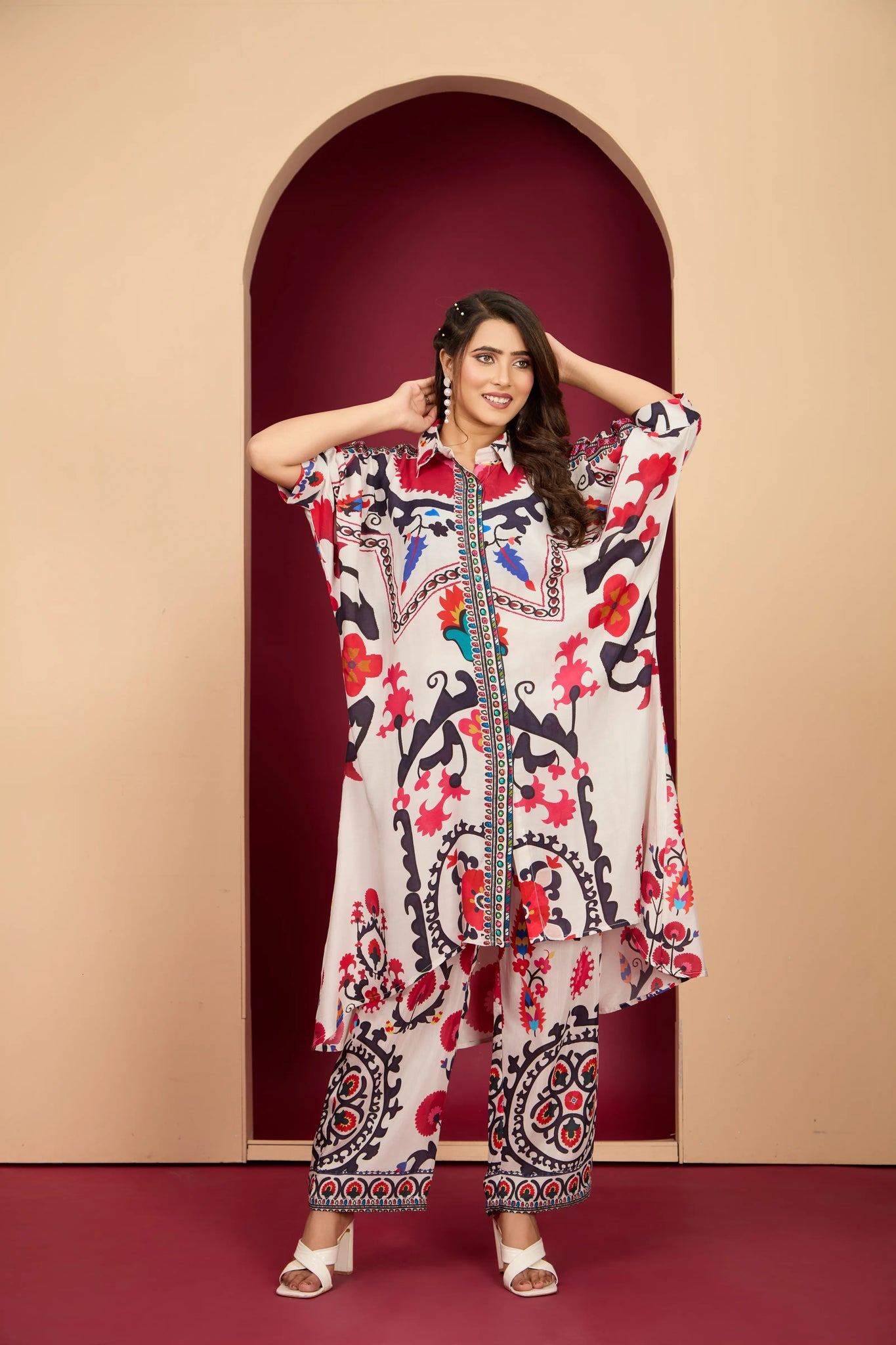 Boho Mirage: Bold Multicolor Muslin Kaftan Kurta & Printed Straight Pant Co-ord Set