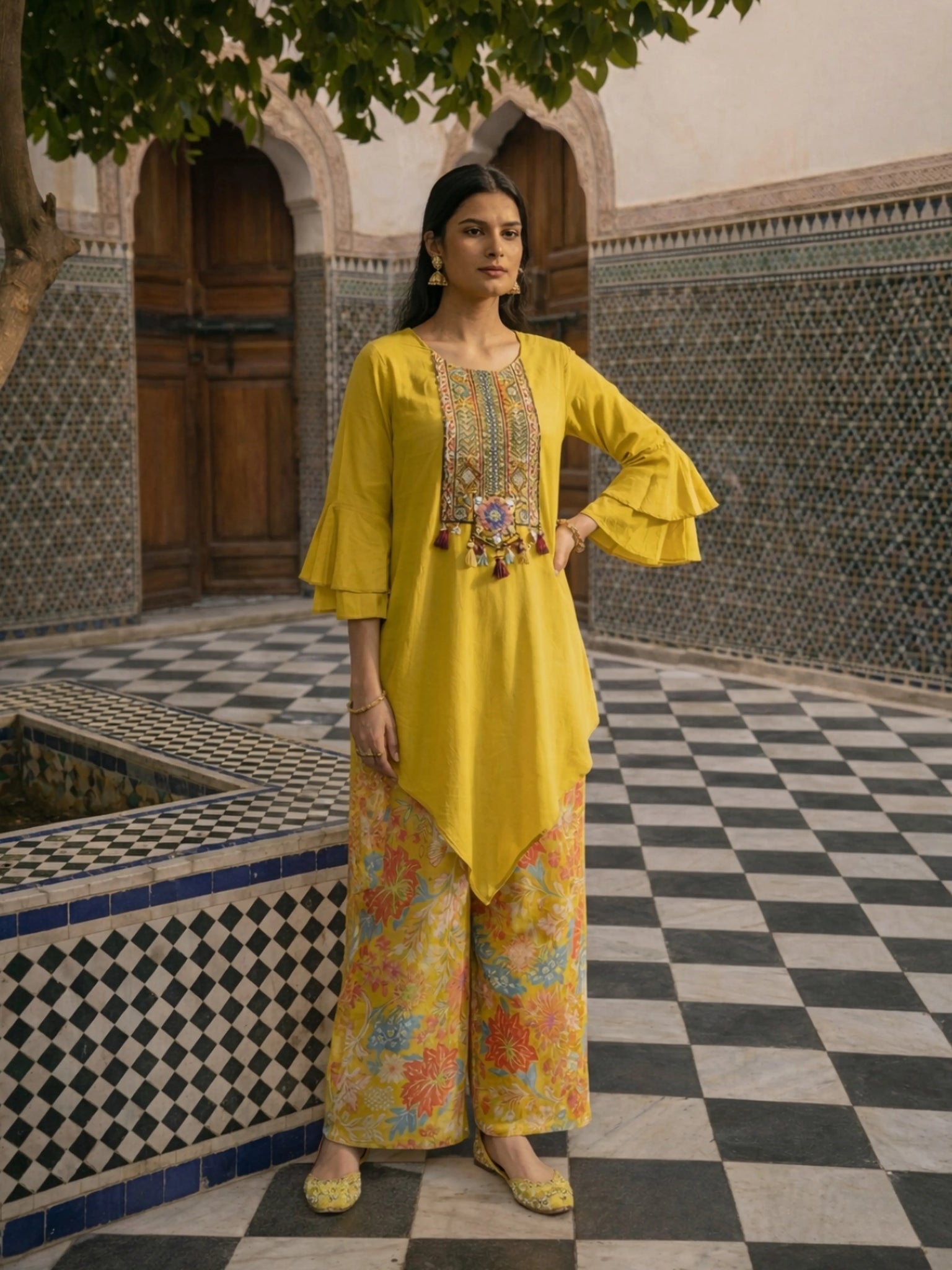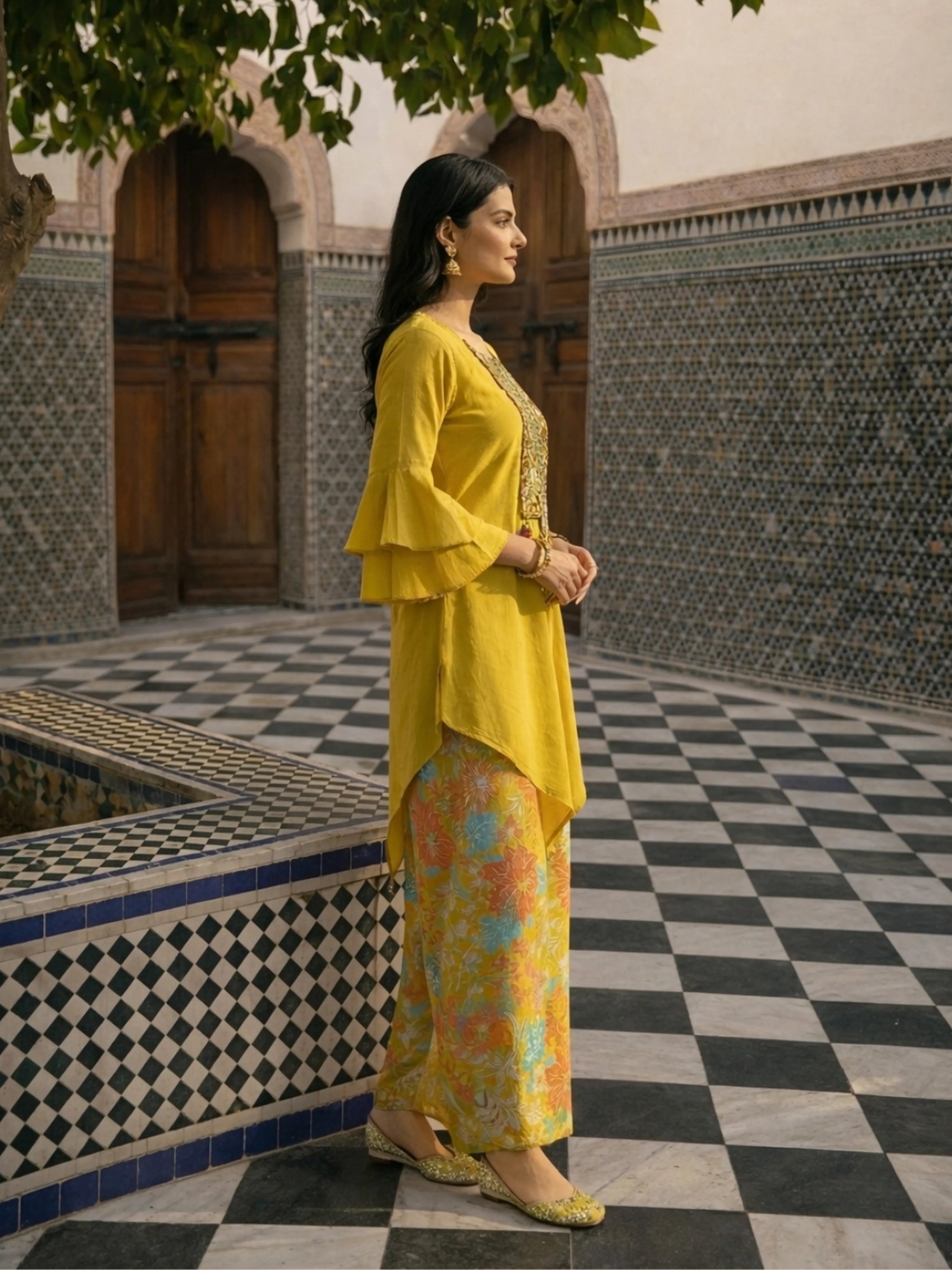 Sunlit Jardin Luxe: Yellow Asymmetrical Embroidered Kurti & Floral Palazzo Co-ord Set
