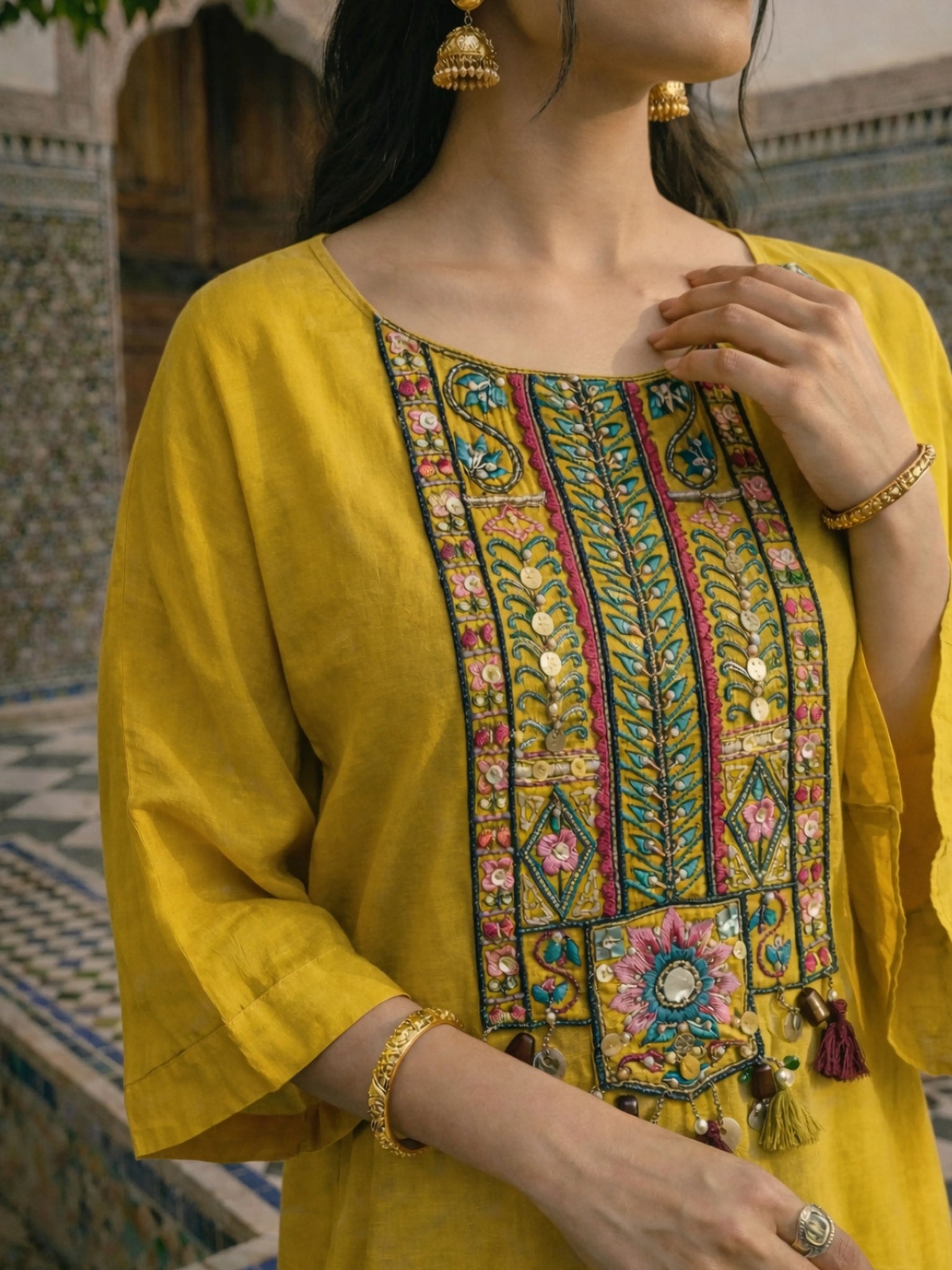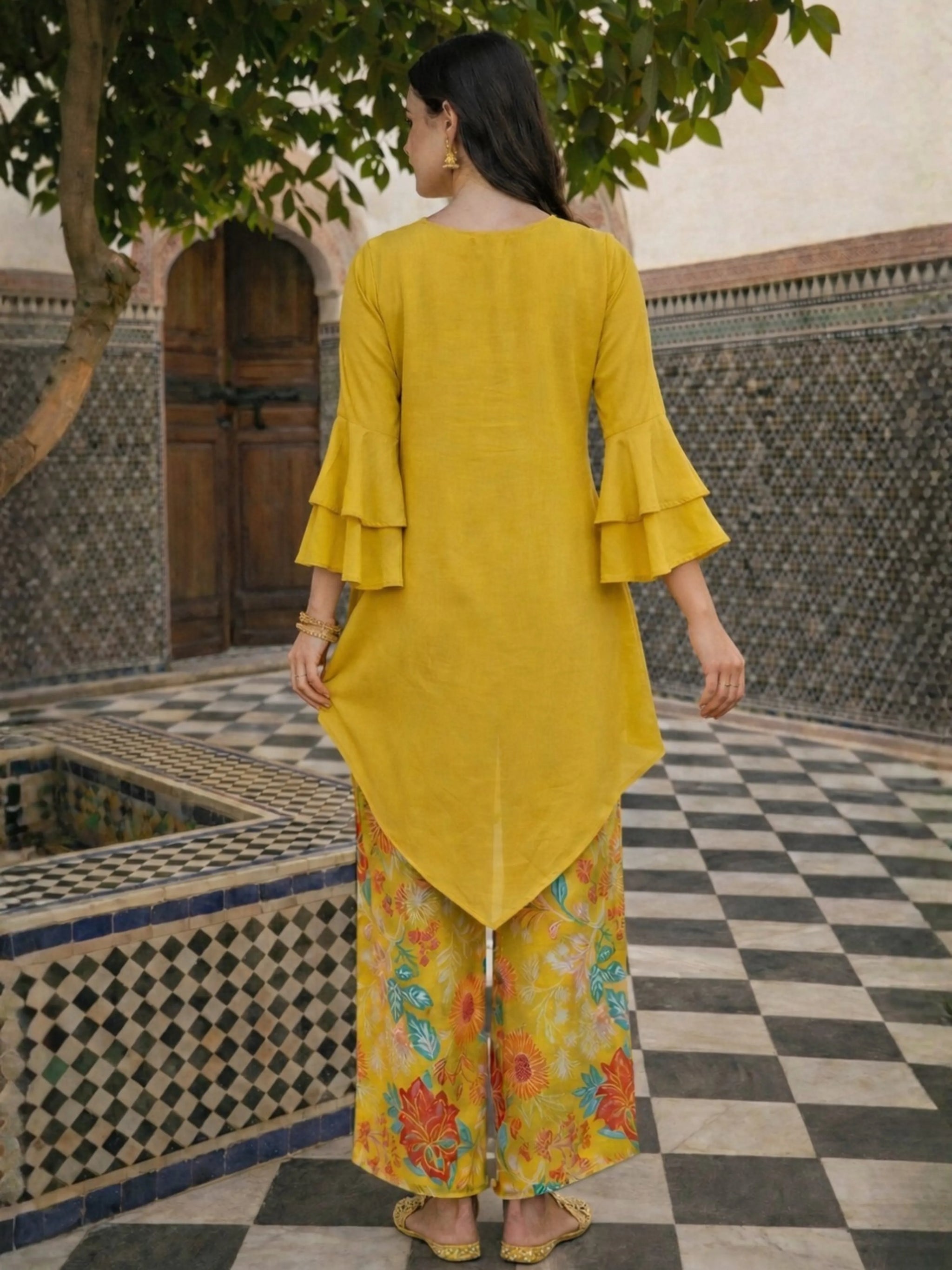 The yellow asymmetrical kurti is designed with a refined round neckline, elevated by intricate multicolored thread embroidery accented with delicate bead and sequin highlights. These hand-finished details add depth and texture, creating a focal point that feels festive yet refined. The 3/4th sleeves are finished with tiered ruffle cuffs, introducing soft drama and movement, while the flowy high-low hemline enhances the silhouette with graceful fluidity.