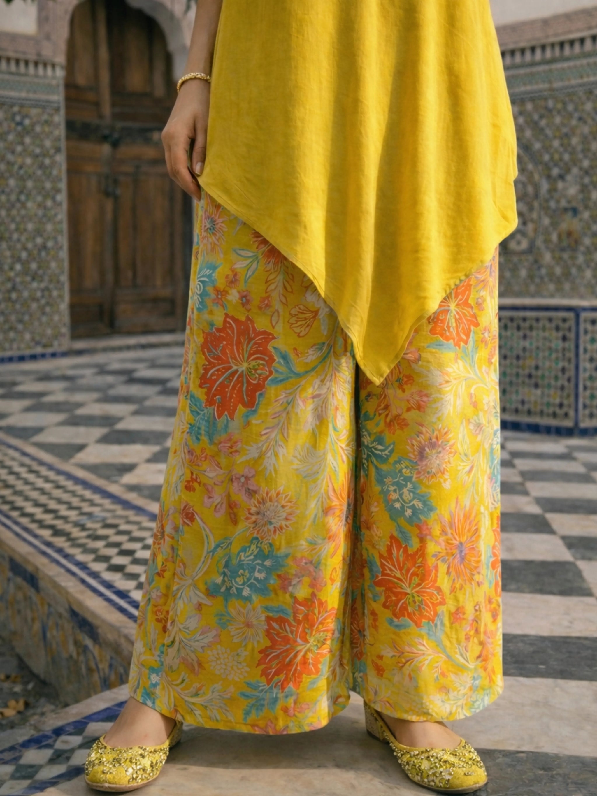 Color: Bright yellow kurti paired with multicolored floral printed palazzo