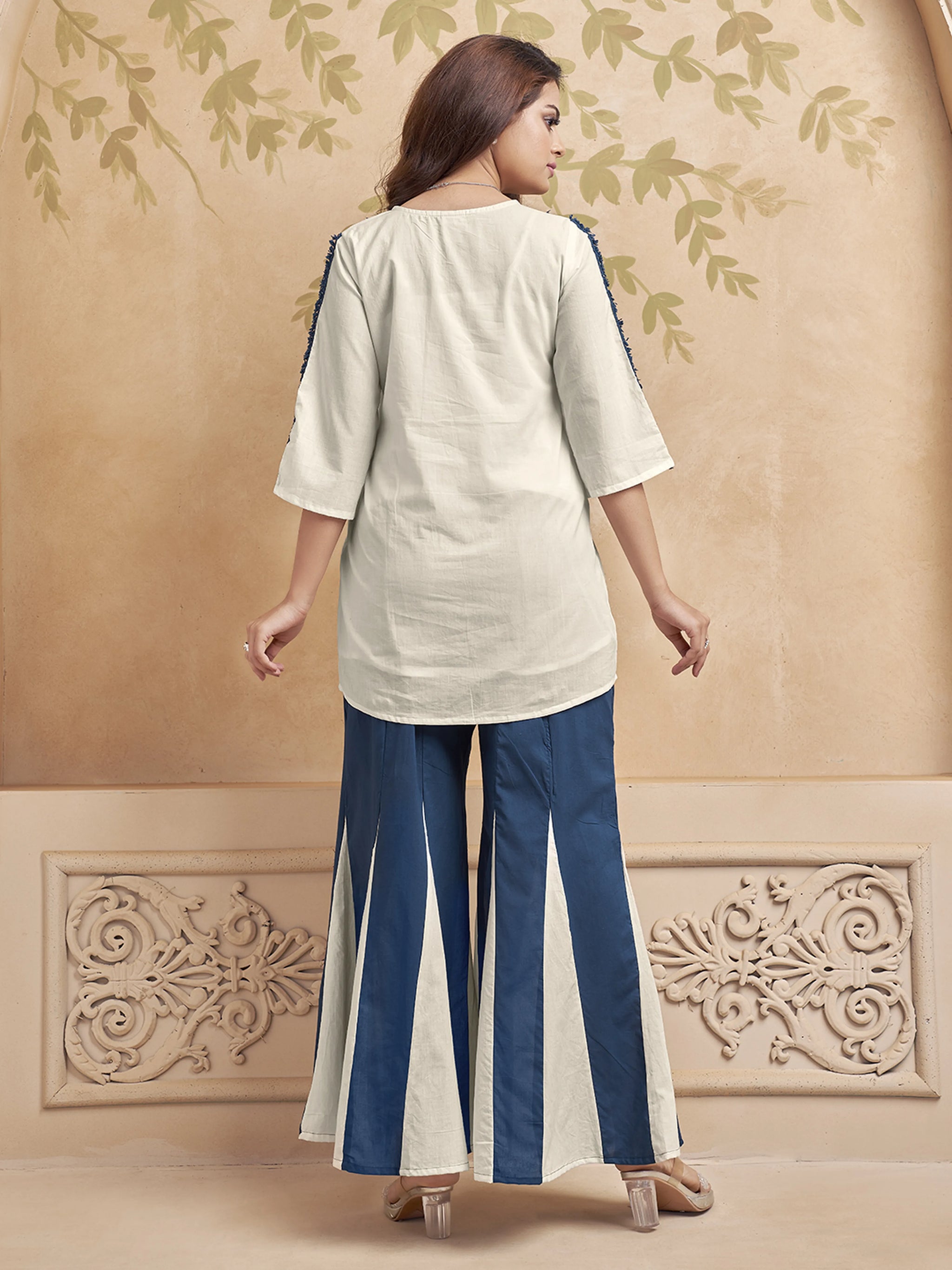 Indigo Bloom: Classic White Base Embroidered Kurta & Dual-Tone Flared Pant Co-ord Set in Cotton