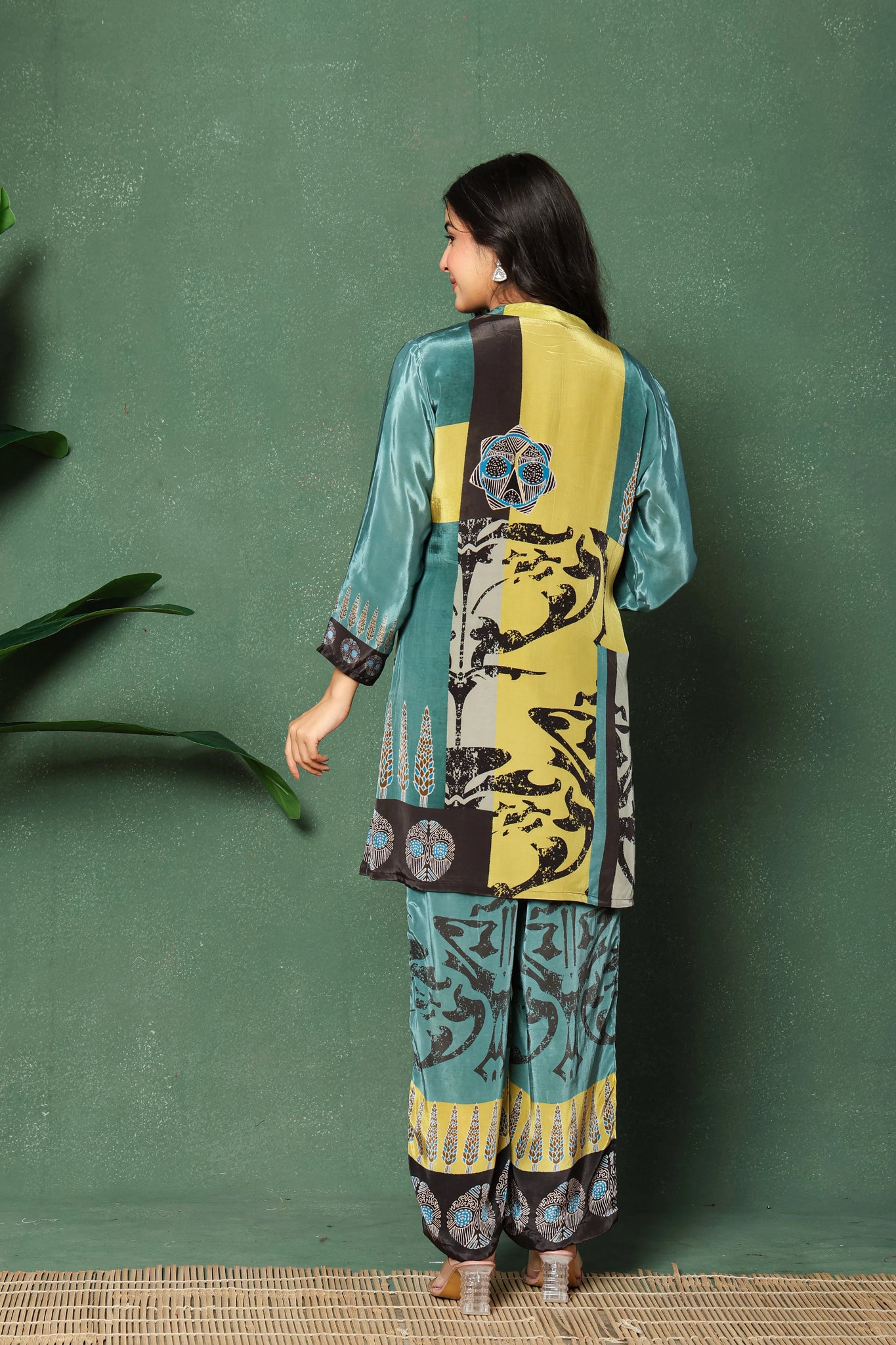 Art meets ease in this refreshing play of sage green and lime yellow, brought alive through bold abstract patterns and modern structure. This co-ord kurta set is crafted in soft crepe fabric, featuring a Mandarin collar with a V-neck placket and long sleeves with intricate print cuffs. The straight-fit pants complete the look with coordinated prints, a comfortable elasticated waist, and functional pockets — making this set a perfect choice for contemporary women who seek both utility and bold style.
