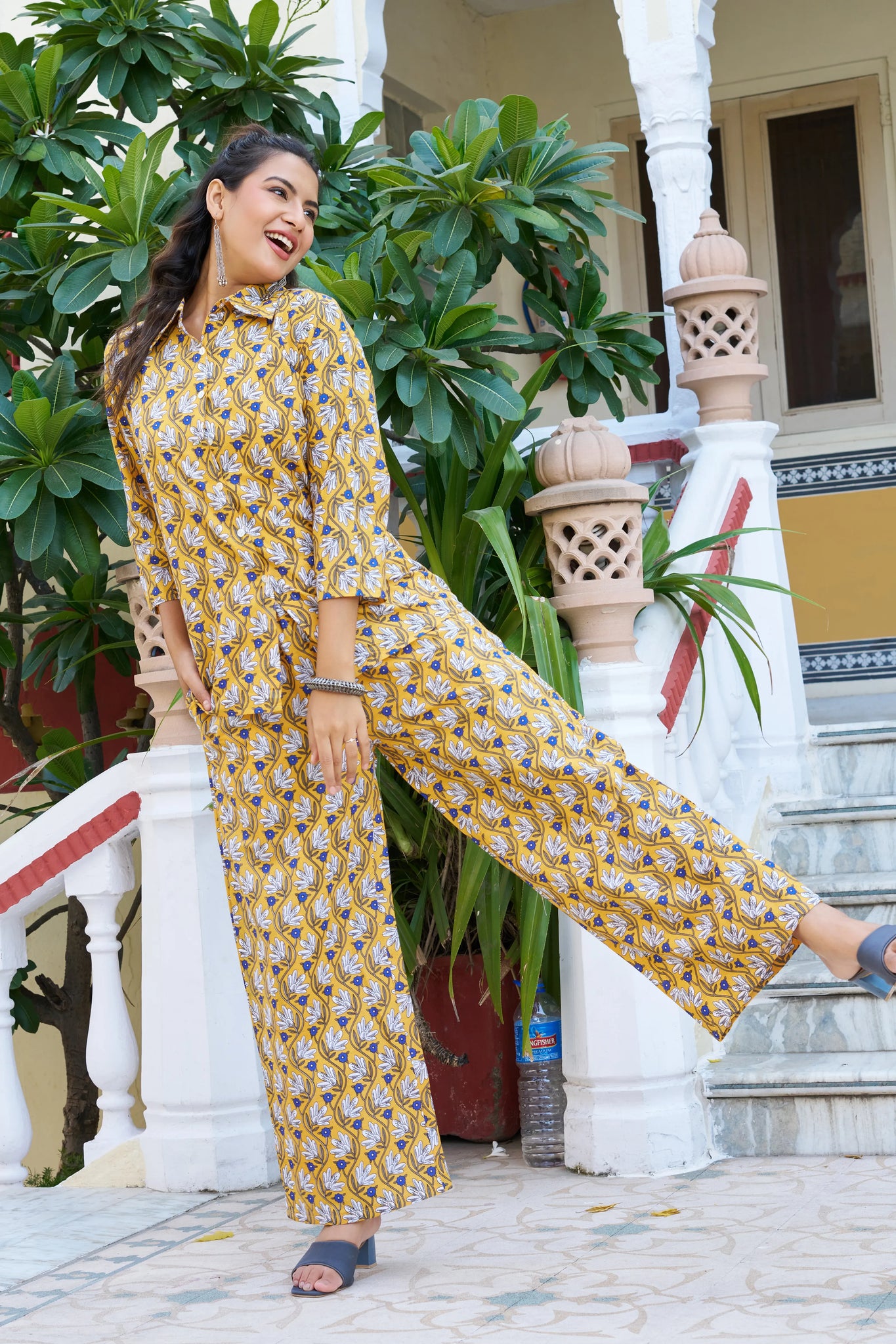 Brighten your wardrobe with this radiant yellow co-ord set, adorned with an all-over white and blue floral motif. Featuring a collared shirt-style top with front buttons and elasticated straight pants with pockets, this breathable cotton cambric outfit blends everyday ease with timeless charm.