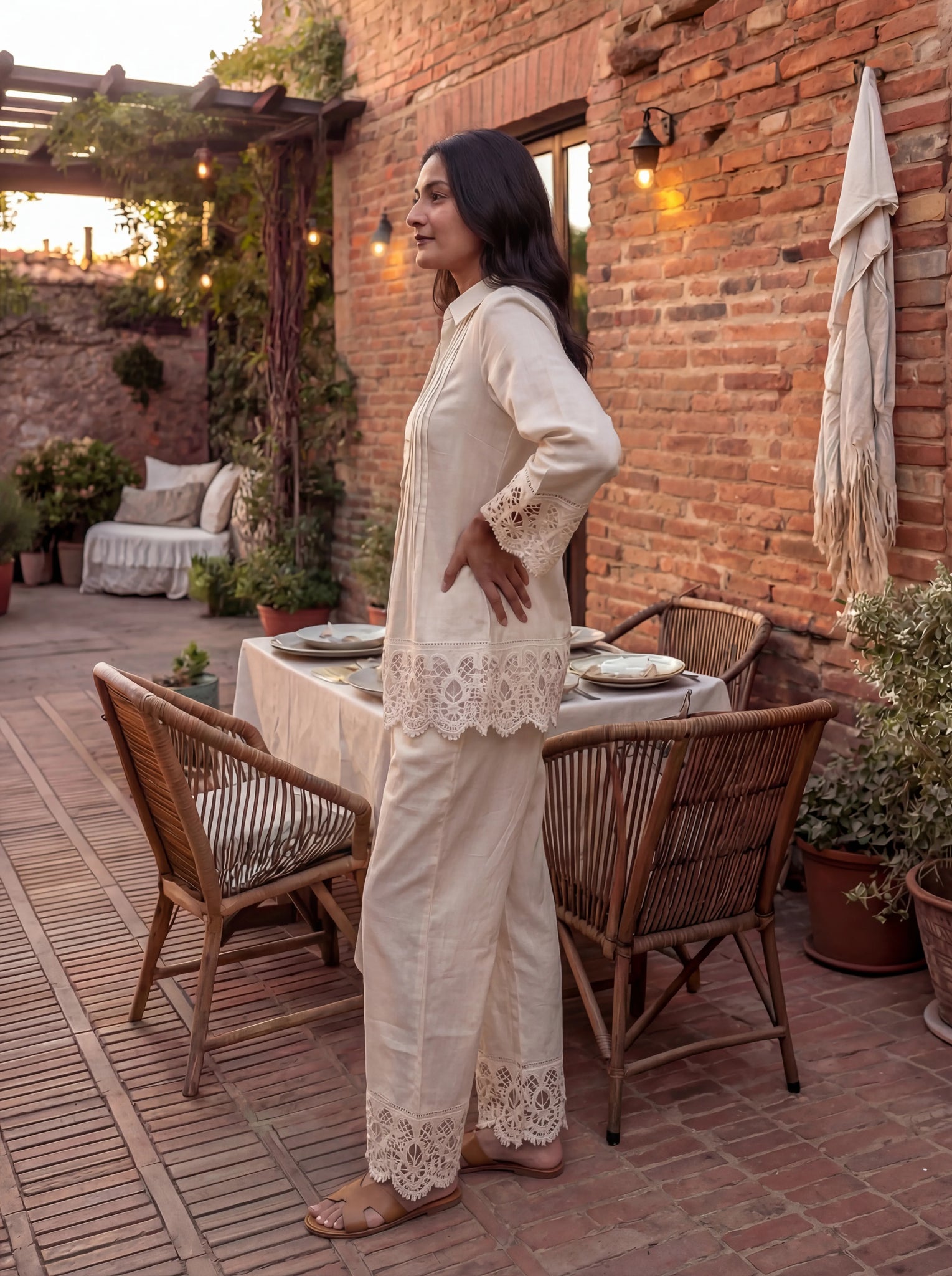 The top features a serene organic beige tone, enhanced with delicate pintuck detailing that adds texture and structure to the silhouette. Designed with a classic shirt collar and button-front closure, it offers a polished yet relaxed appeal. The full sleeves are beautifully finished with intricate cutout floral lace, extending to the hem to create a graceful, feminine finish that elevates the entire look.