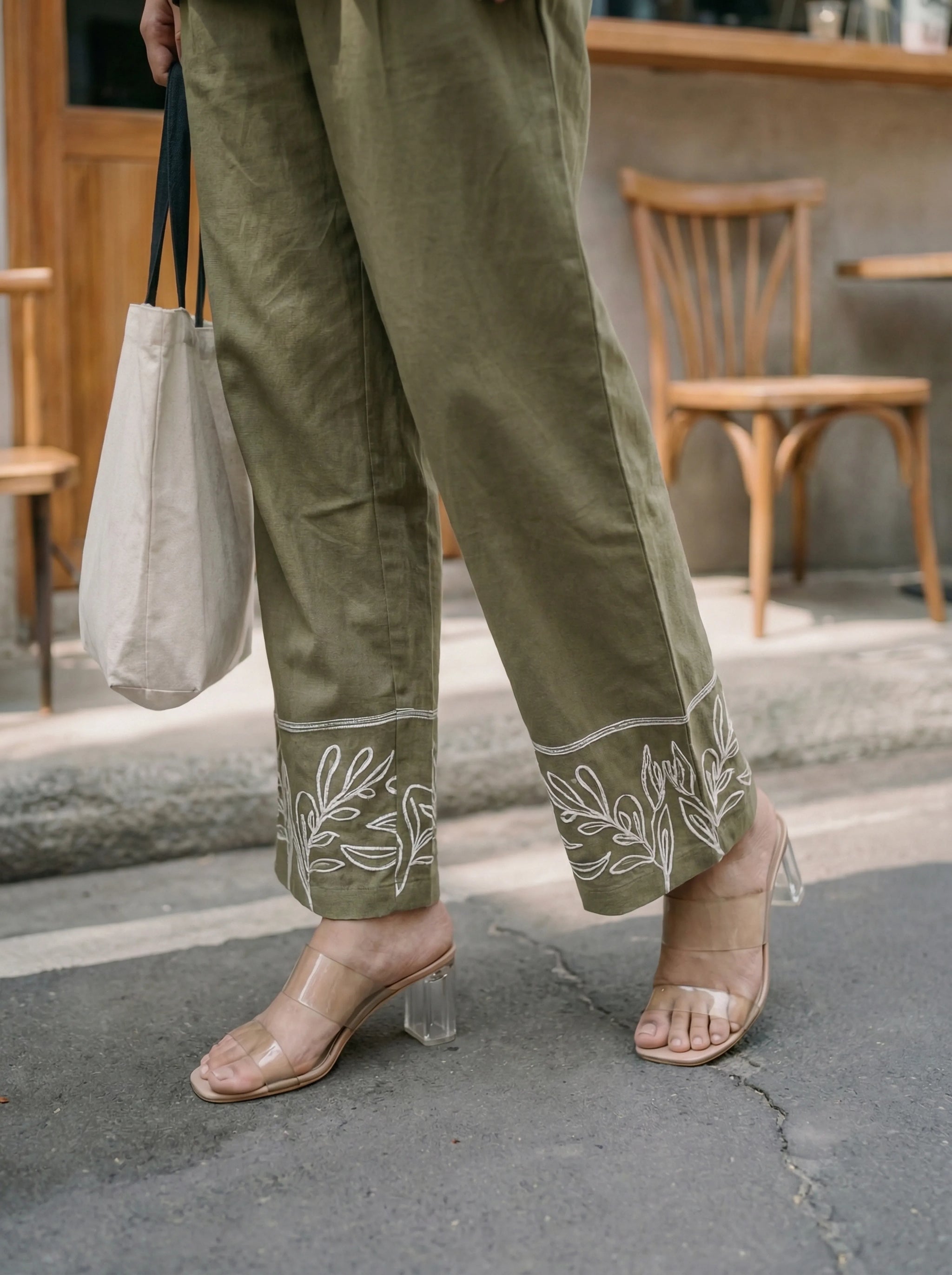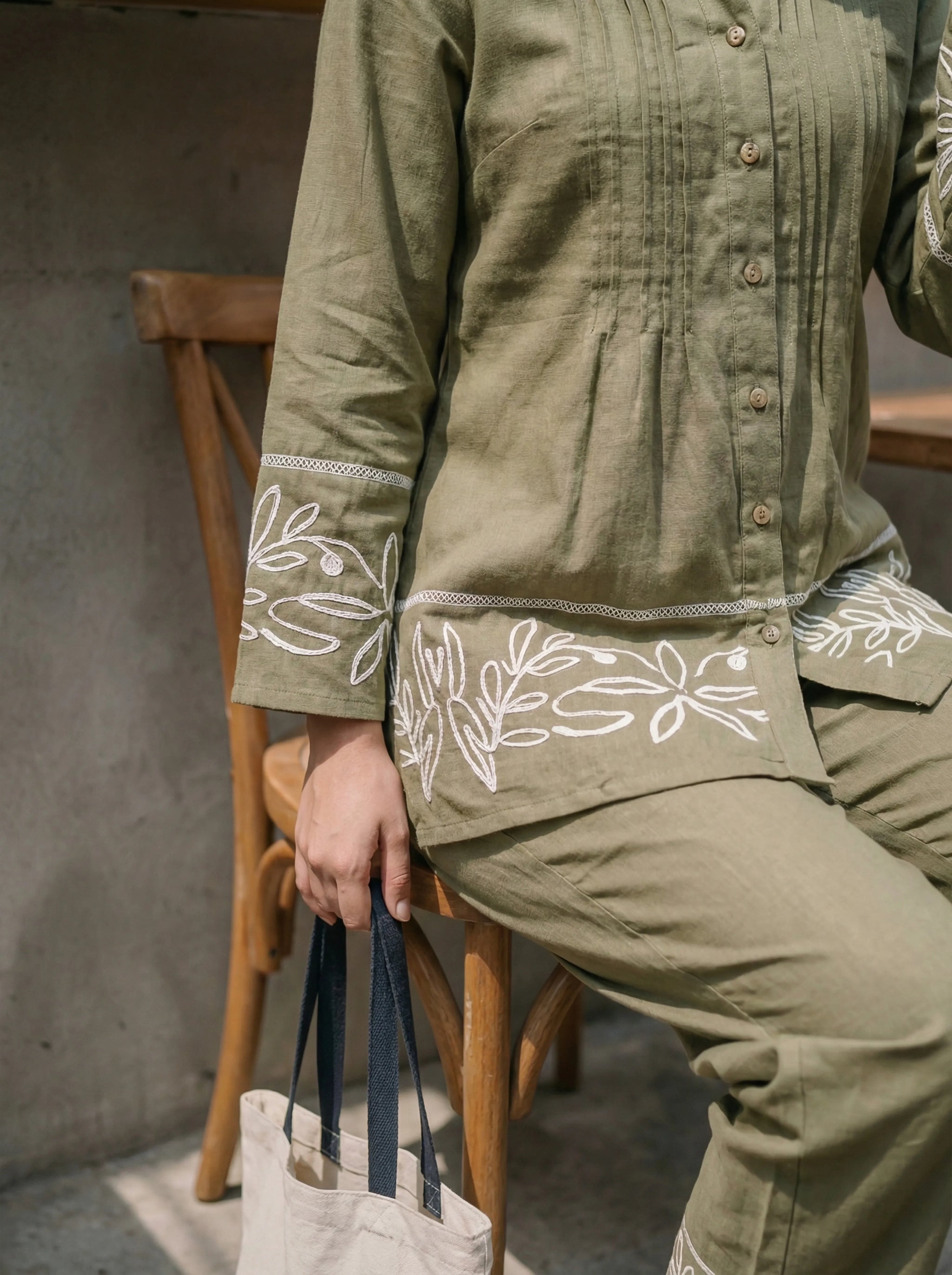 The top features a soothing sage green tone, elevated with delicate pintuck detailing along the front that adds texture and a tailored finish. Designed with a classic shirt collar and button-fastening front, it offers a clean, structured silhouette while remaining easy to wear. The full sleeves are highlighted with abstract thread embroidery at the cuffs, while the hemline carries coordinated embroidery that enhances the overall design with a soft handcrafted appeal.
