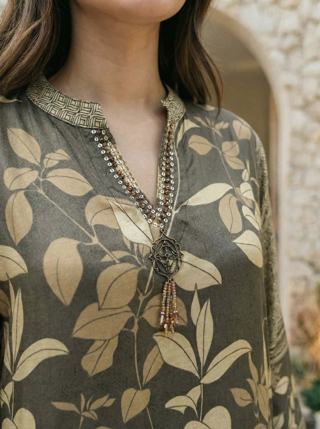 The top features a rich olive grey base adorned with leafy veil-inspired prints that flow seamlessly across the silhouette. Designed with a mandarin collar and a notch neckline, it is elevated with delicate embroidery and finished with metal embellishments and tassels that add a subtle festive accent. The 3/4 sleeves bring balance to the look, while the high-low hemline with beaded tassels creates movement and visual depth. Geometric patterns along the hem and back yoke in beige add contrast and a refined design finish.