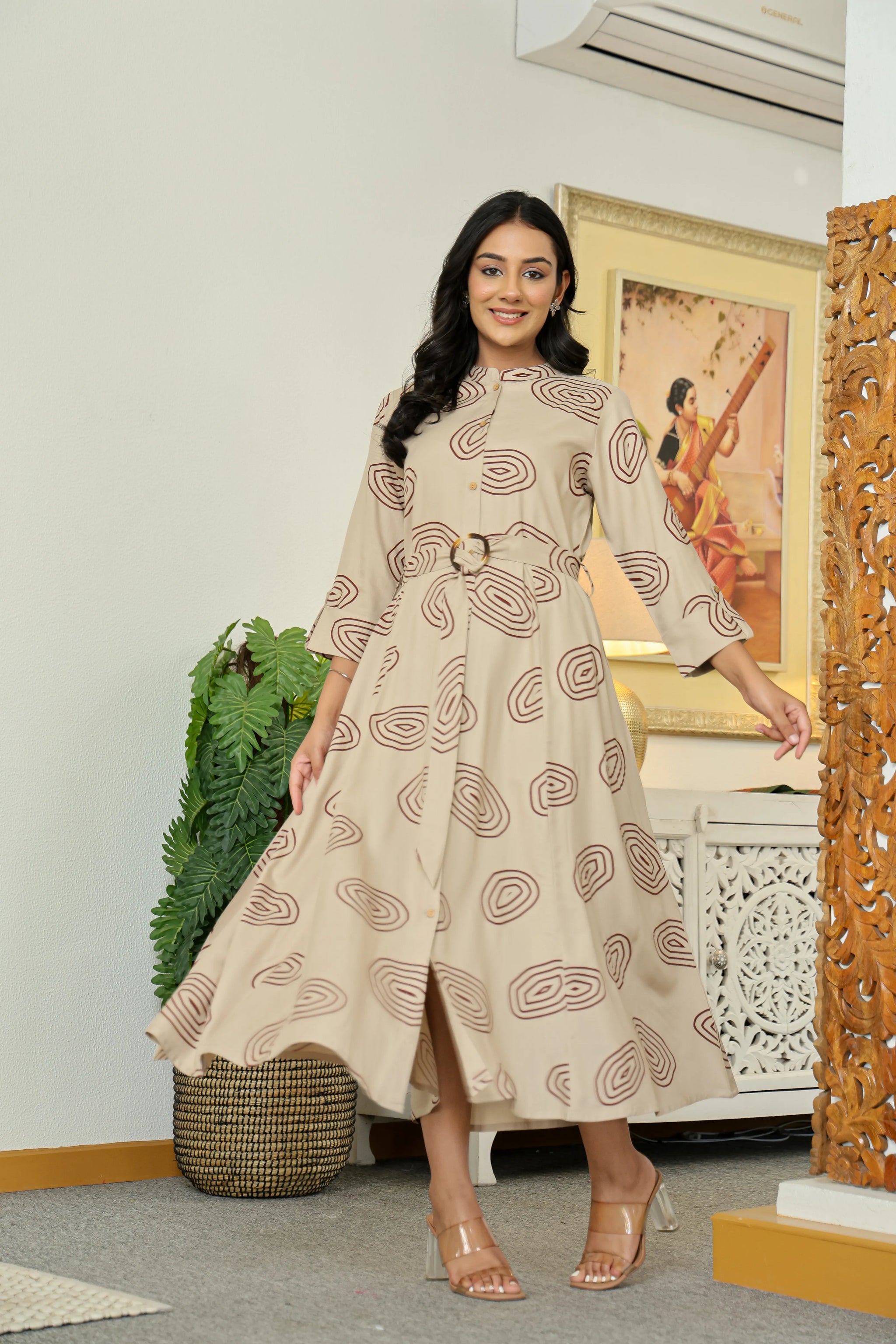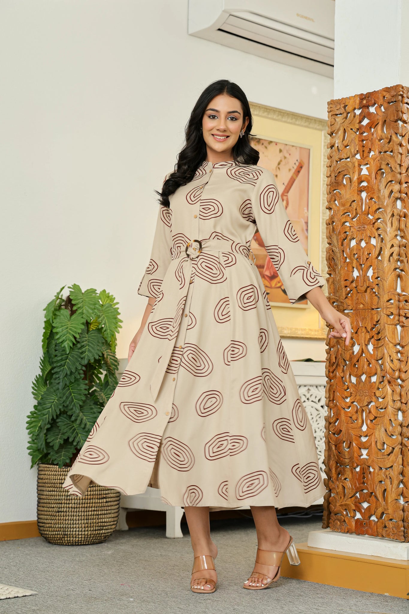 The design features a mandarin collar with button front detailing, lending a polished touch to the fluid silhouette. 3/4th sleeves balance comfort with elegance, while a waist belt with a circular buckle cinches the look, creating a flattering shape that moves effortlessly. Maroon geometric concentric prints add a modern yet earthy edge to the soothing stone-grey canvas, making this piece as versatile as it is striking.