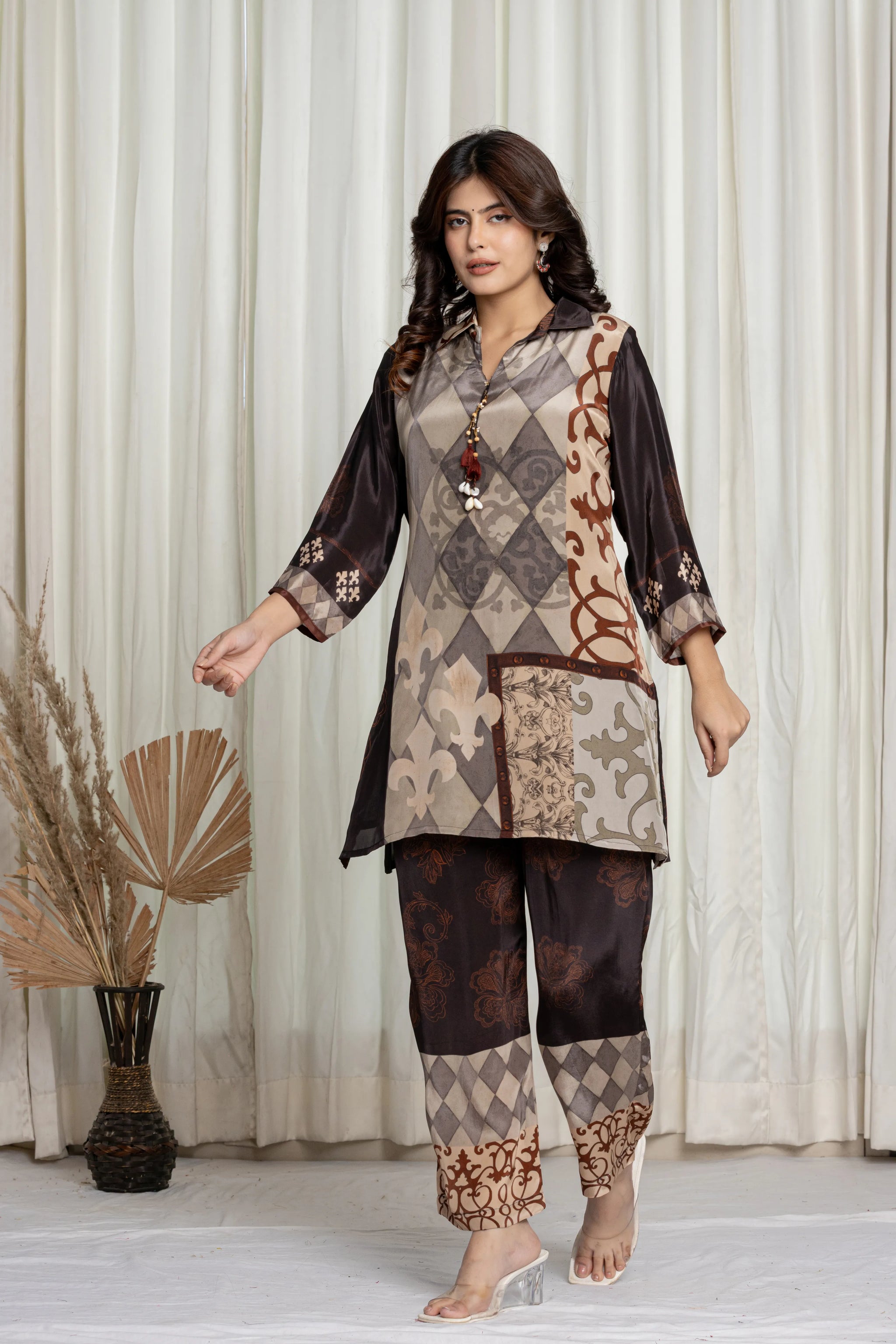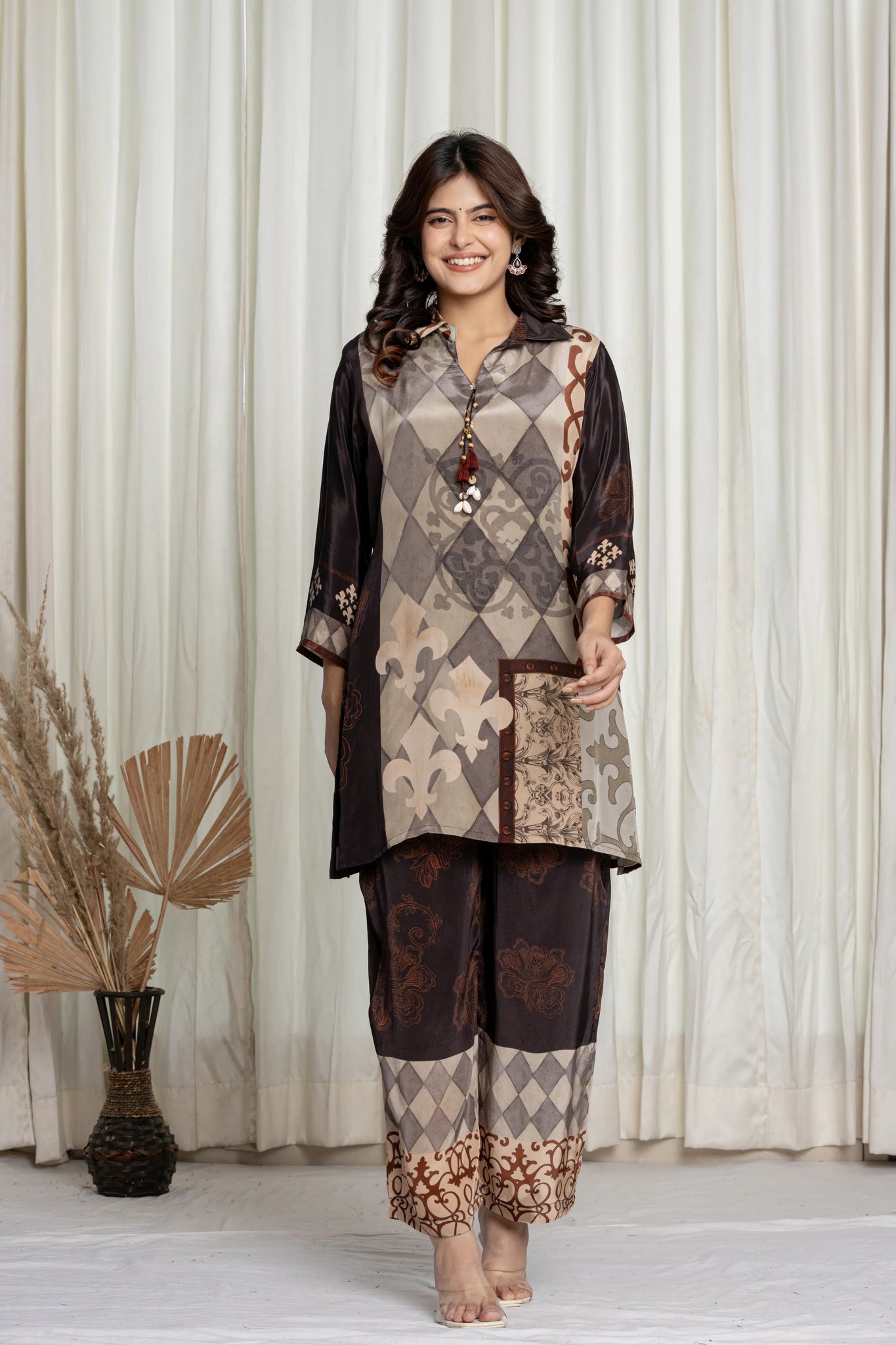 A palette dipped in royalty and grounded in earth — this deep brown, olive, and grey co-ord set is a visual medley of checks, florals, and baroque swirls. The shirt-collar top features 3/4th sleeves and striking tassel detailing with cowrie shells for a touch of boho-luxe. Paired with straight pants showcasing patchwork-style border motifs and an elasticated waistband, this set is your go-to for elegant comfort and effortless statement dressing.