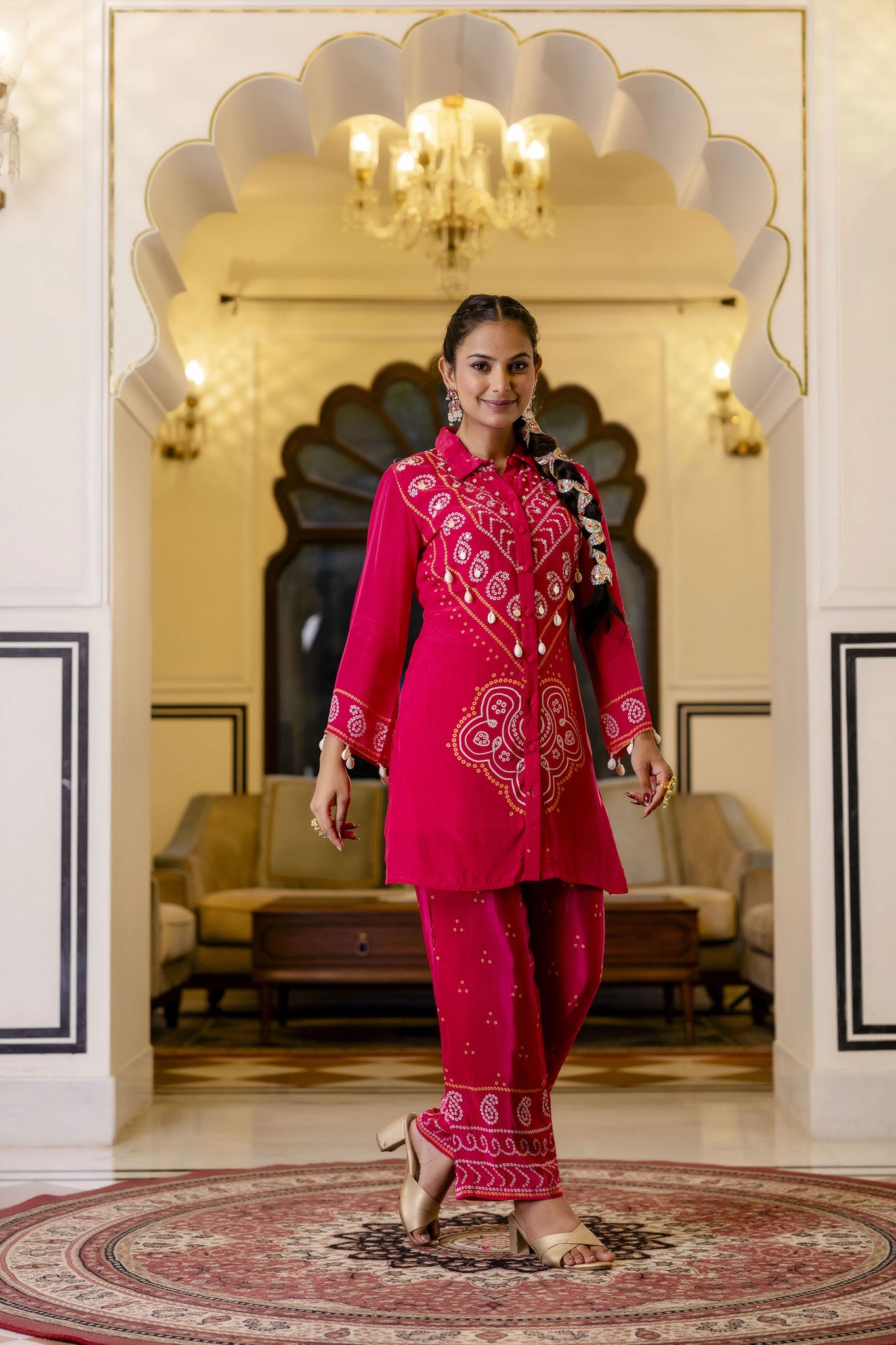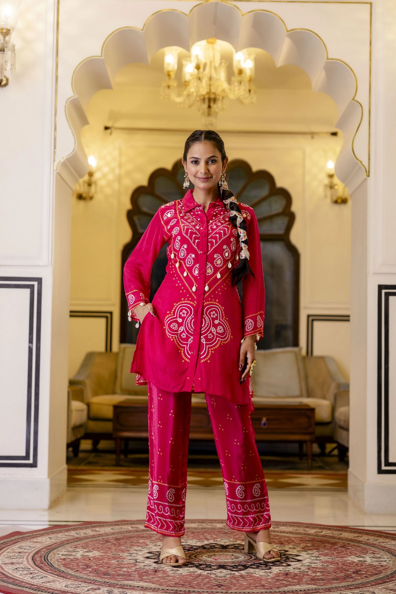 A celebration of tradition wrapped in a contemporary silhouette—this raspberry pink coord set is a festive wardrobe must-have. The shirt-style top features an elegant collar, 3/4th sleeves, and is beautifully adorned with traditional Bandhani print. Intricate real mirror embroidery dances across the front panel and cuffs, complemented by handcrafted kawri shell embellishments for an artisanal finish. Paired with matching straight-fit pants featuring an elasticated waist and all-over Bandhani motifs, this set is designed for those who love culture with a modern twist.
