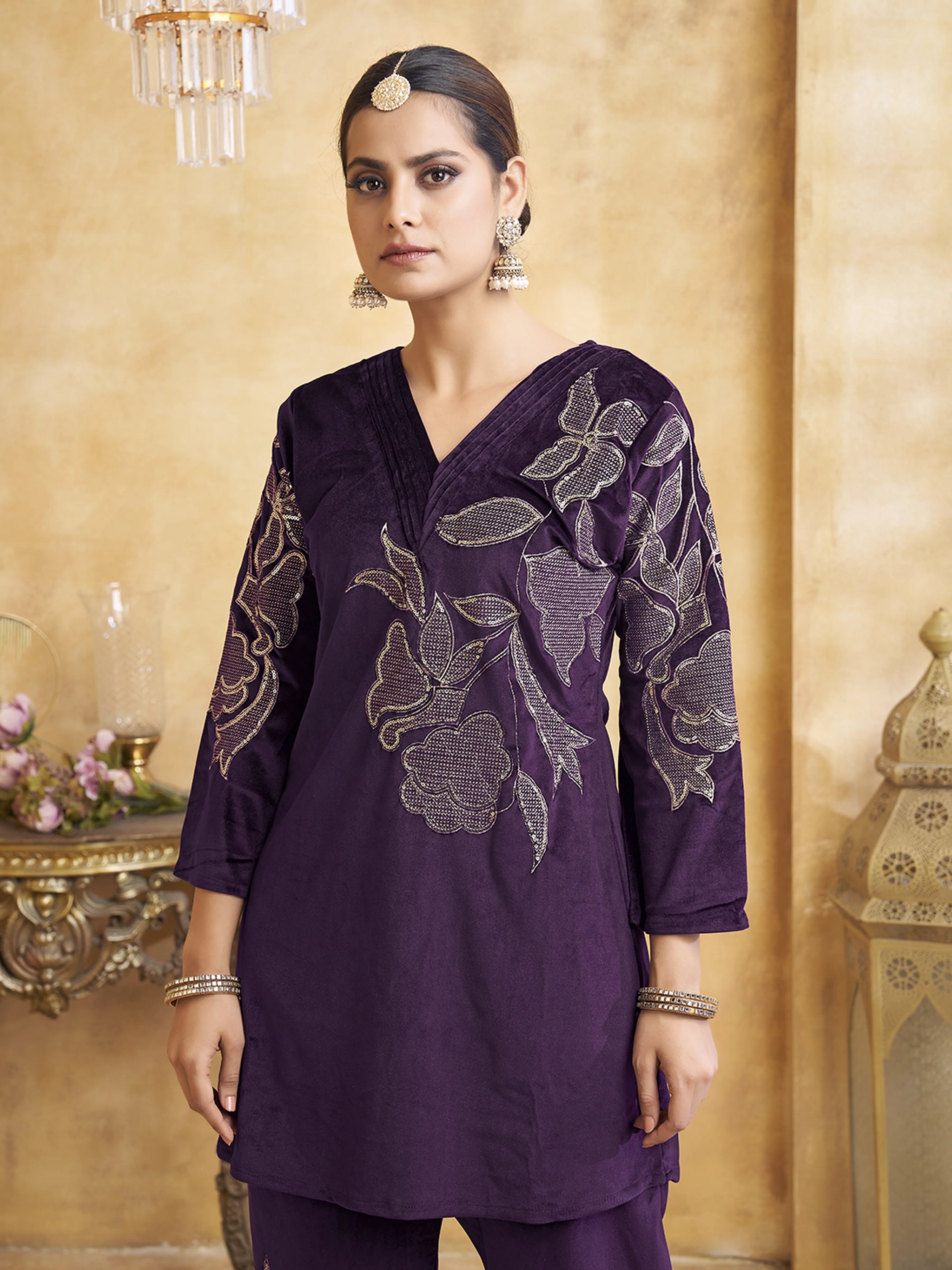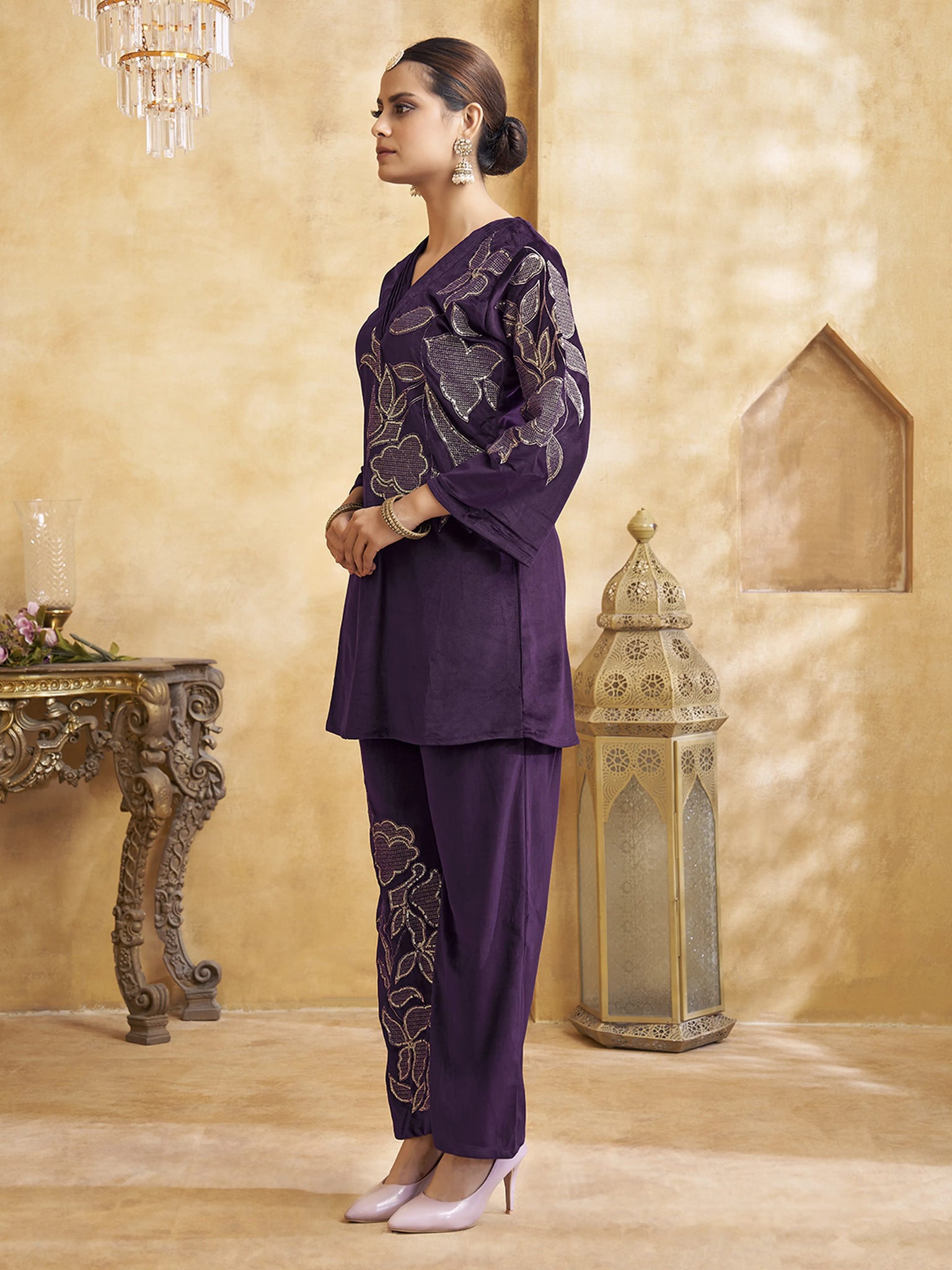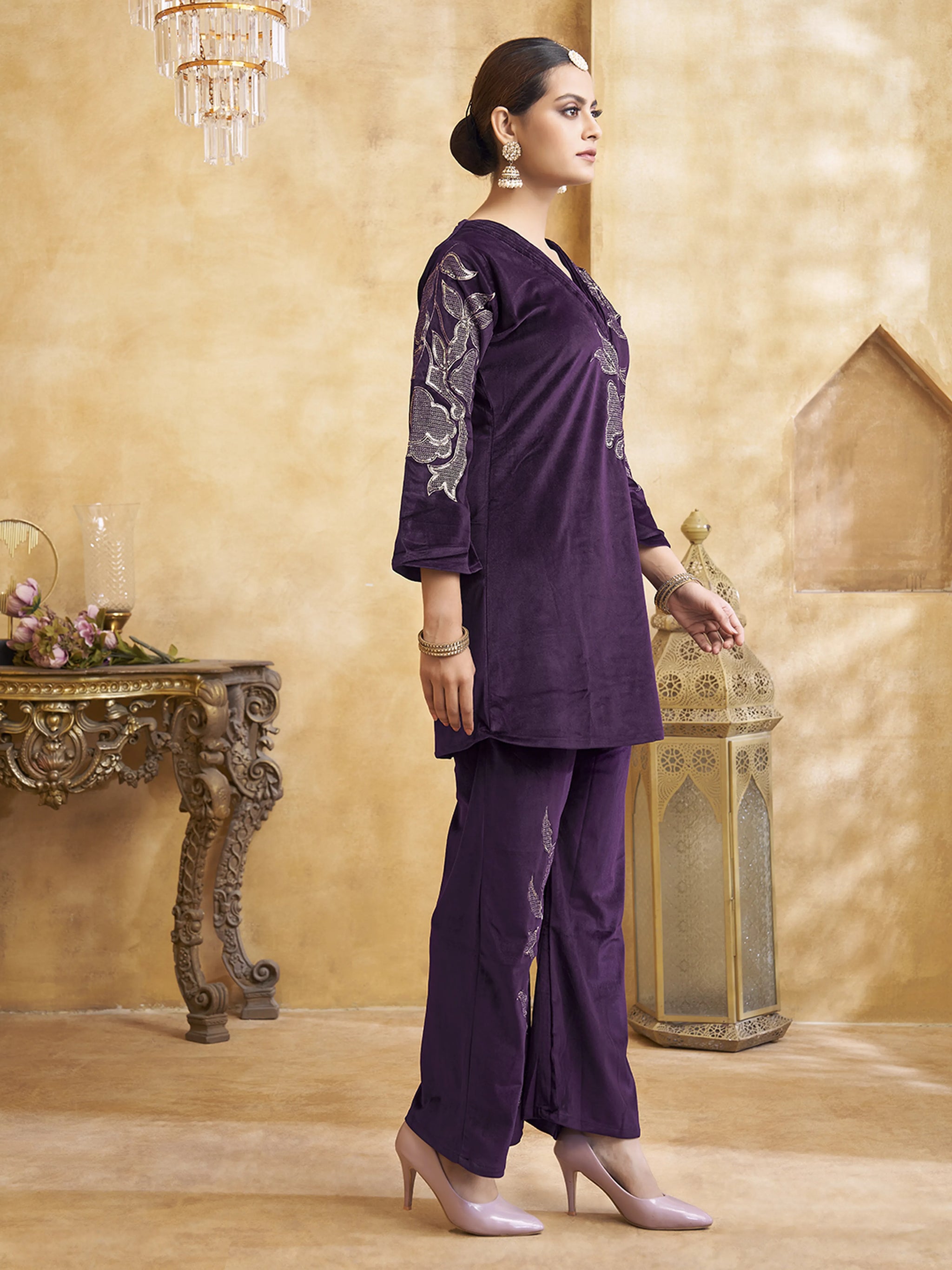 Velvet Floral Embroidered Co-ord Set in Dark Purple