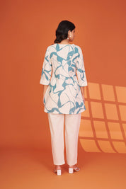 Infused with the serenity of sea breezes and soft silhouettes, Ocean Whimsy is a mood-lifting co-ord set that brings comfort and creativity together. Designed in a breathable cotton flex fabric, this cream base ensemble features a pale blue abstract print, brought to life with delicate blanket stitching and light sequin highlights.