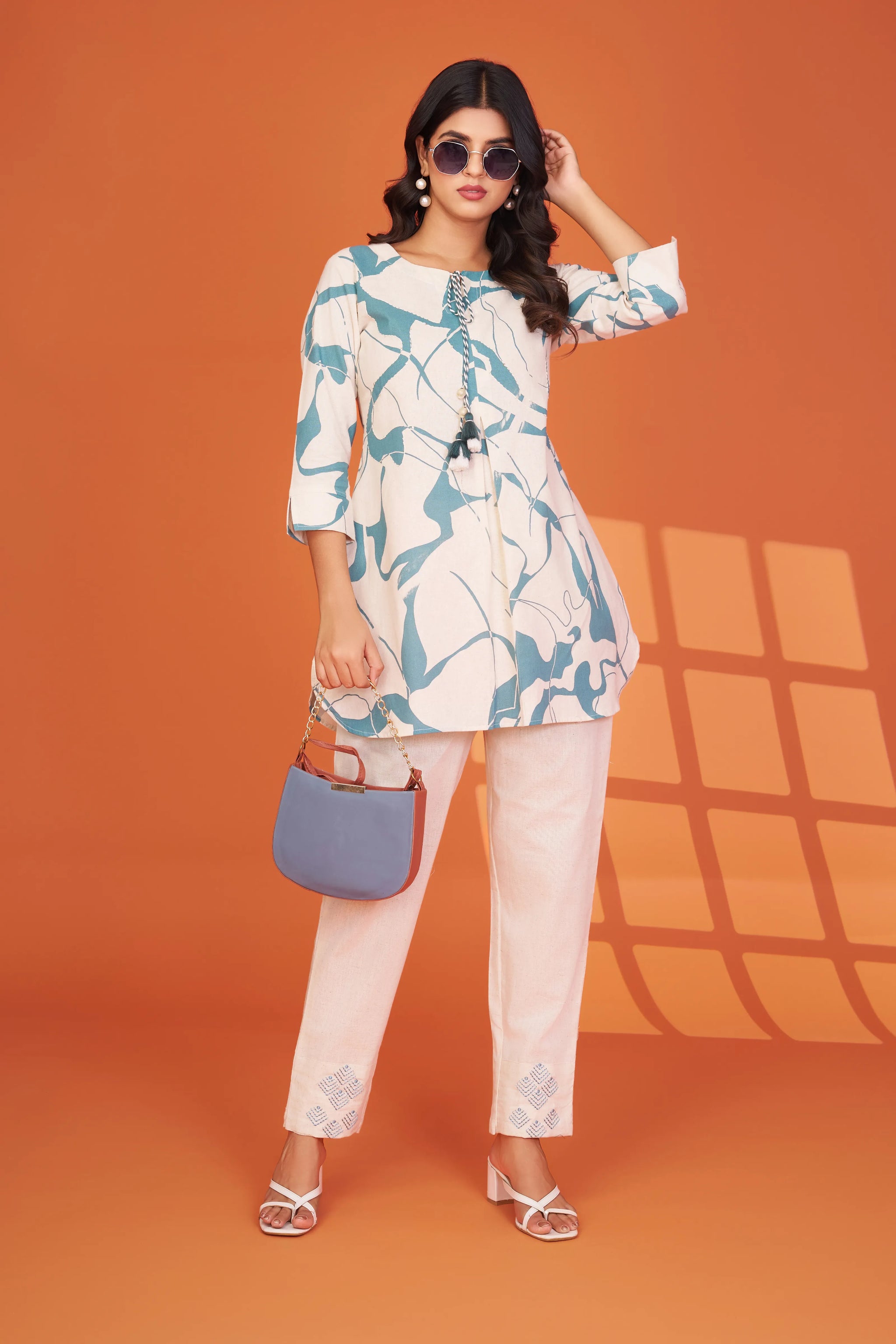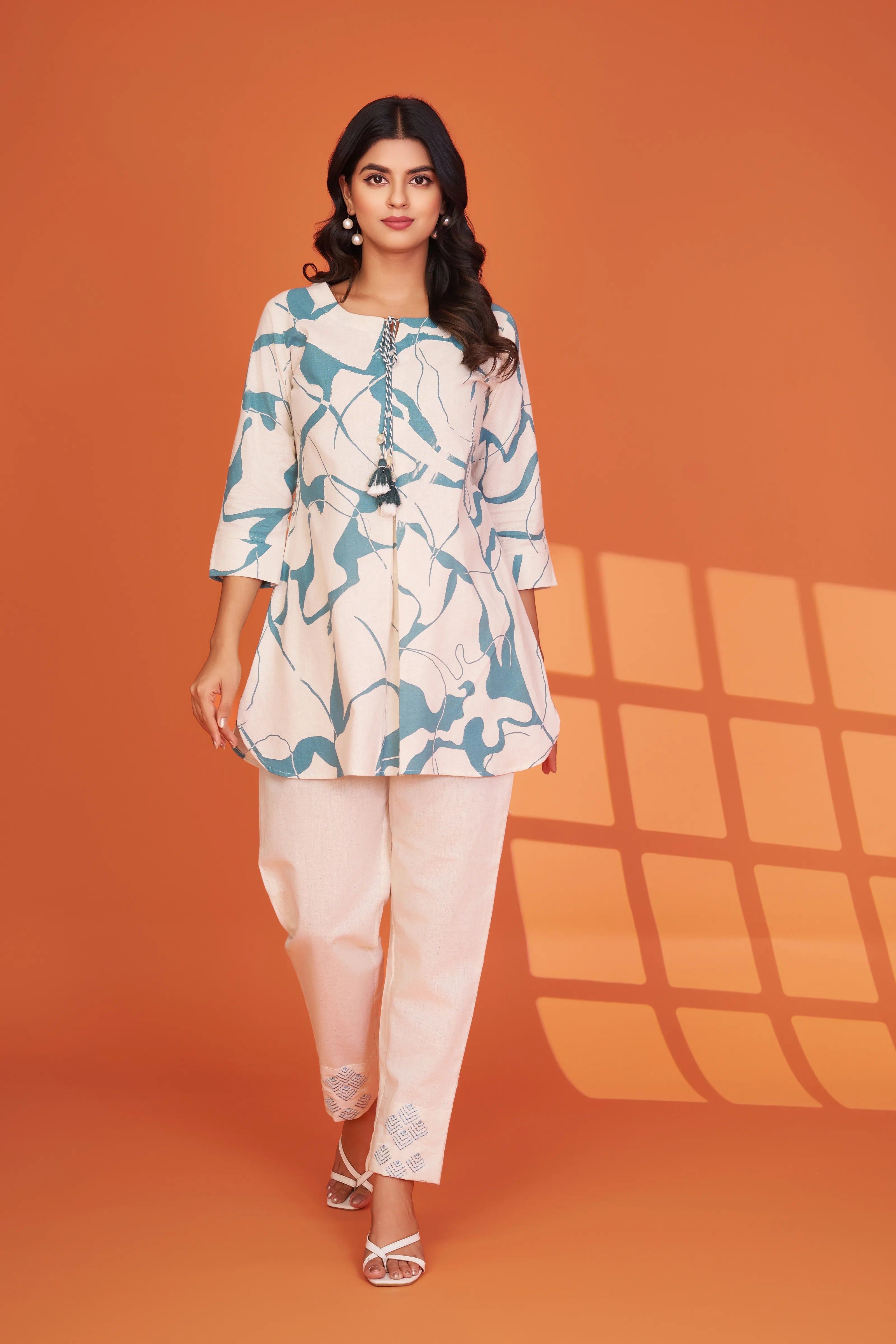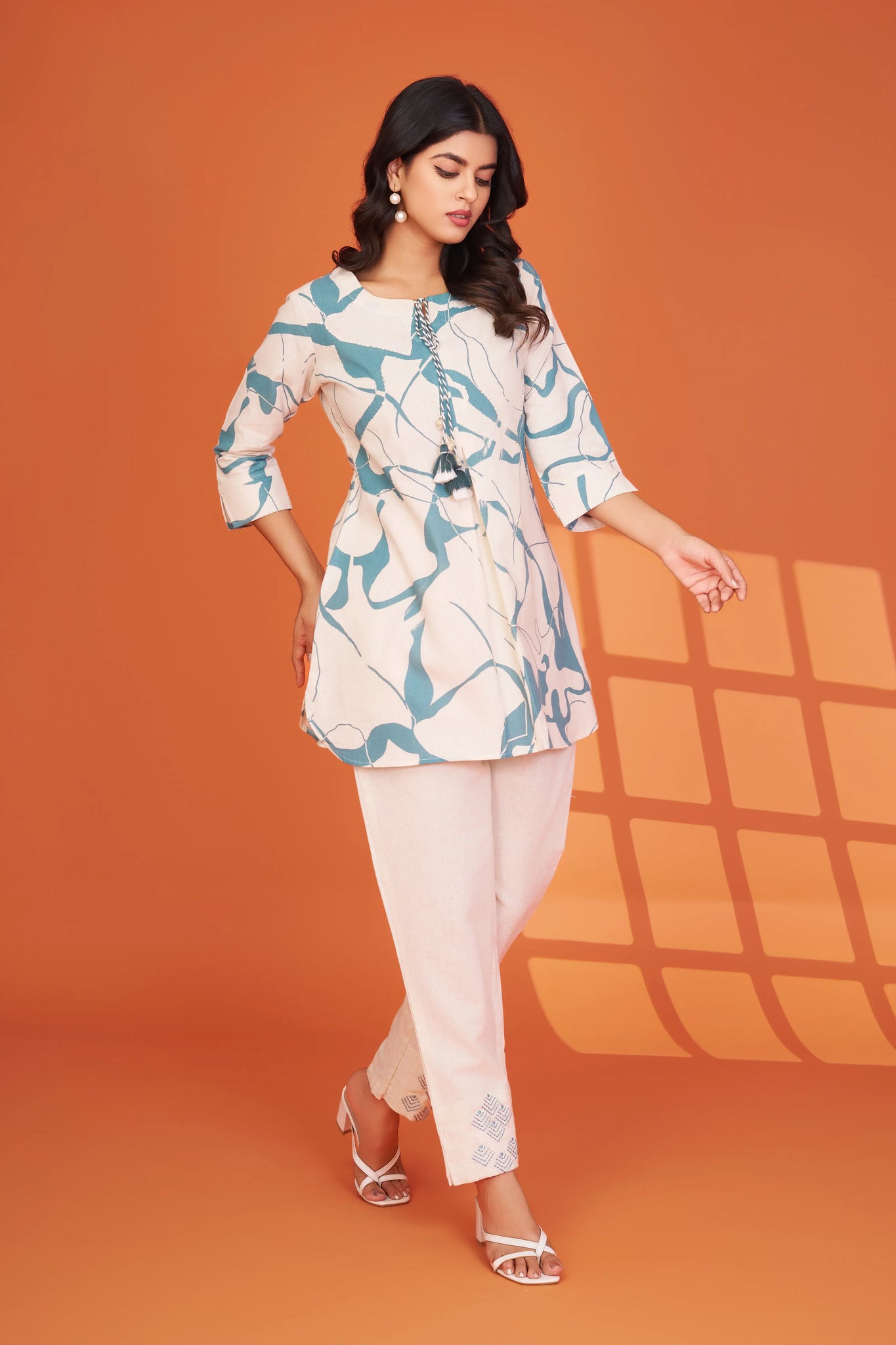 Cream & Pale Blue Abstract Cotton Flex Co-ord Set