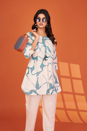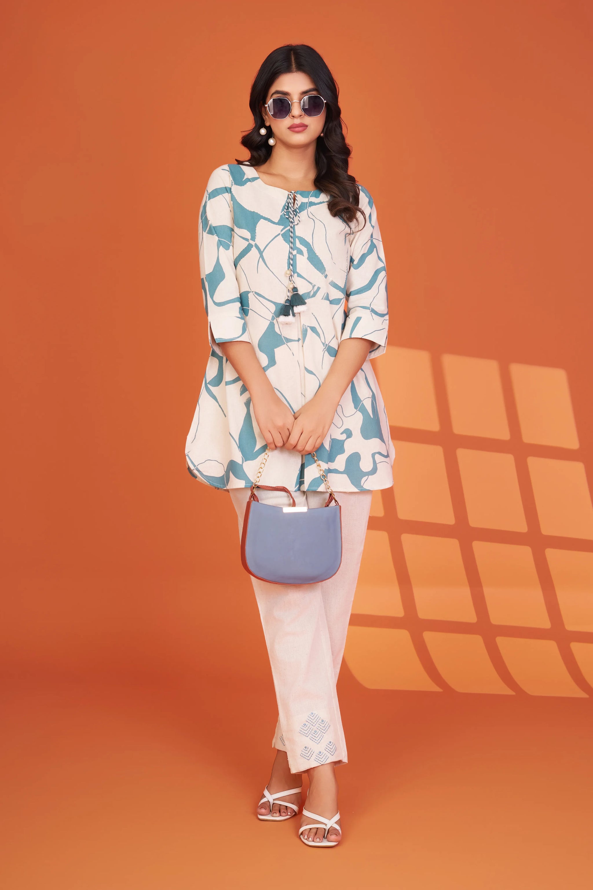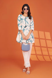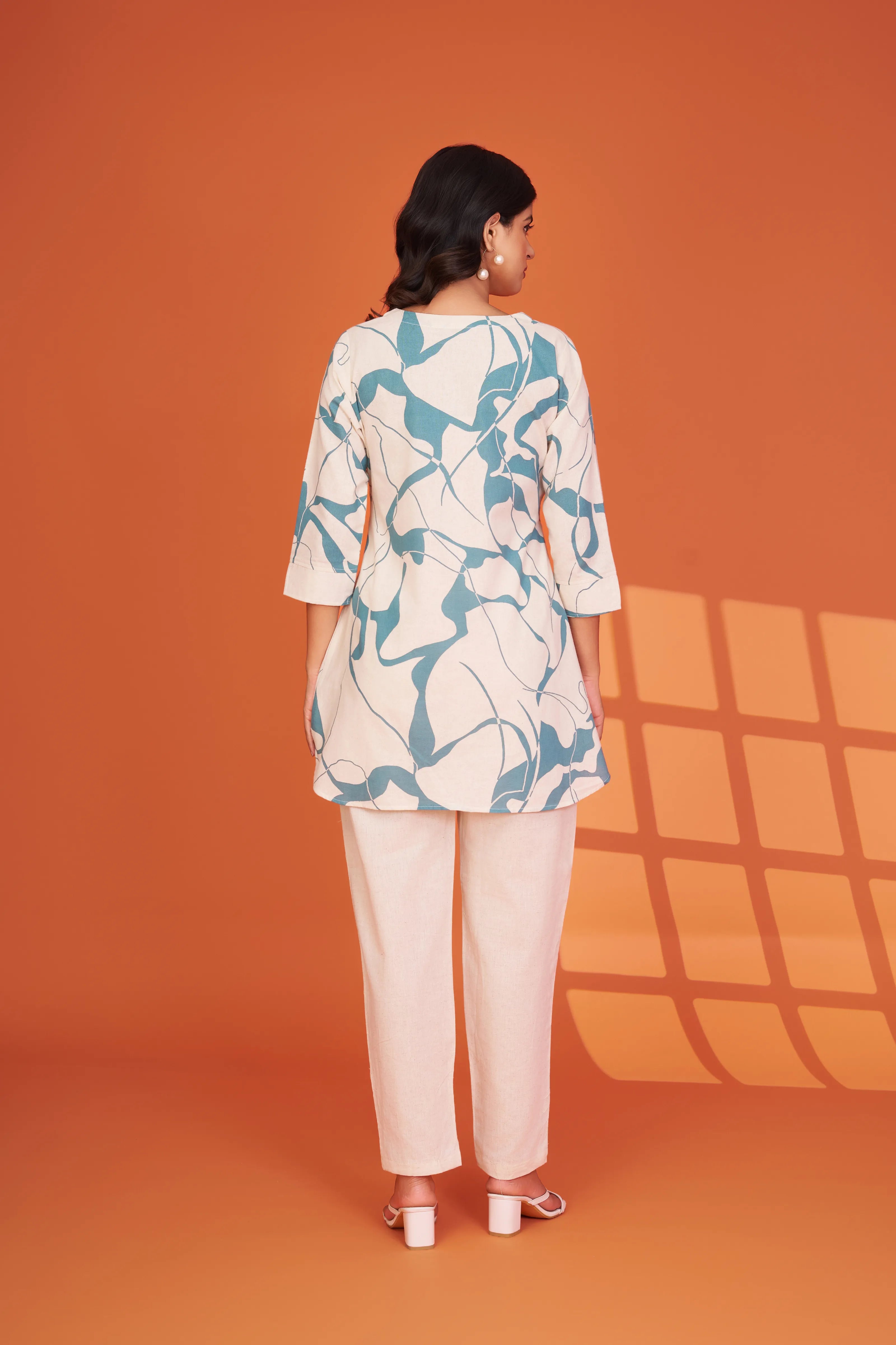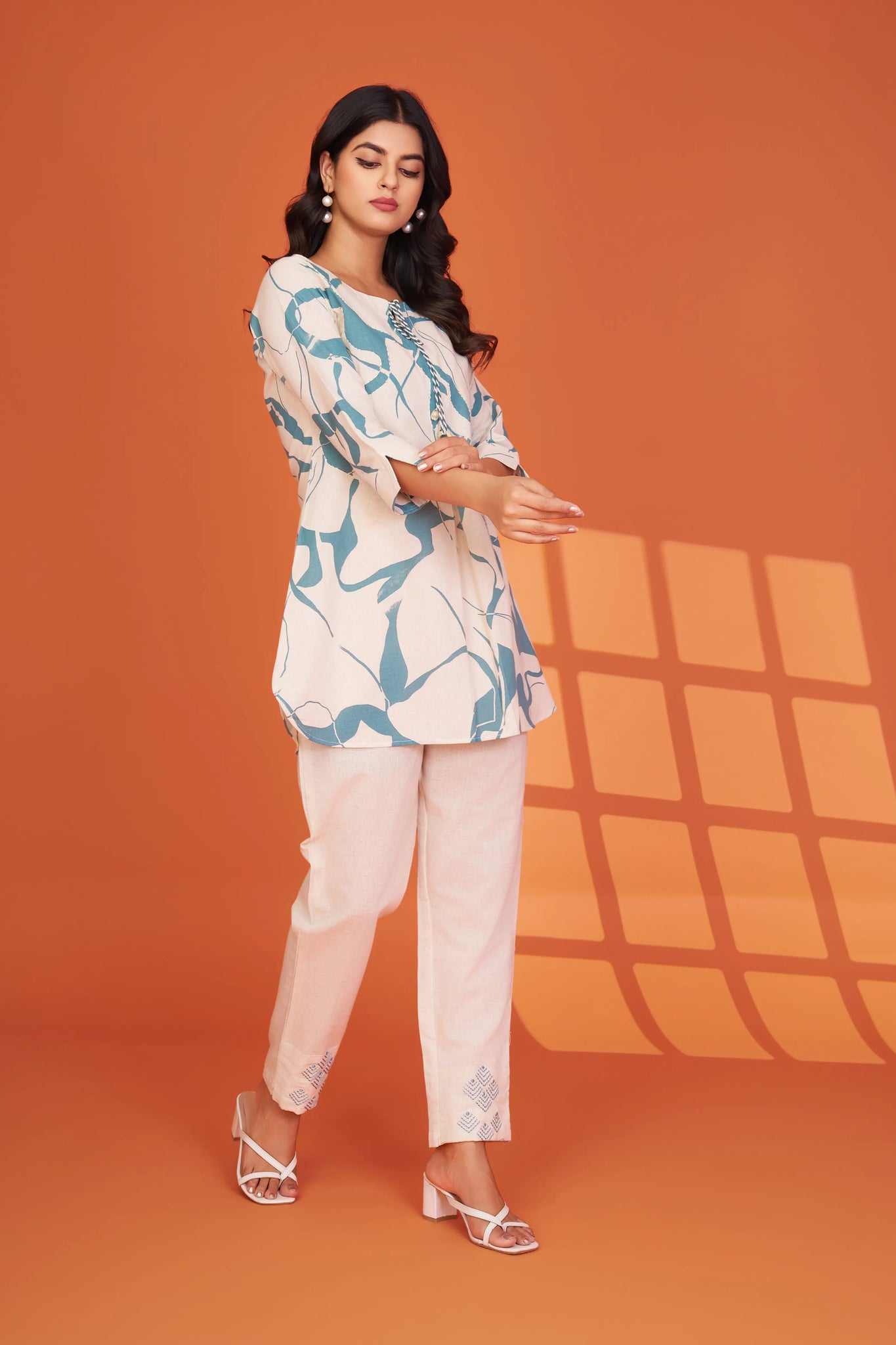 Cream & Pale Blue Abstract Cotton Flex Co-ord Set
