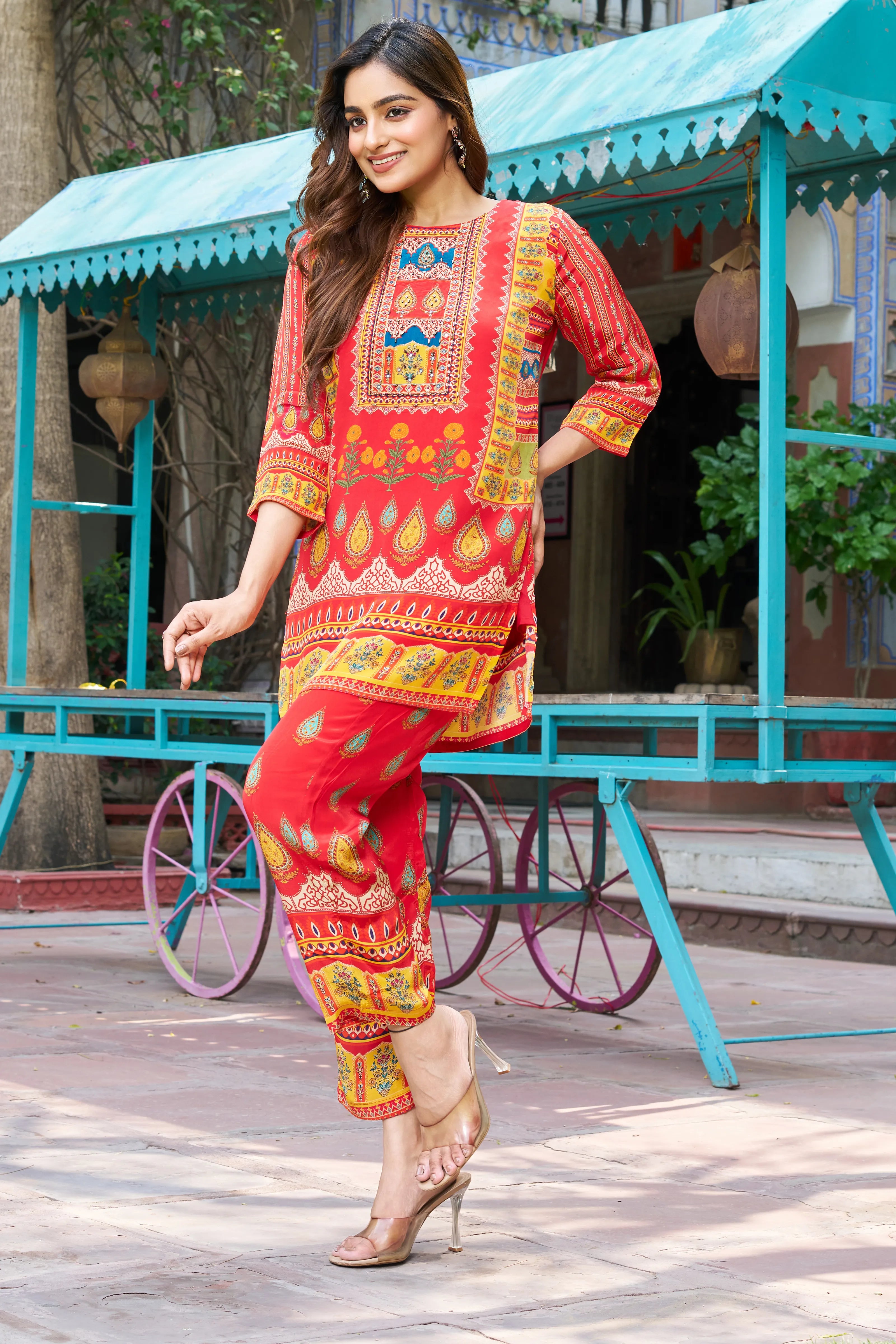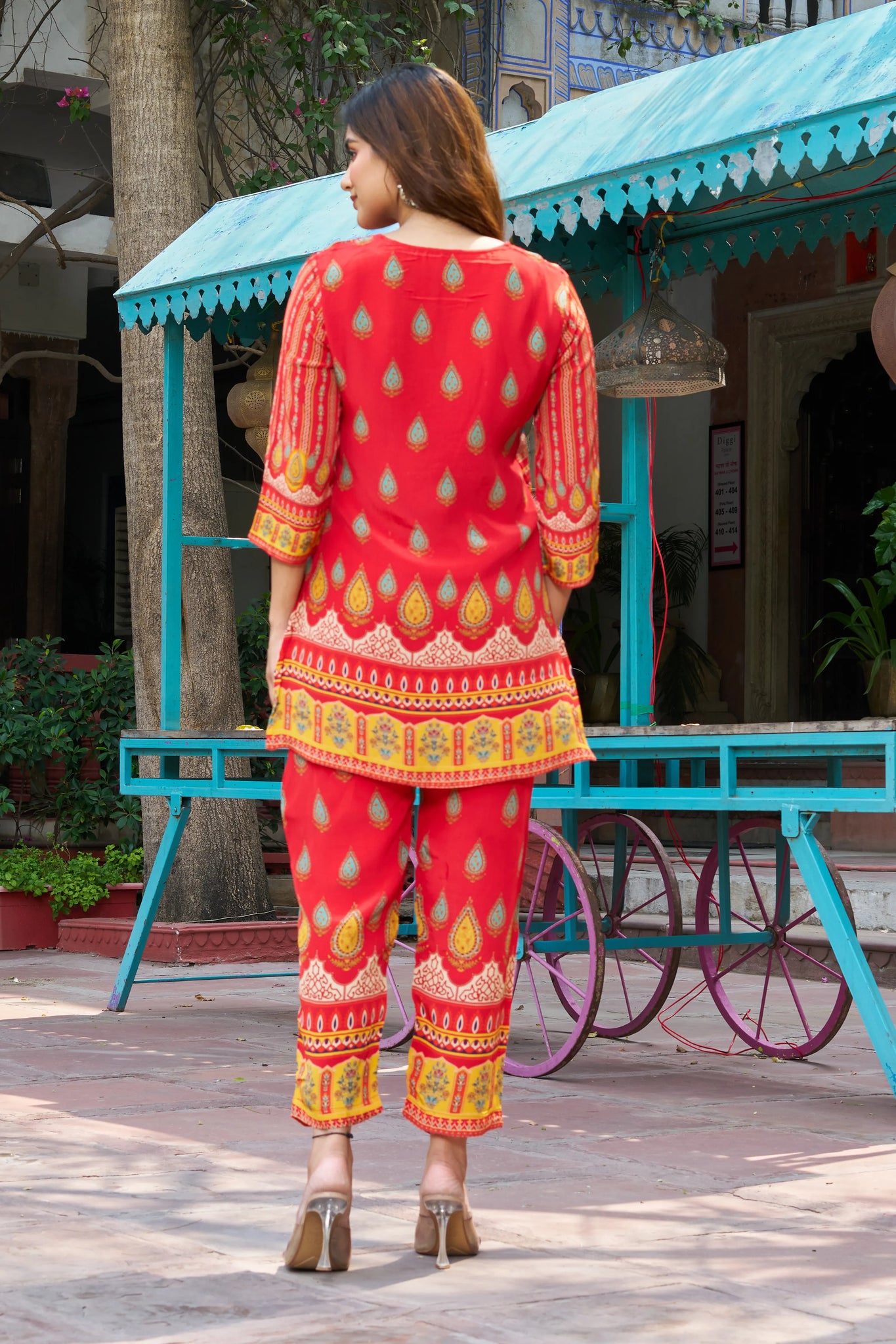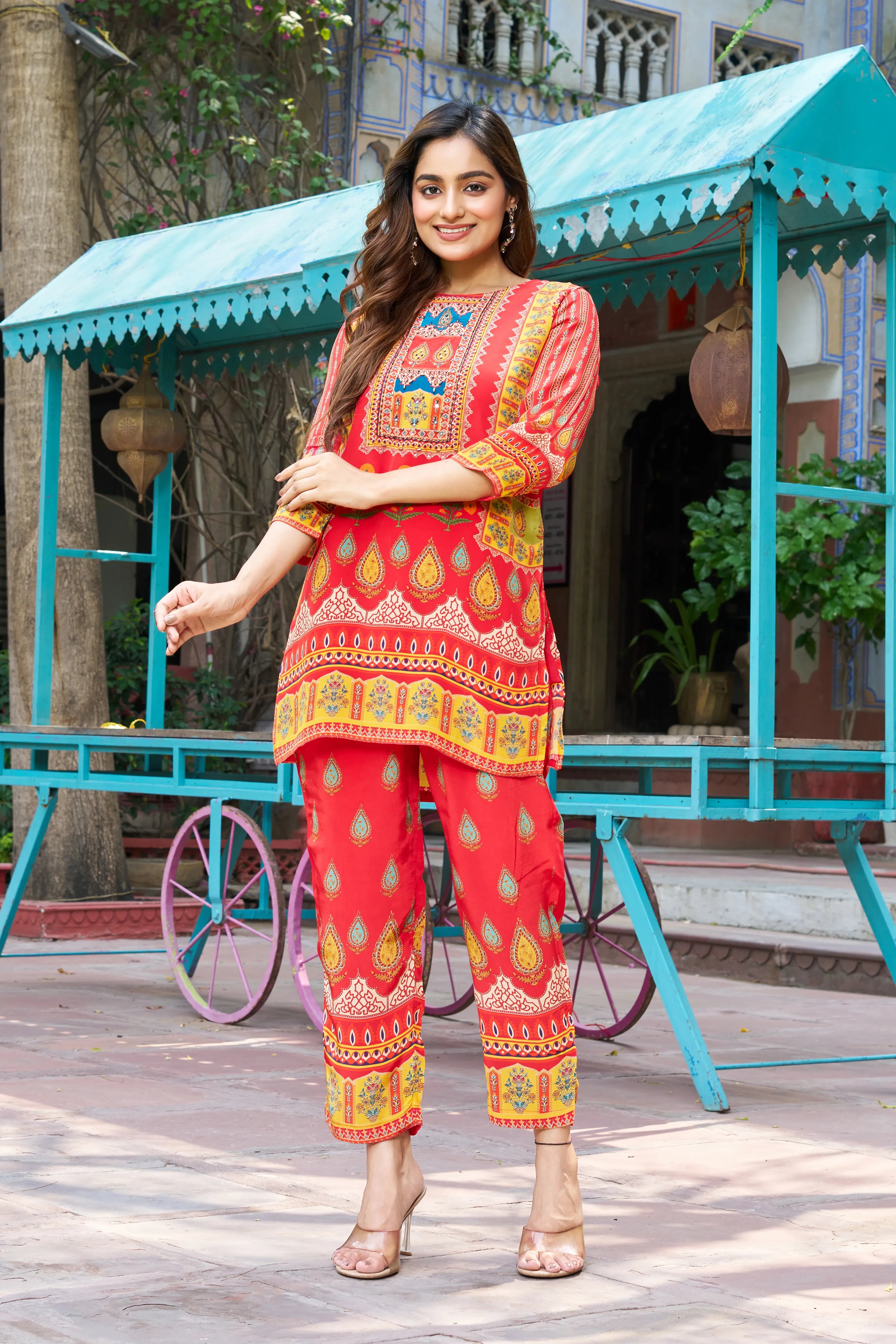 Festive Bloom: Red Multicolor Printed & Embellished Co-ord Set in Crepe