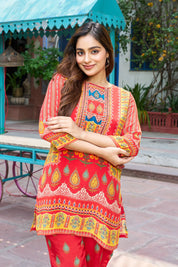 Infuse your wardrobe with celebration-ready charm through the Festive Bloom co-ord set. Drenched in a vibrant red hue, this ensemble brings alive the beauty of traditional Indian art with multicolor folk-inspired motifs, intricate bead detailing, and subtle mirror accents that shimmer with every step.