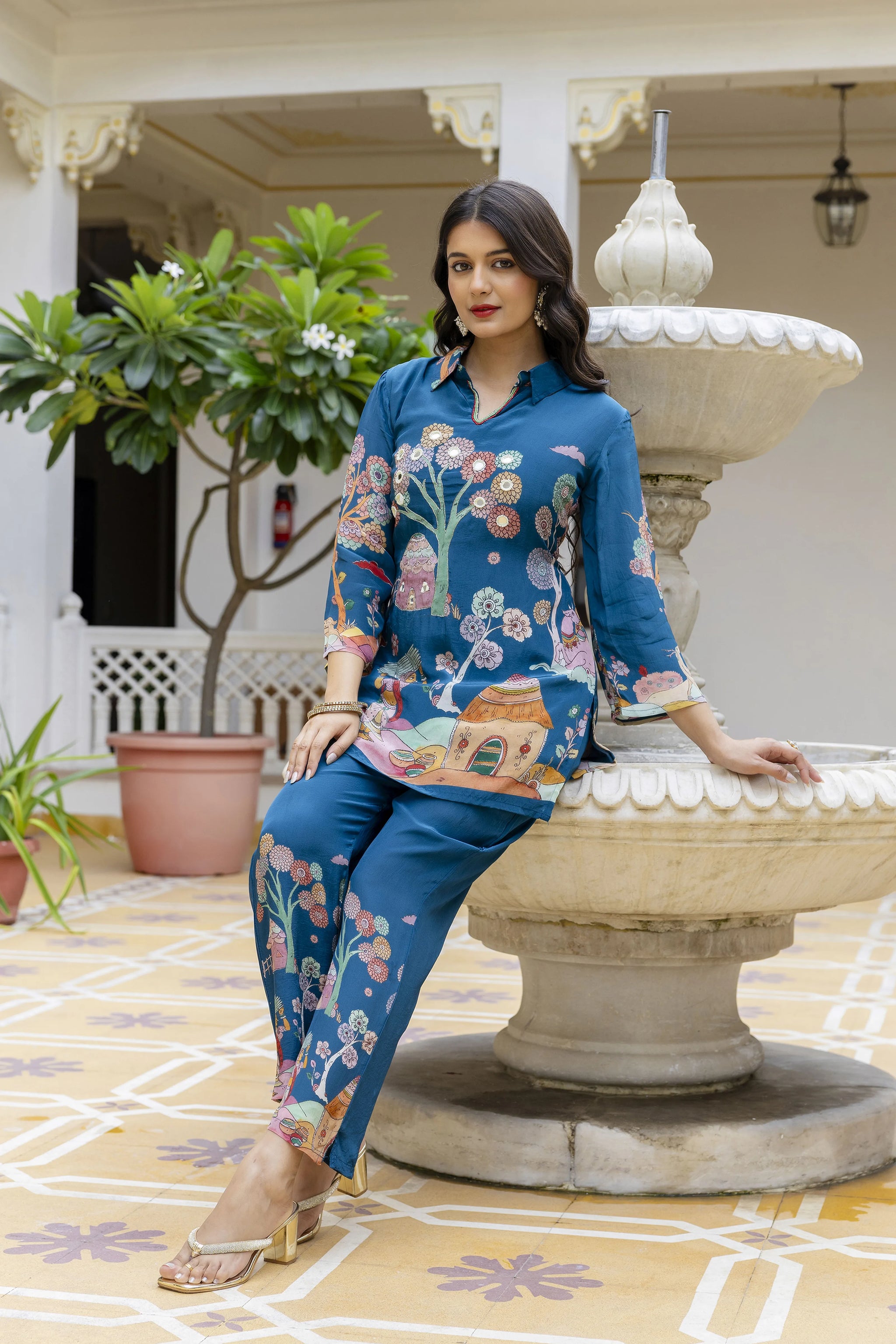 Step into heritage-inspired elegance with Peacock Village, a vibrant peacock blue kurti set crafted in flowy crepe fabric. The top features a shirt collar and 3/4th sleeves, enhanced with beaded detailing around the neckline and mirror embroidery for a touch of festive sparkle. The highlight is its village story placement print, weaving charm and culture into the design. Paired with printed pants with an elasticated waist, this set balances comfort with artistry.