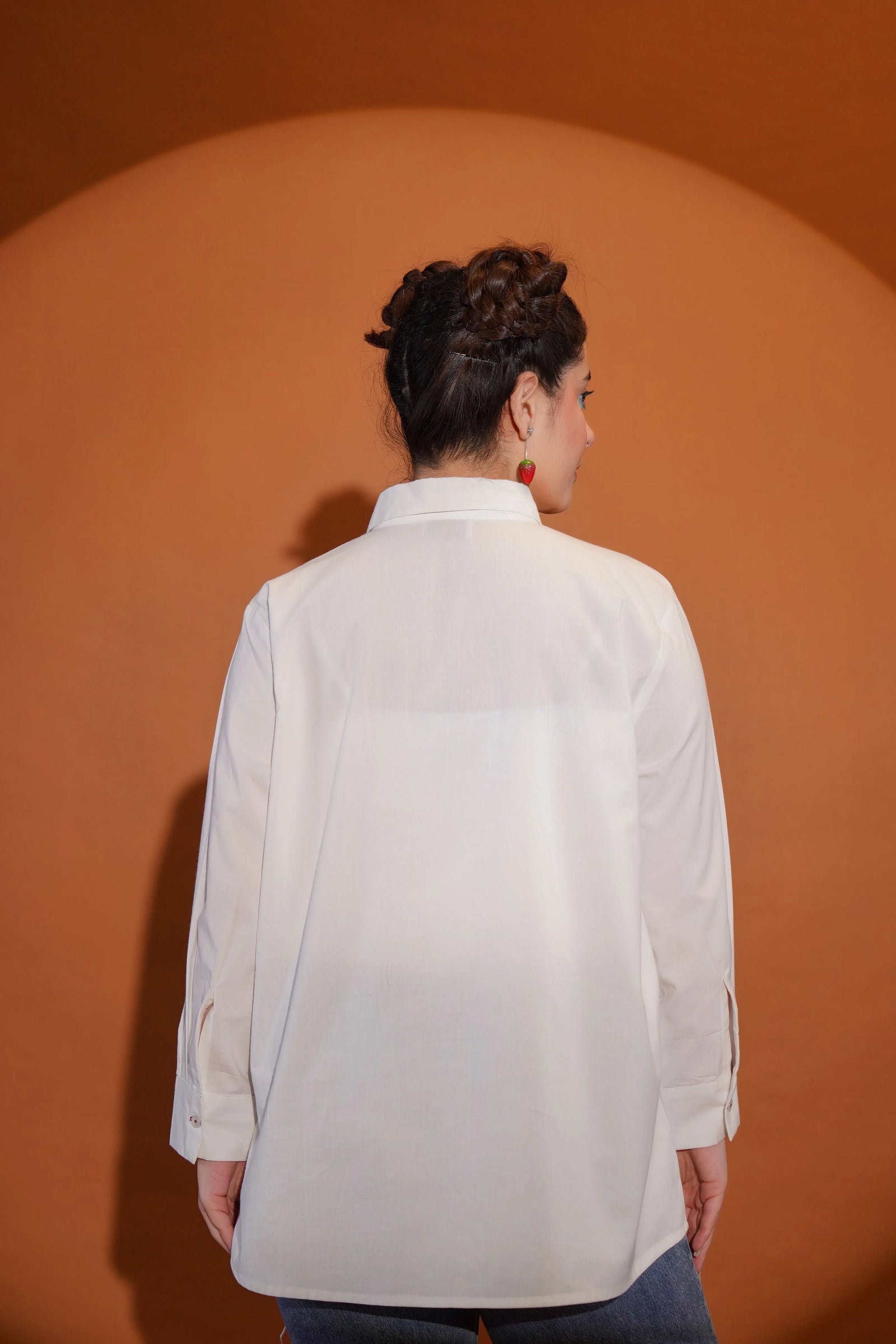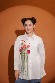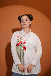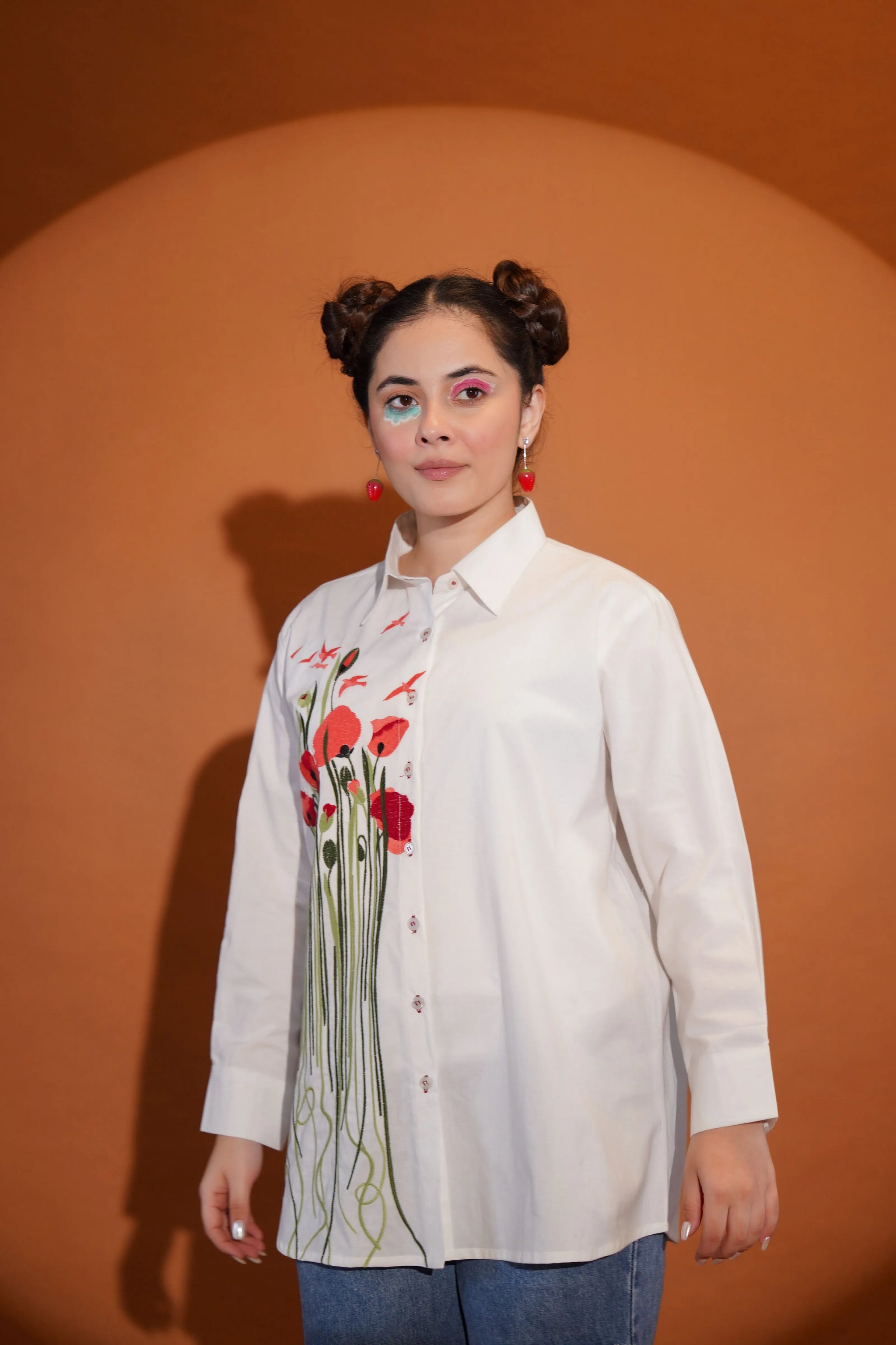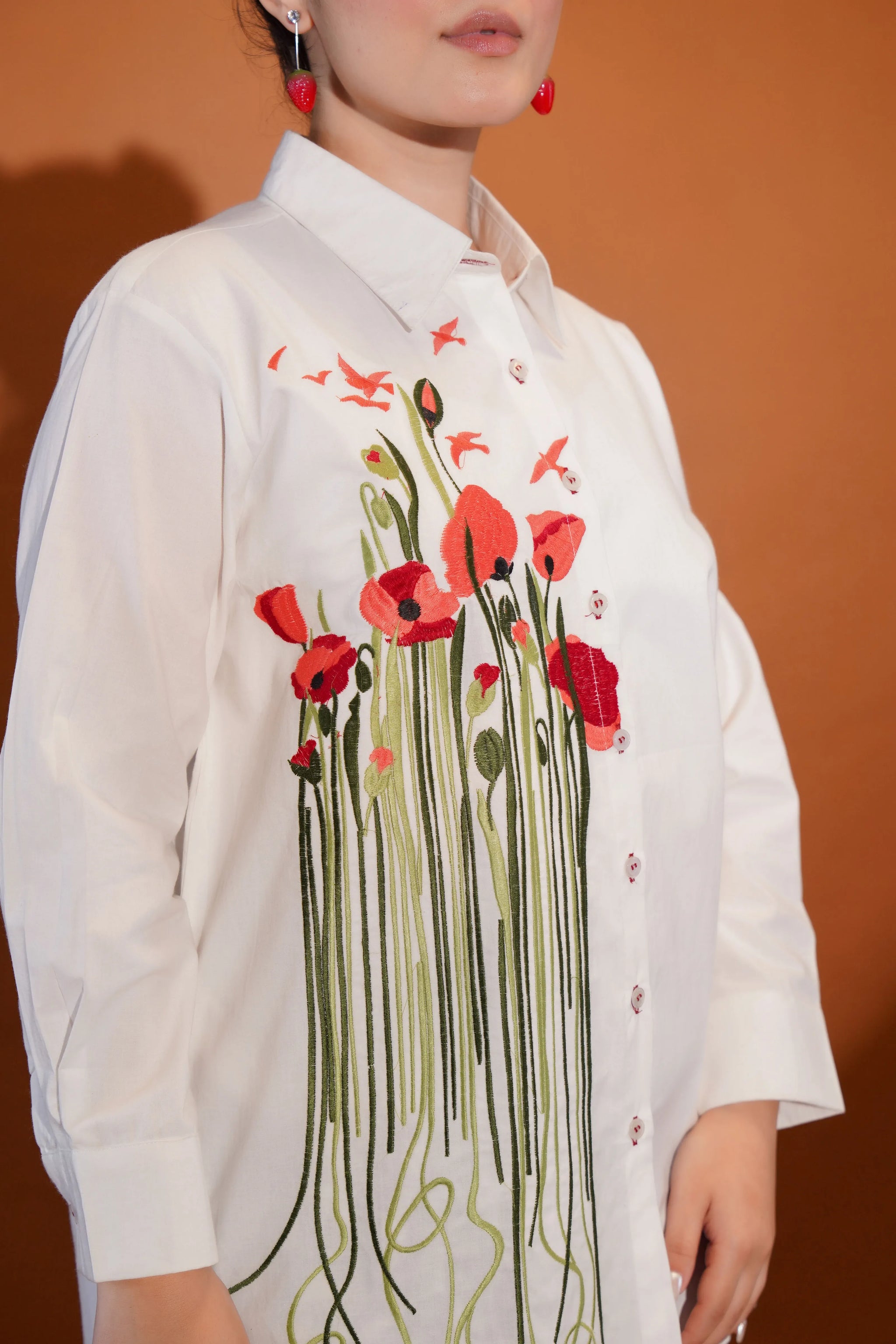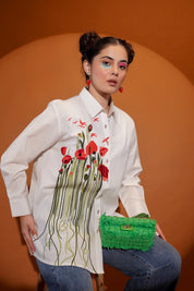 Infuse your wardrobe with the joyful spirit of Wild Bloom—a contemporary white cotton poplin shirt adorned with vibrant floral and leaf embroidery that climbs playfully across the front. Designed for bold yet breezy looks, this piece effortlessly fuses artistic charm with structured tailoring.