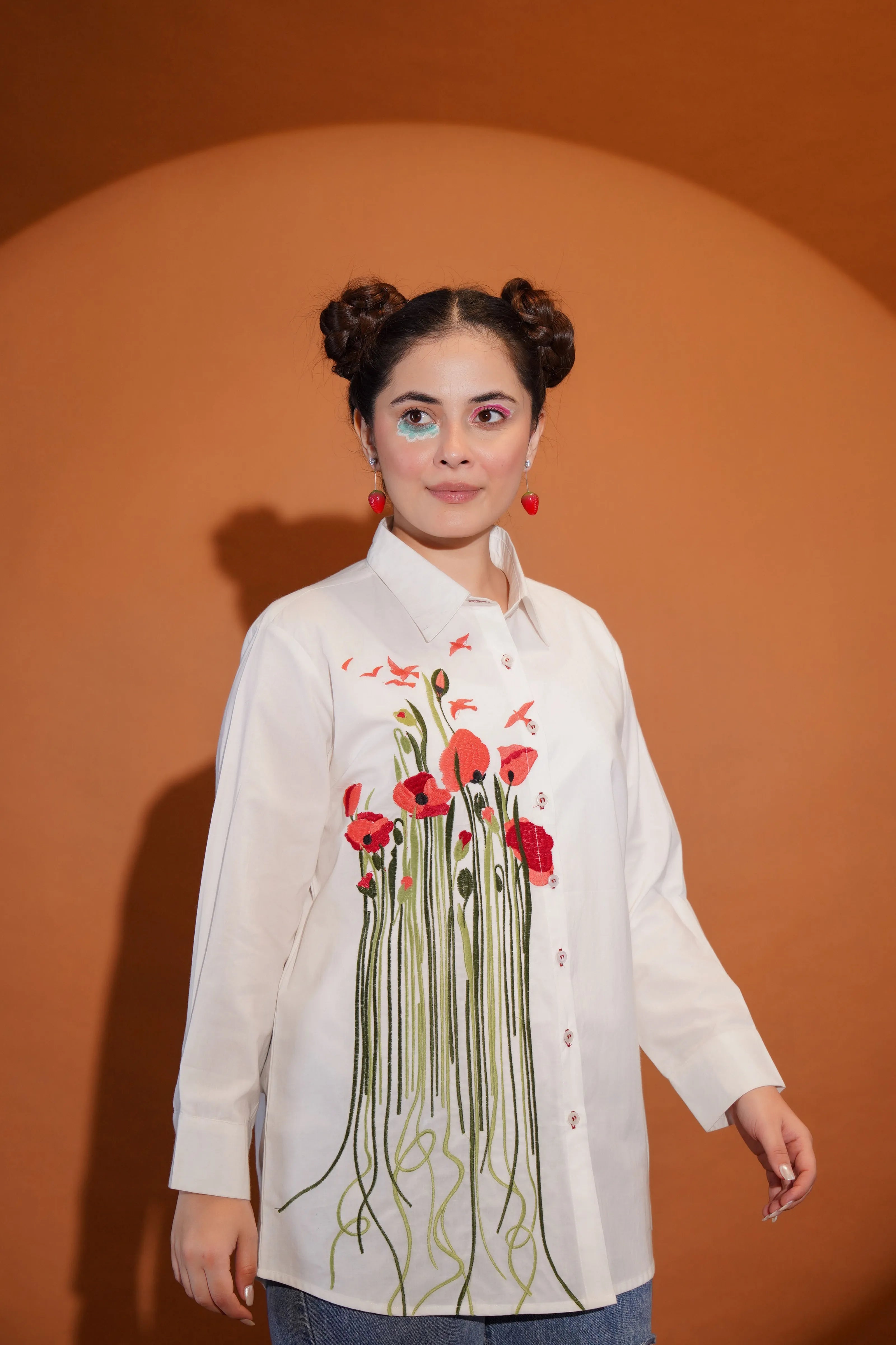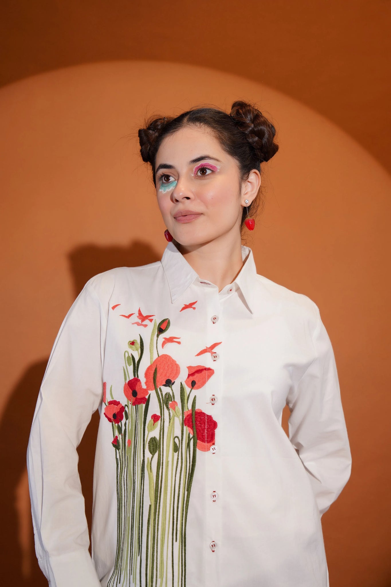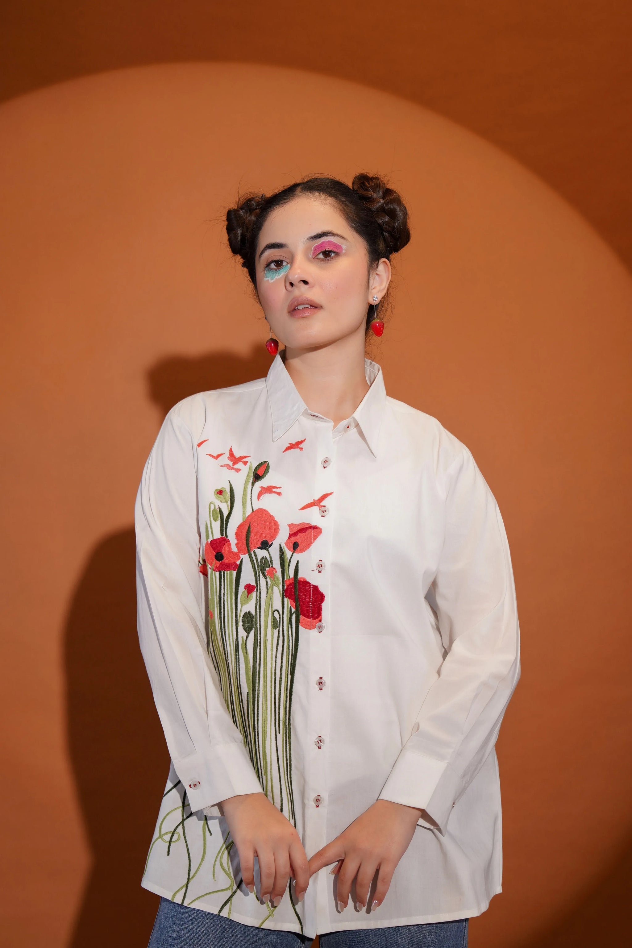 Wild Bloom: White Shirt with Multicolour Floral Embroidery in Cotton Poplin