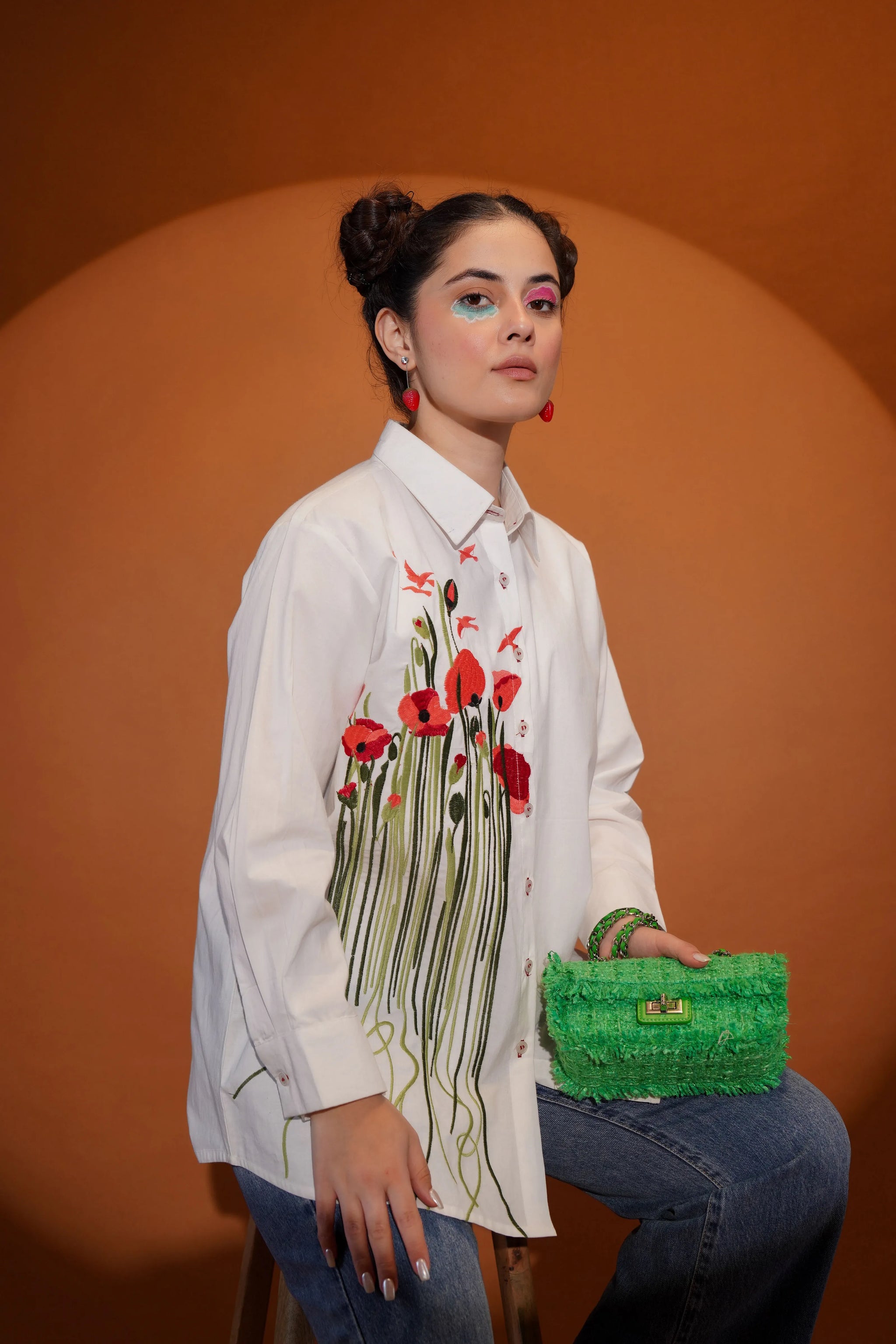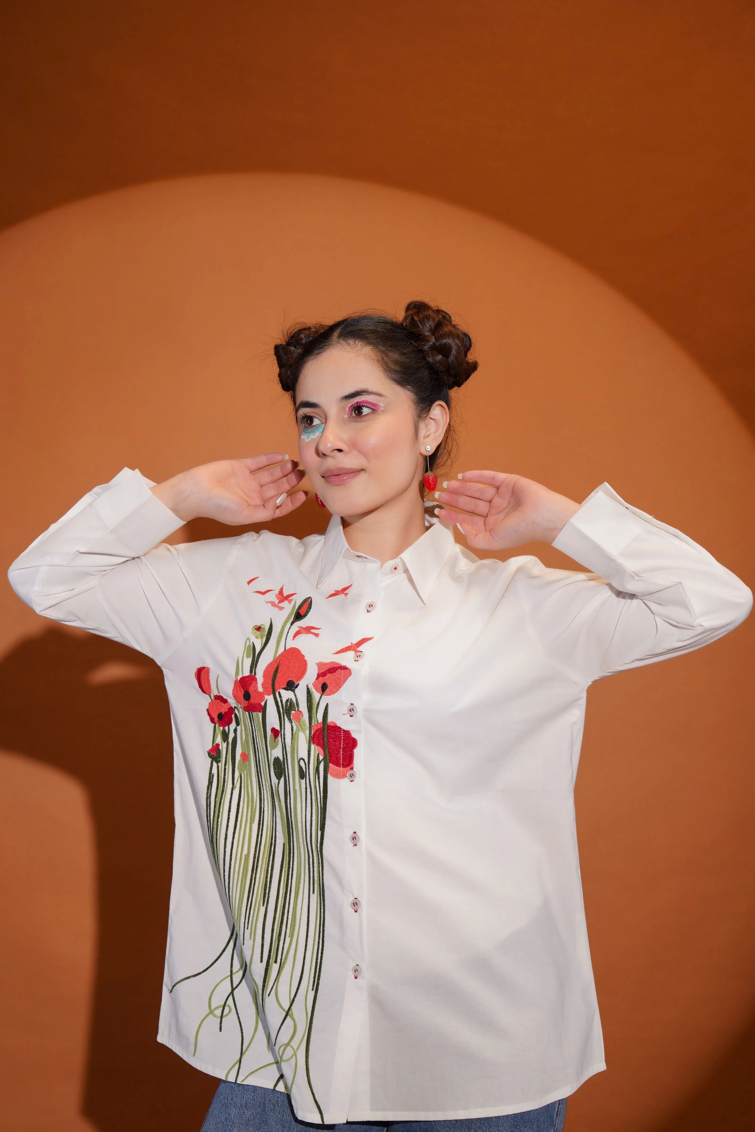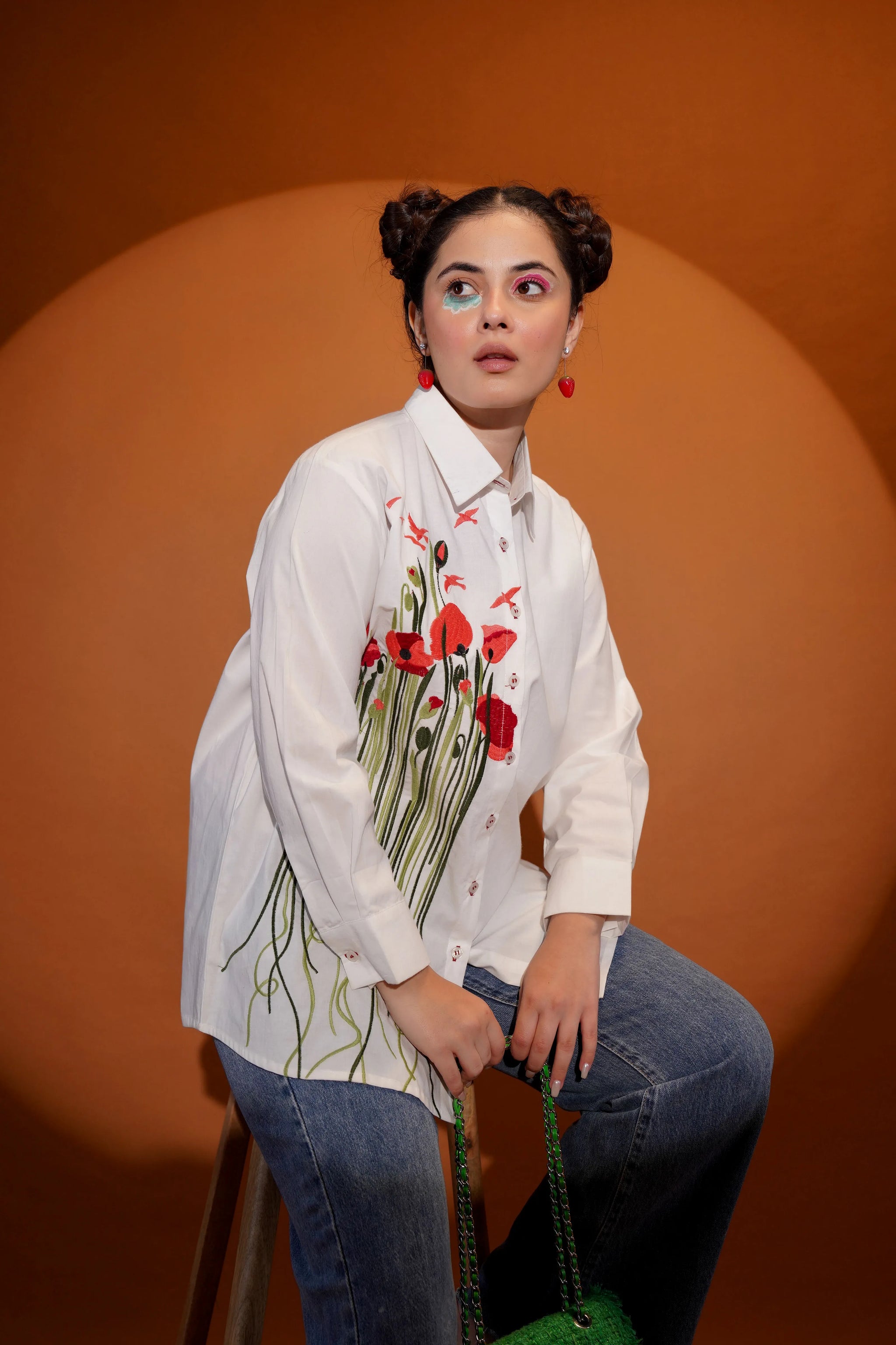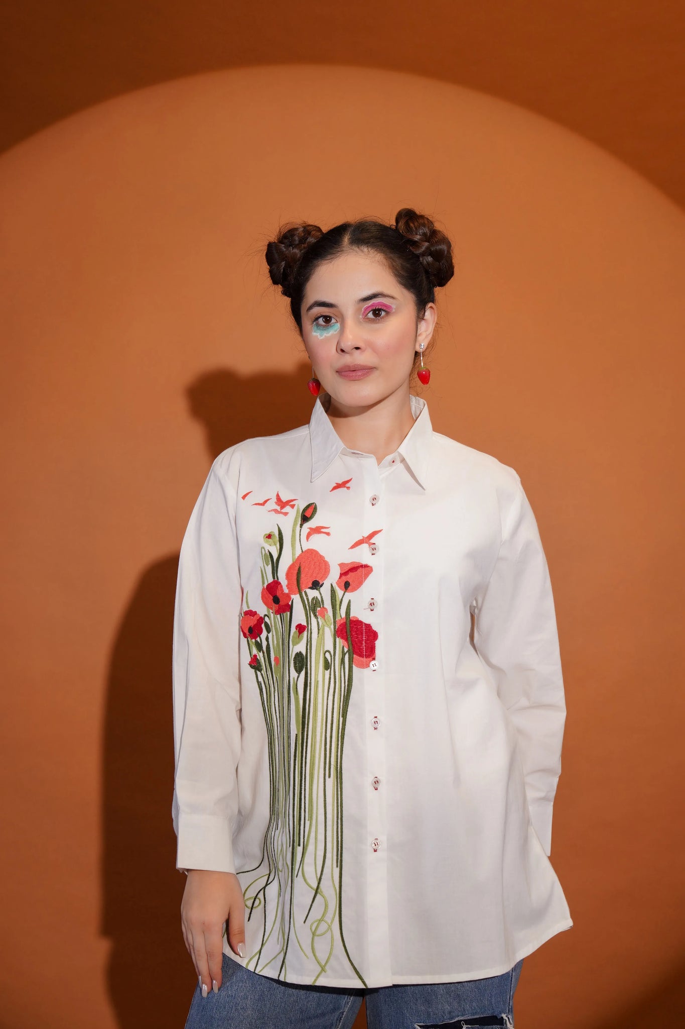 Wild Bloom: White Shirt with Multicolour Floral Embroidery in Cotton Poplin