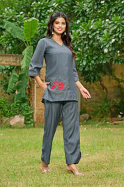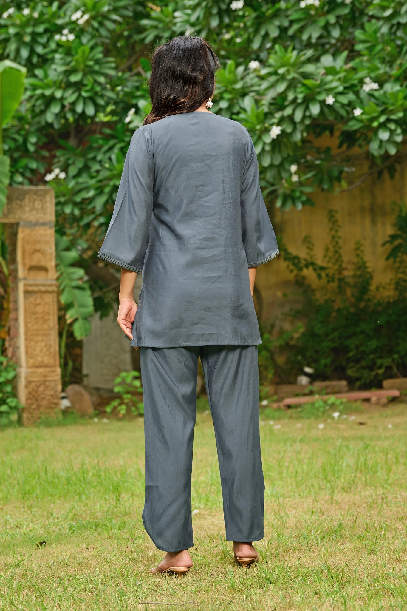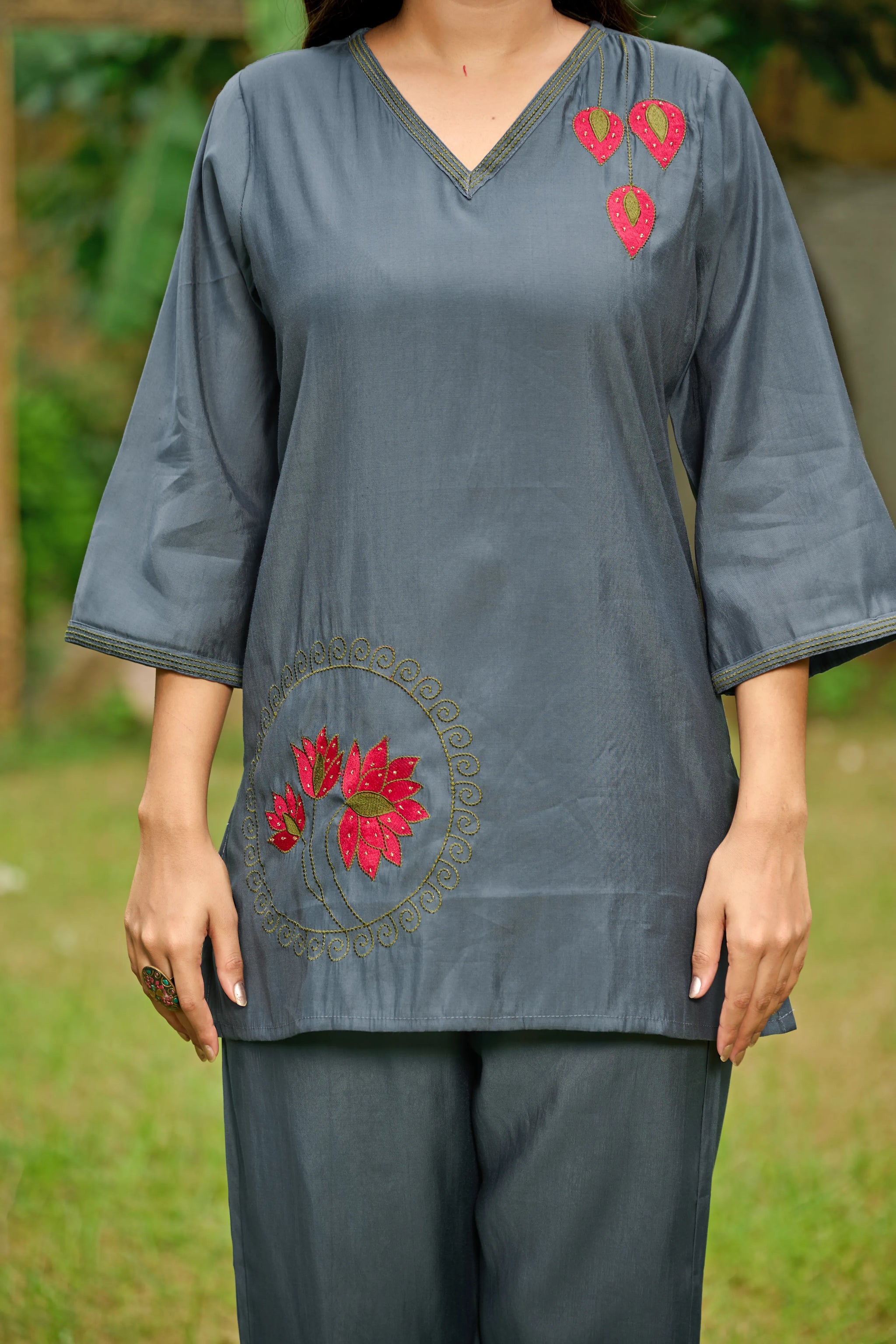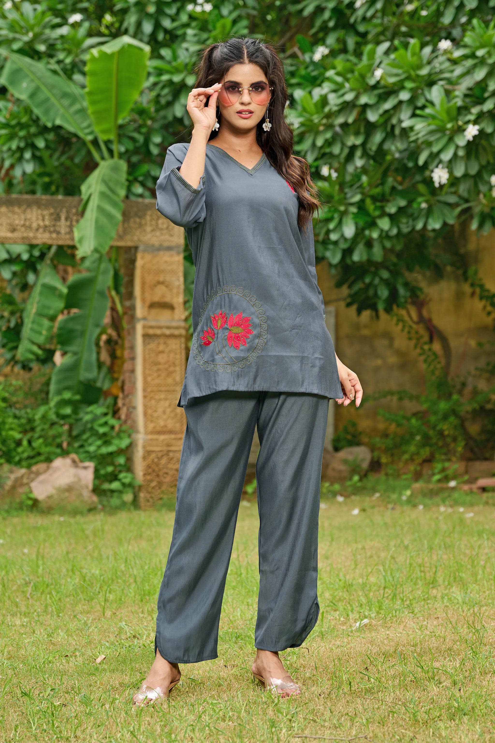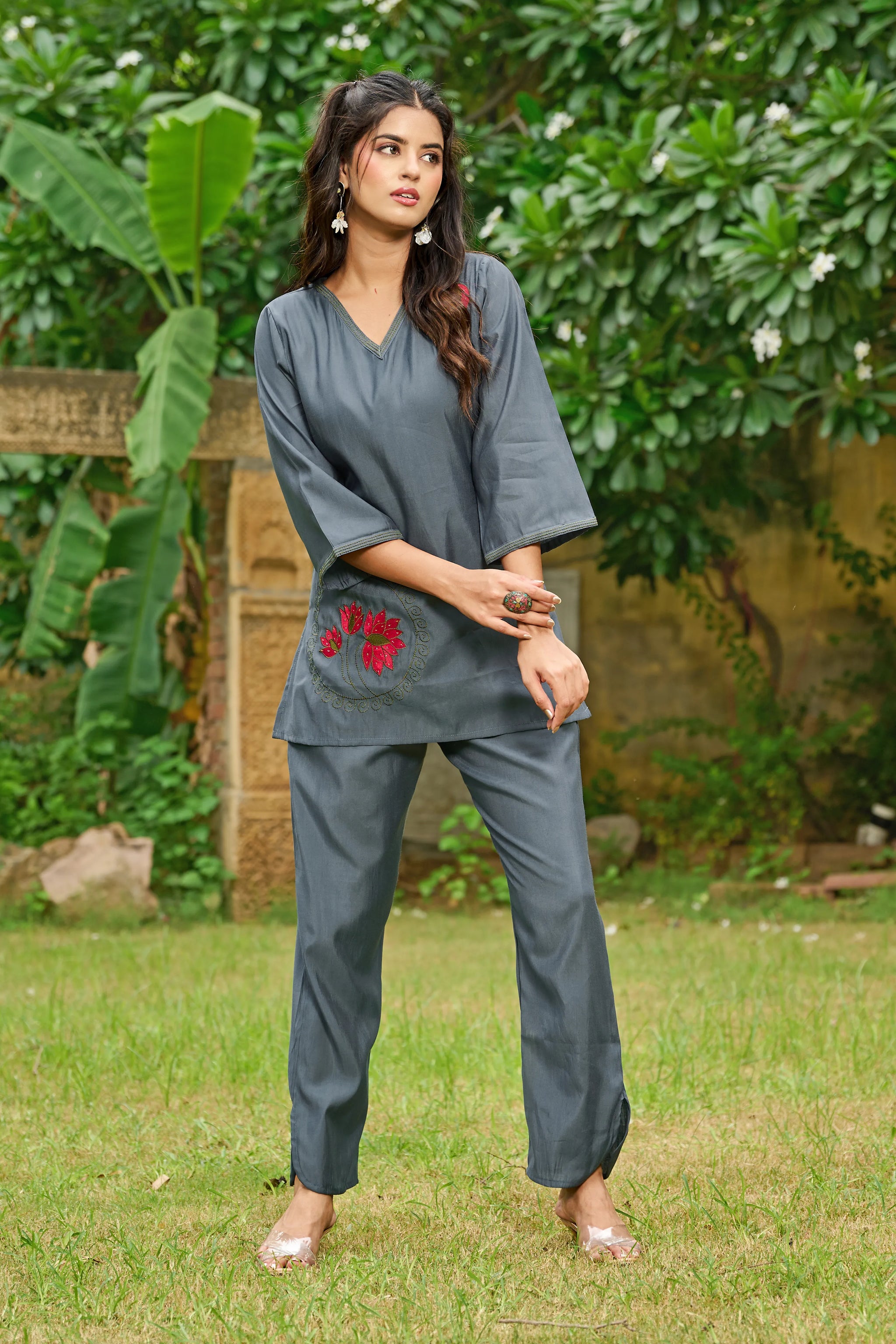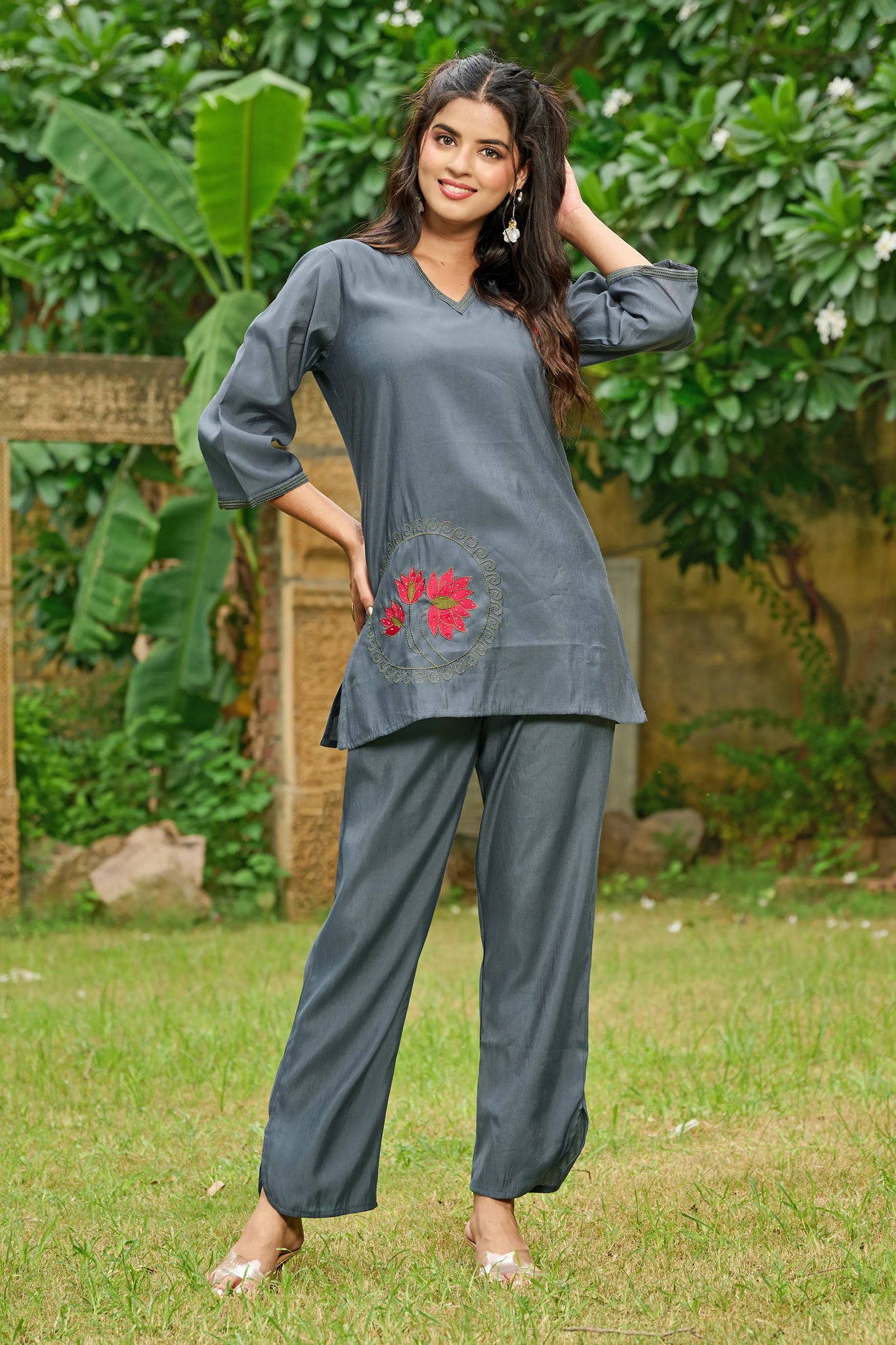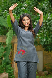 Channel understated elegance with Blue Bloom, a serene dusty blue co-ord set designed for the modern muse. Crafted in lustrous Roman silk, this ensemble features bold red and green lotus embroidery positioned at the hem and near the neckline. The clean V-neckline and relaxed silhouette with 3/4th sleeves ensure it’s both flattering and fuss-free.