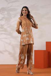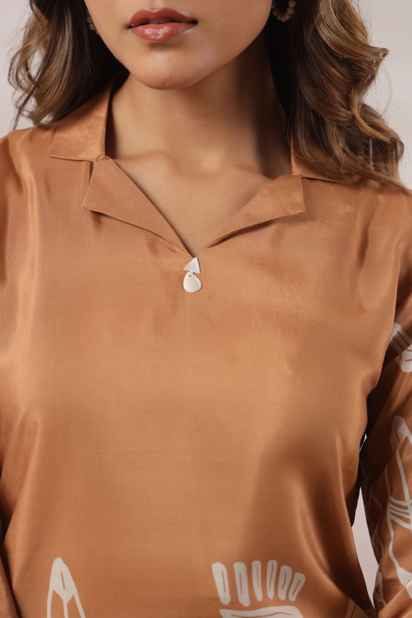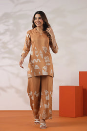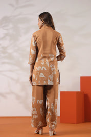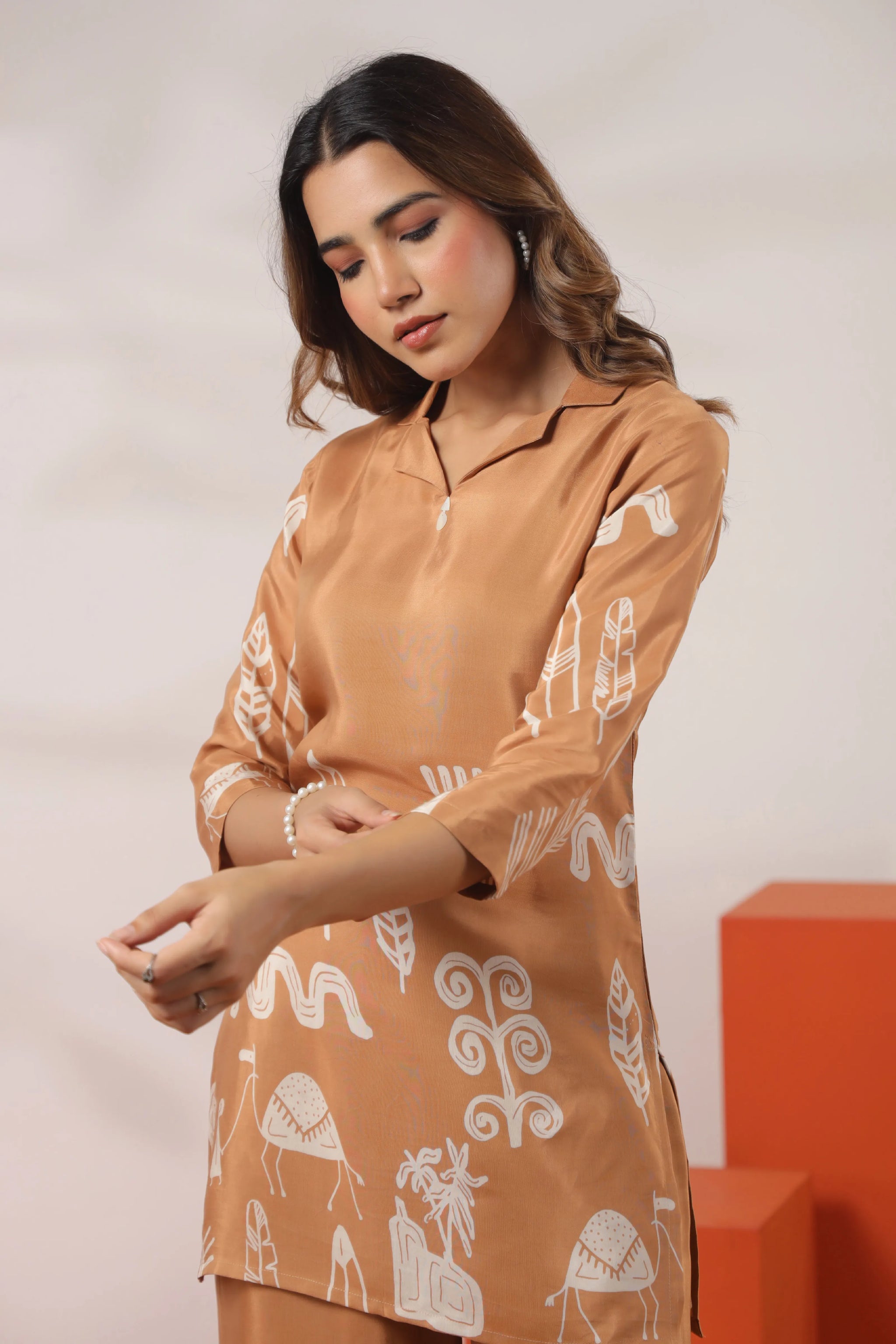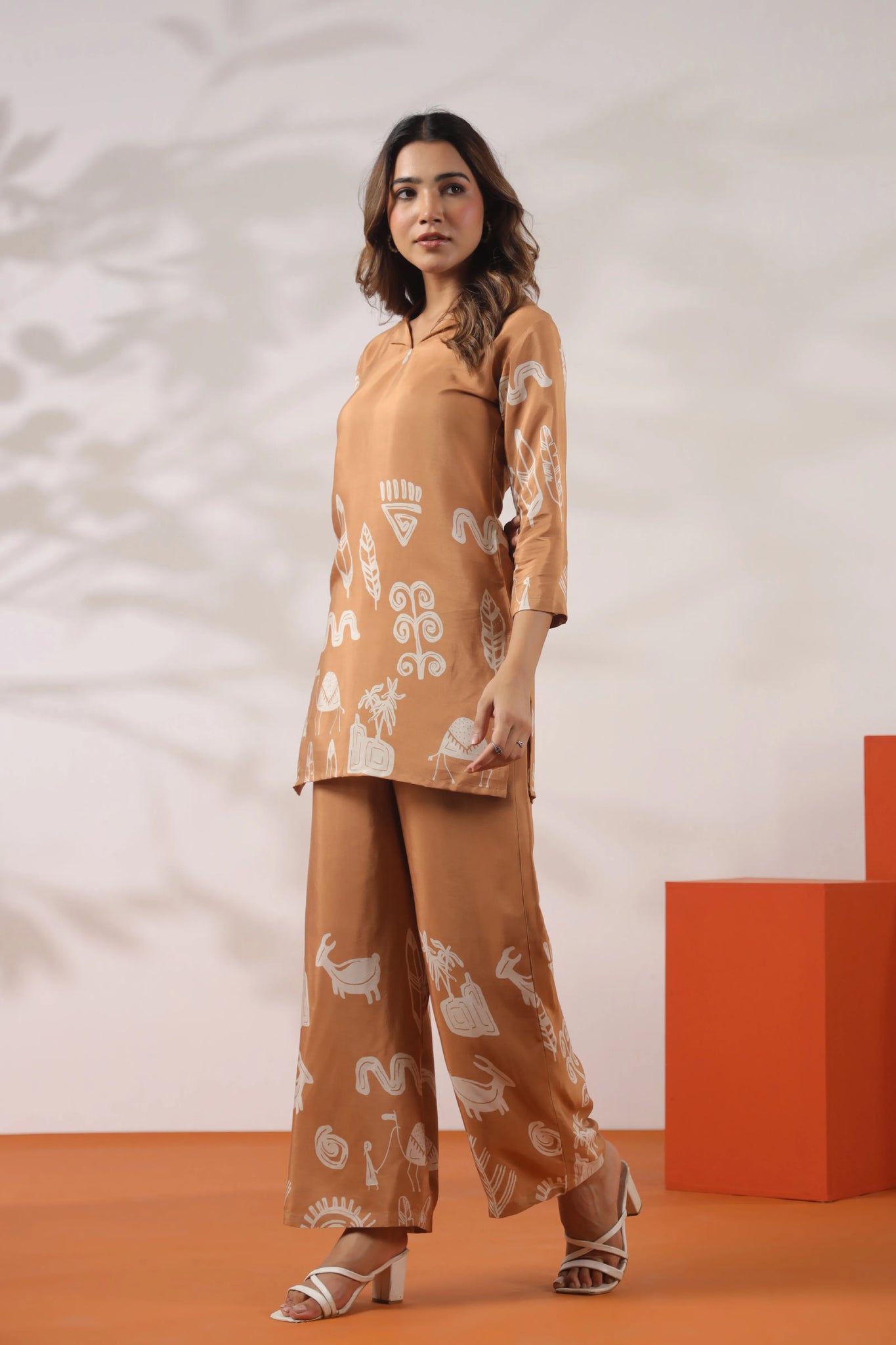 Desert Echo: Brown Tribal Print Russian Silk Co-ord Set