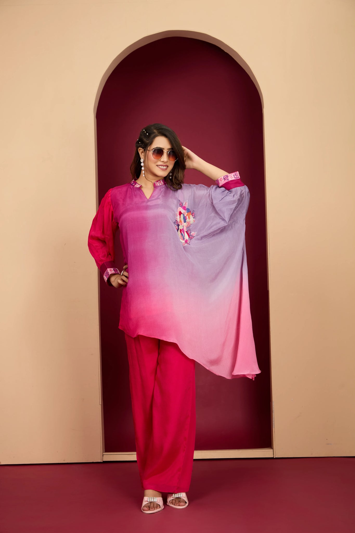 Elevate your wardrobe with this Magenta Pink & Purple Embroidered Chinon Co-Ord Set, a perfect blend of vibrant colors and intricate craftsmanship. The dip-dye effect in magenta pink and purple adds a stunning touch, while the soft chinon fabric ensures both comfort and elegance. This wide-leg pant set is designed with a flattering V-neckline, complemented by exquisite embroidery detailing. Whether for casual or semi-formal occasions, this co-ord set is sure to make a statement.