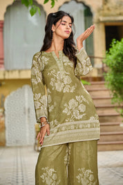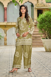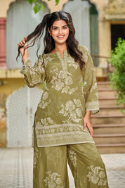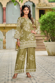 Capture the spirit of timeless elegance in our Olive Bloom co-ord set — where classic charm meets contemporary comfort. Crafted in a breezy olive green crepe, this ensemble features a graceful allover cream floral print and intricately detailed borders that bring a subtle luxe to your everyday wardrobe.
