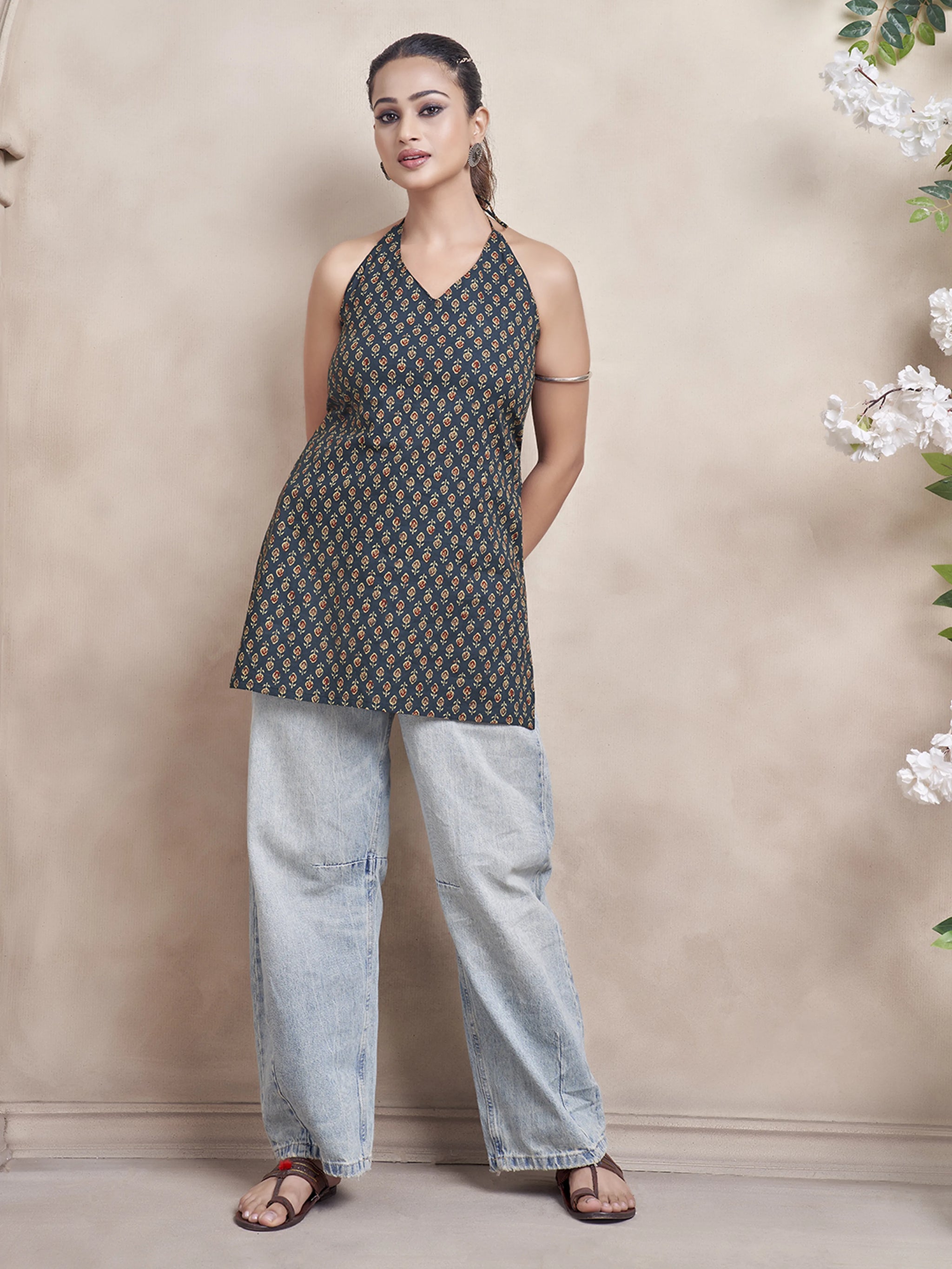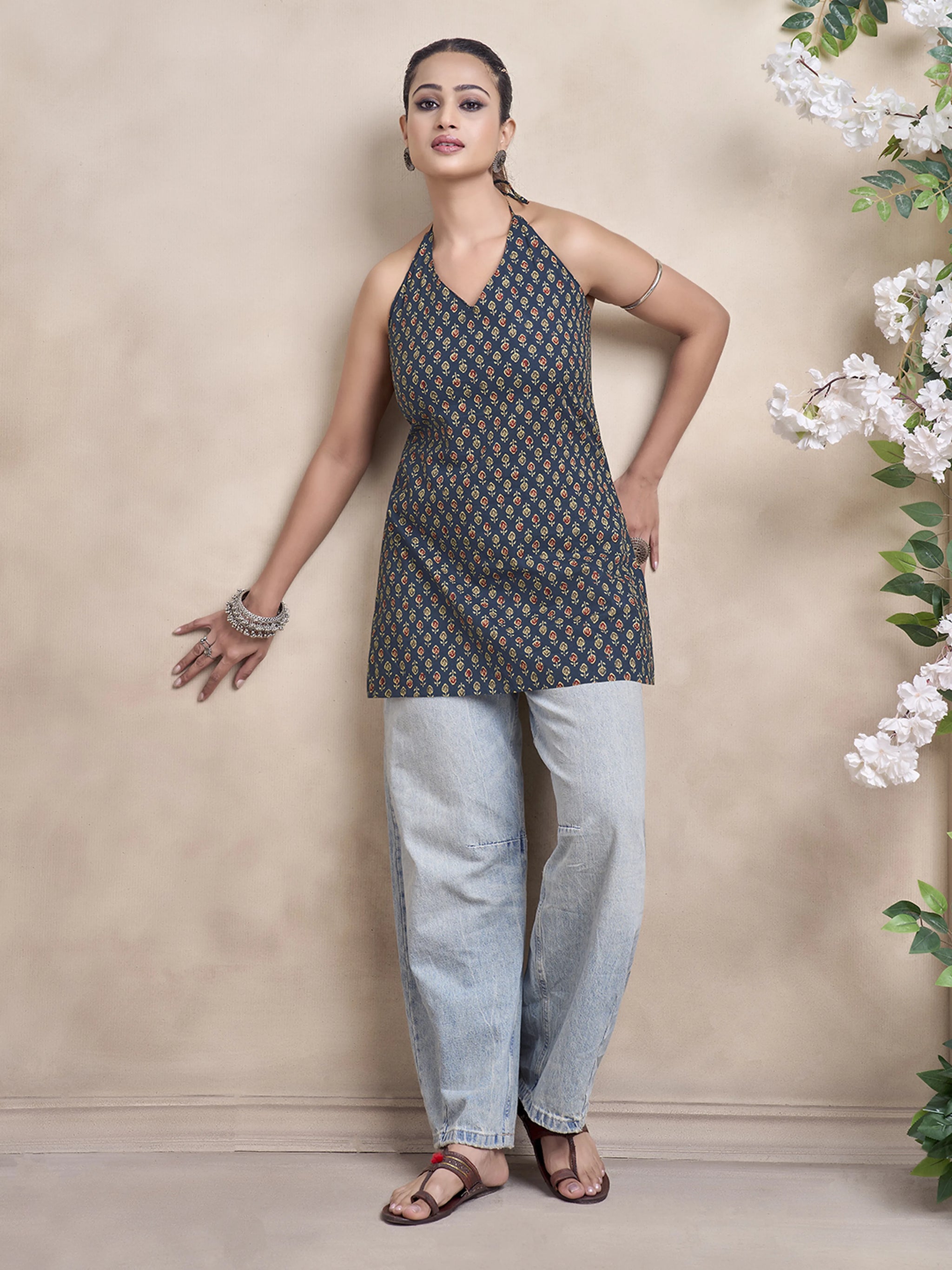 Navy Blue Halter Neck Cotton Short Kurti with Motif Print