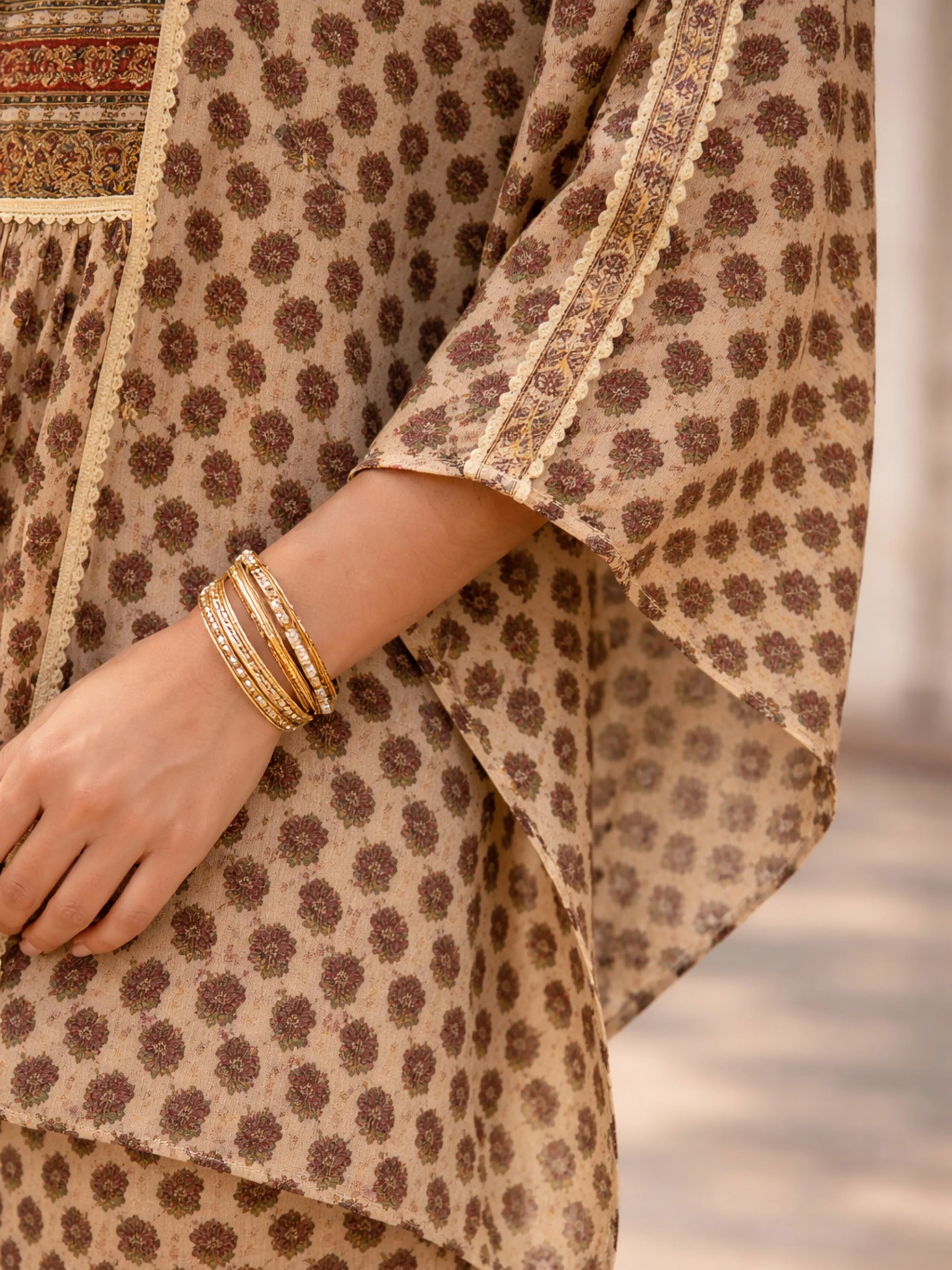 The kaftan features a softly gathered front with a round neckline, highlighted by delicate lurex thread and moti work that lends a subtle shimmer to the silhouette. Intricately attached aari lace detailing enhances the neckline and panel lines, adding depth and handcrafted finesse. The free-flowing kaftan cut with wide drape sleeves creates a relaxed yet statement silhouette that flatters every body type while offering unmatched comfort.