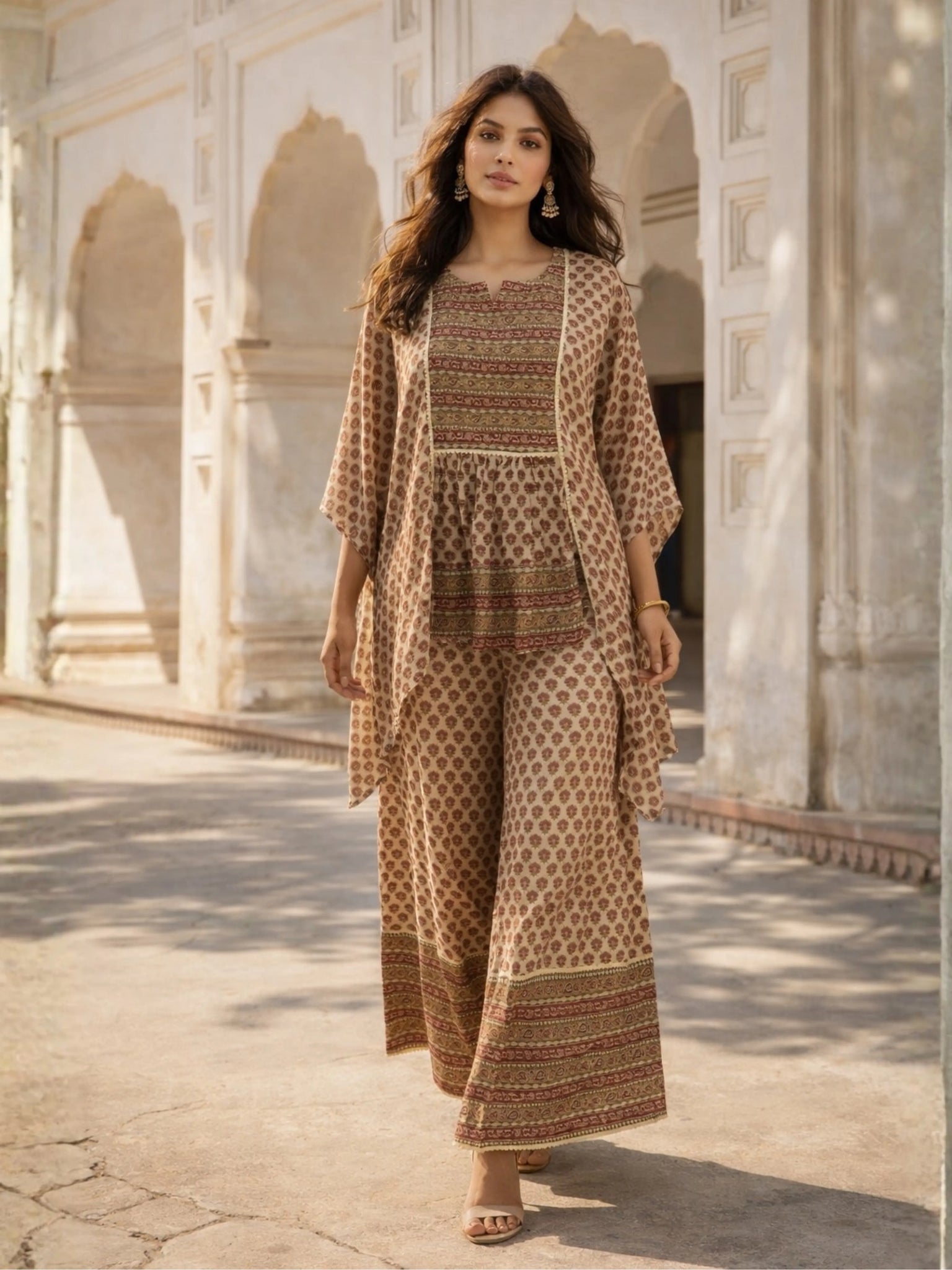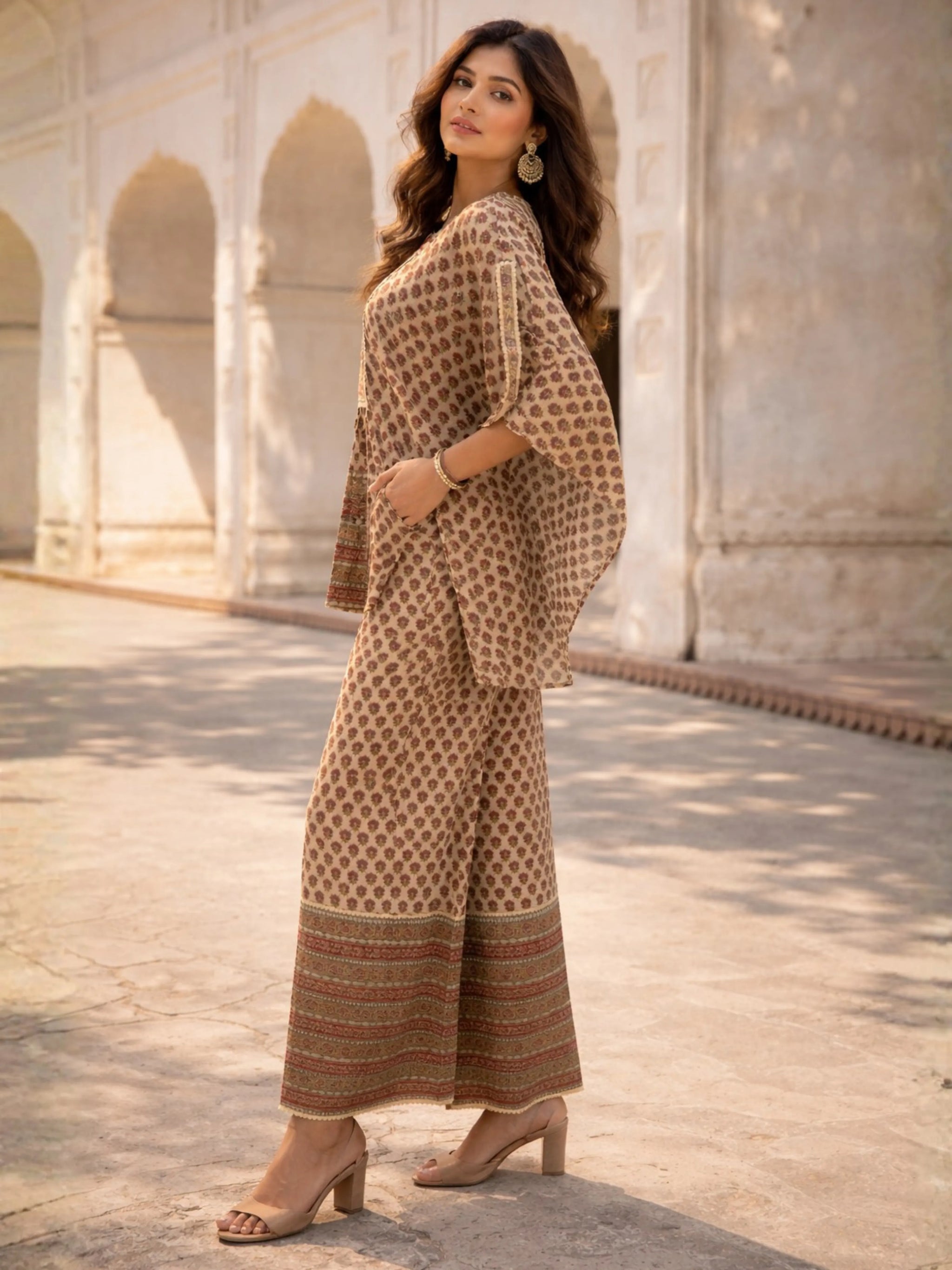 Paired with the kaftan is a beautifully coordinated straight-fit palazzo pant, designed with an elasticated waistband for ease and wearability. The palazzos are finished with elegant aari lace detailing, tying the entire look together with a cohesive, polished finish.