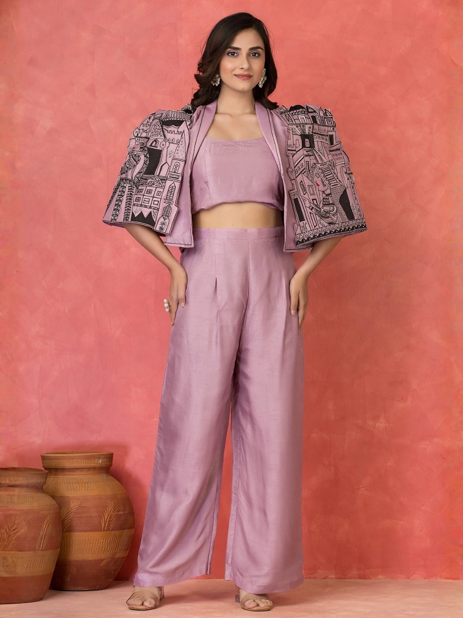 Lilac Atelier: Three-Piece Embroidered Co-ord Set with Architectural Cape in Dola Silk