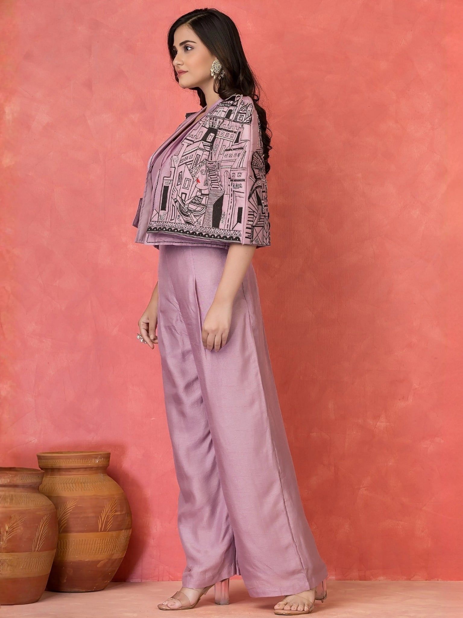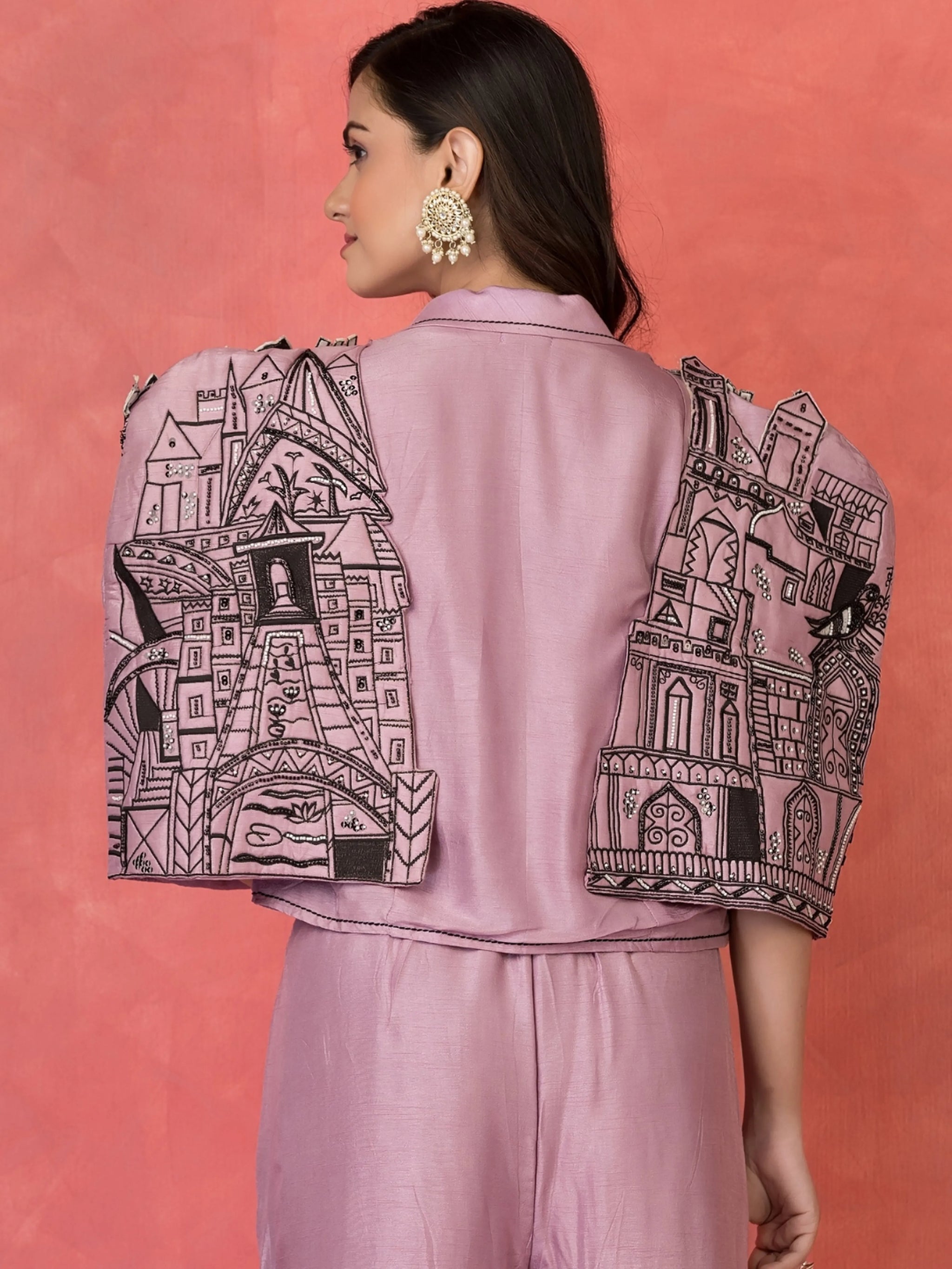 Lilac Three-Piece Embroidered Co-ord Set with Architectural Cape in Dola Silk