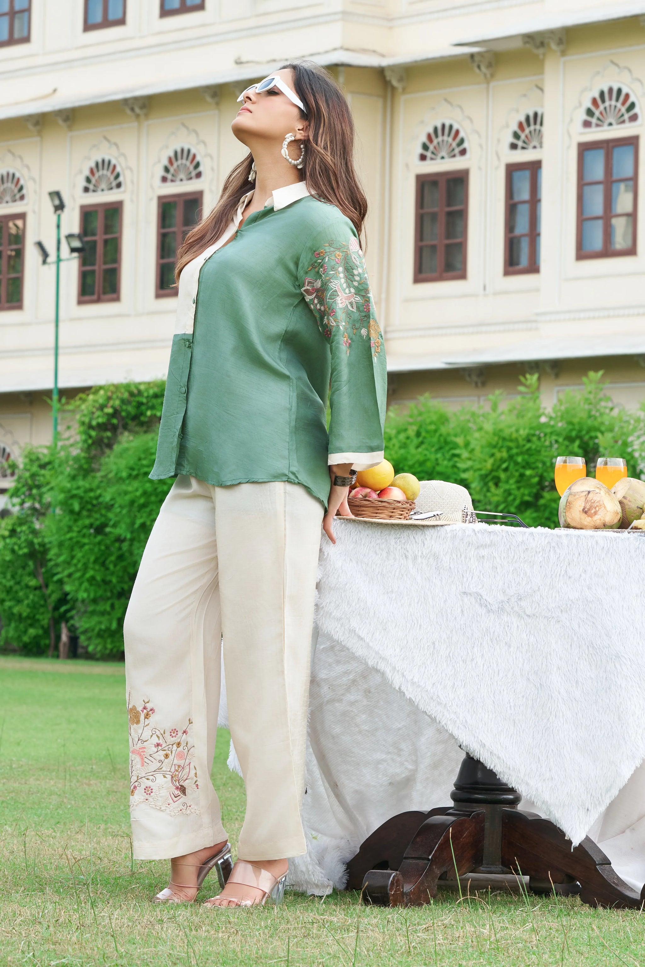 Meadow Whisper: Cream & Green Floral Embroidered Co-ord Set in Dola Silk