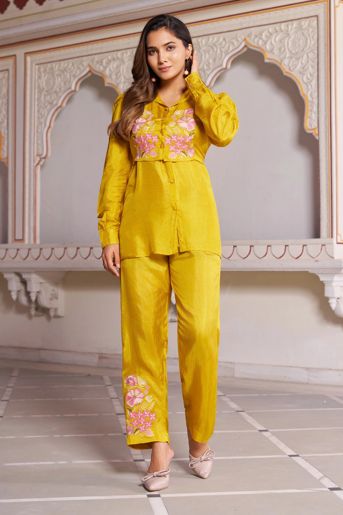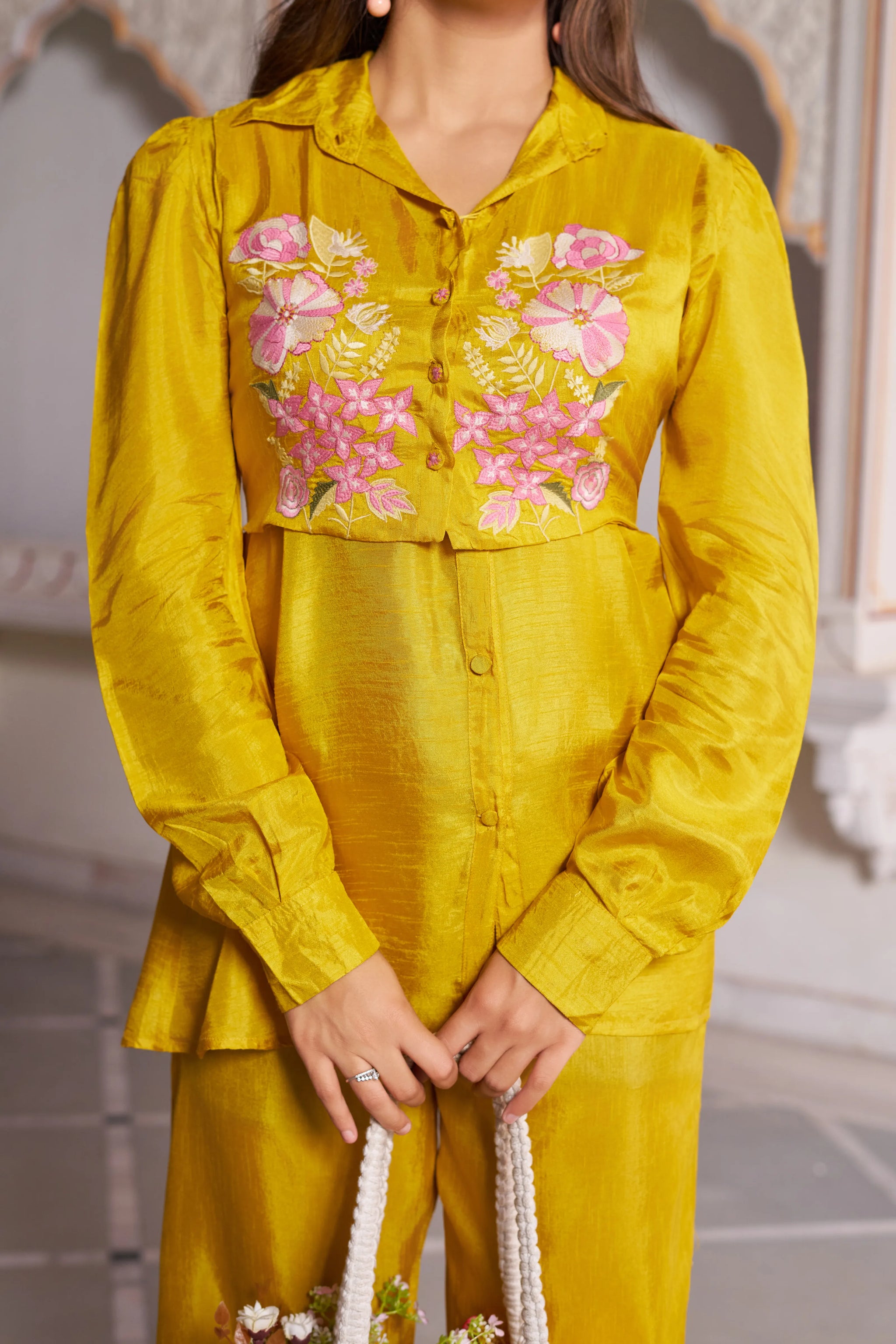 • Color: Rich mustard base with multicolor floral embroidery