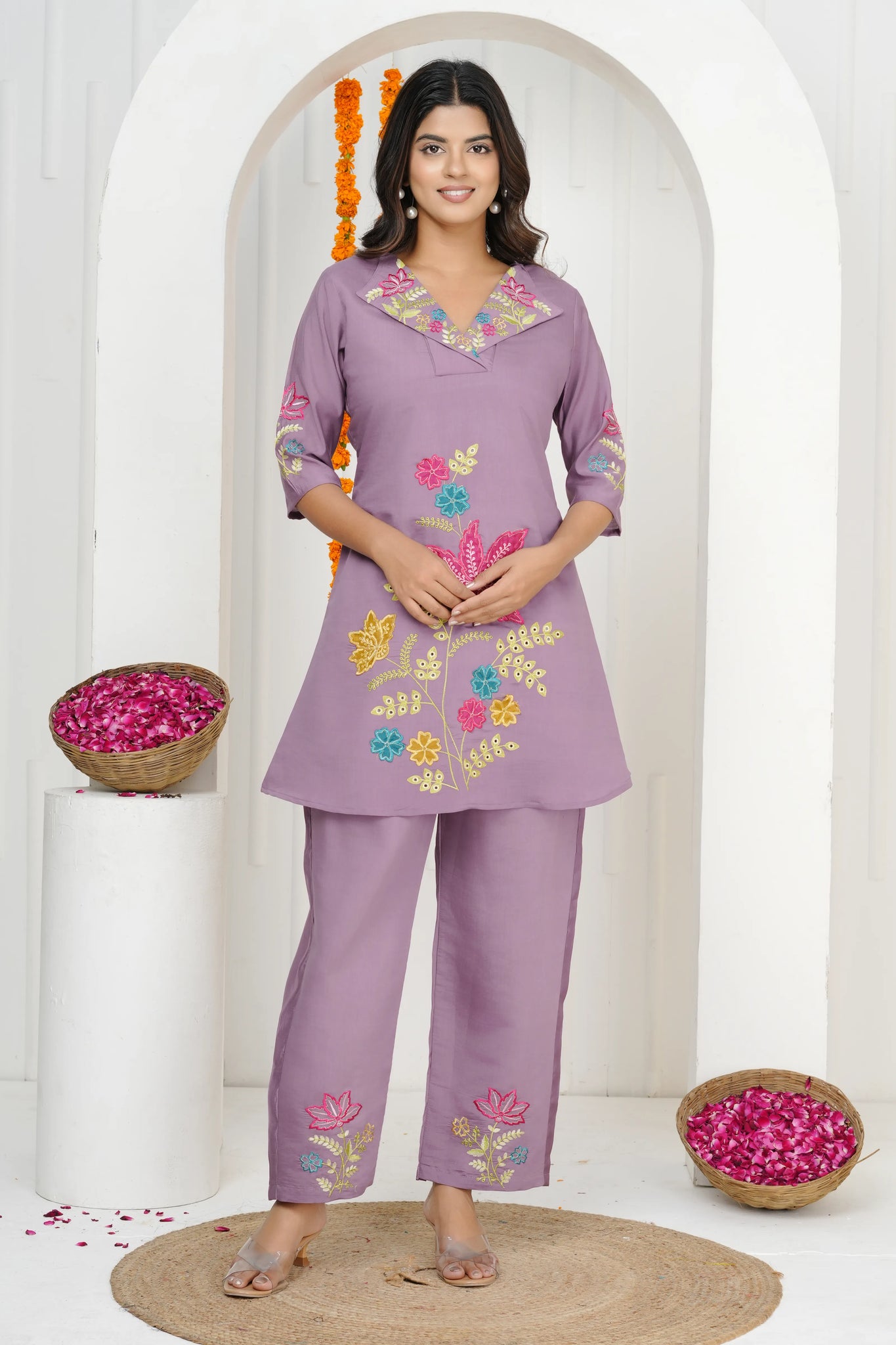 Lilac Bloom: Embroidered A-Line Co-ord Set in Roman silk