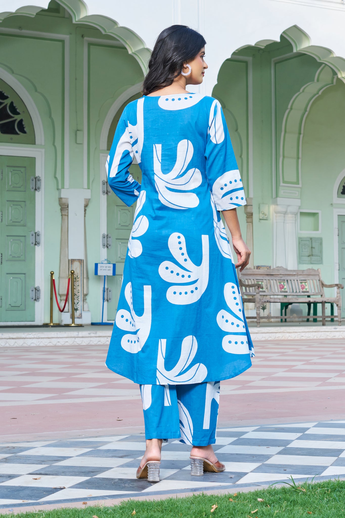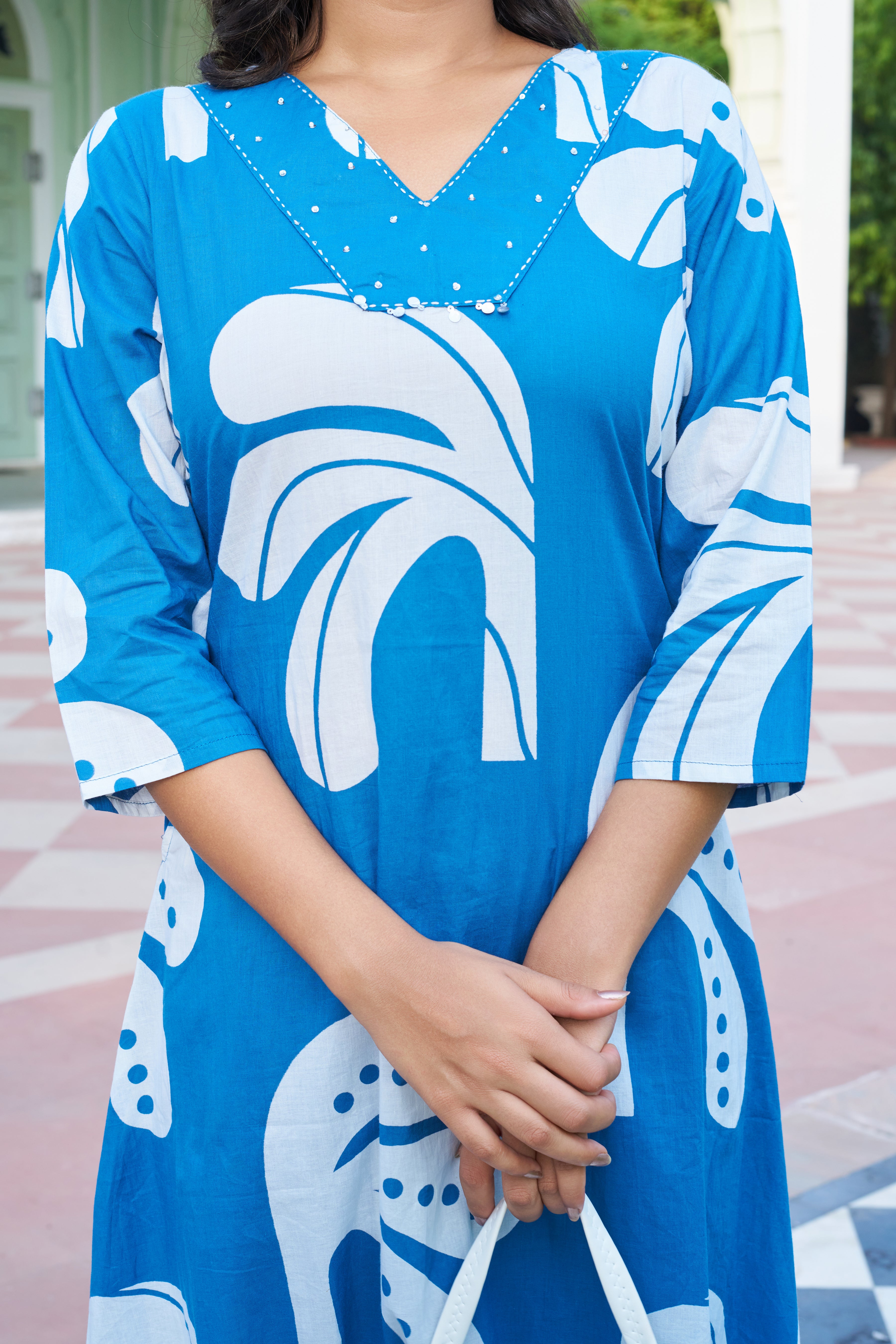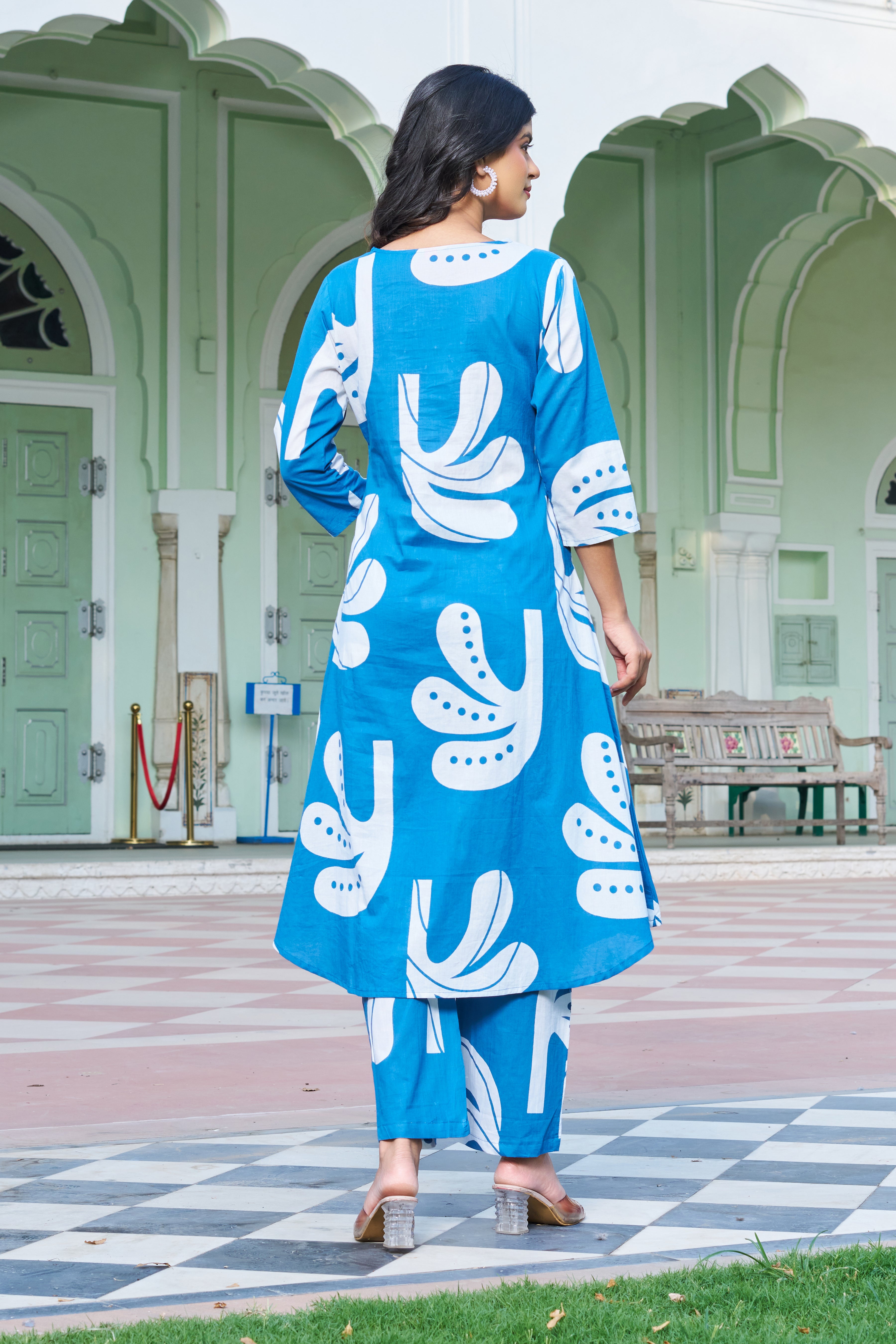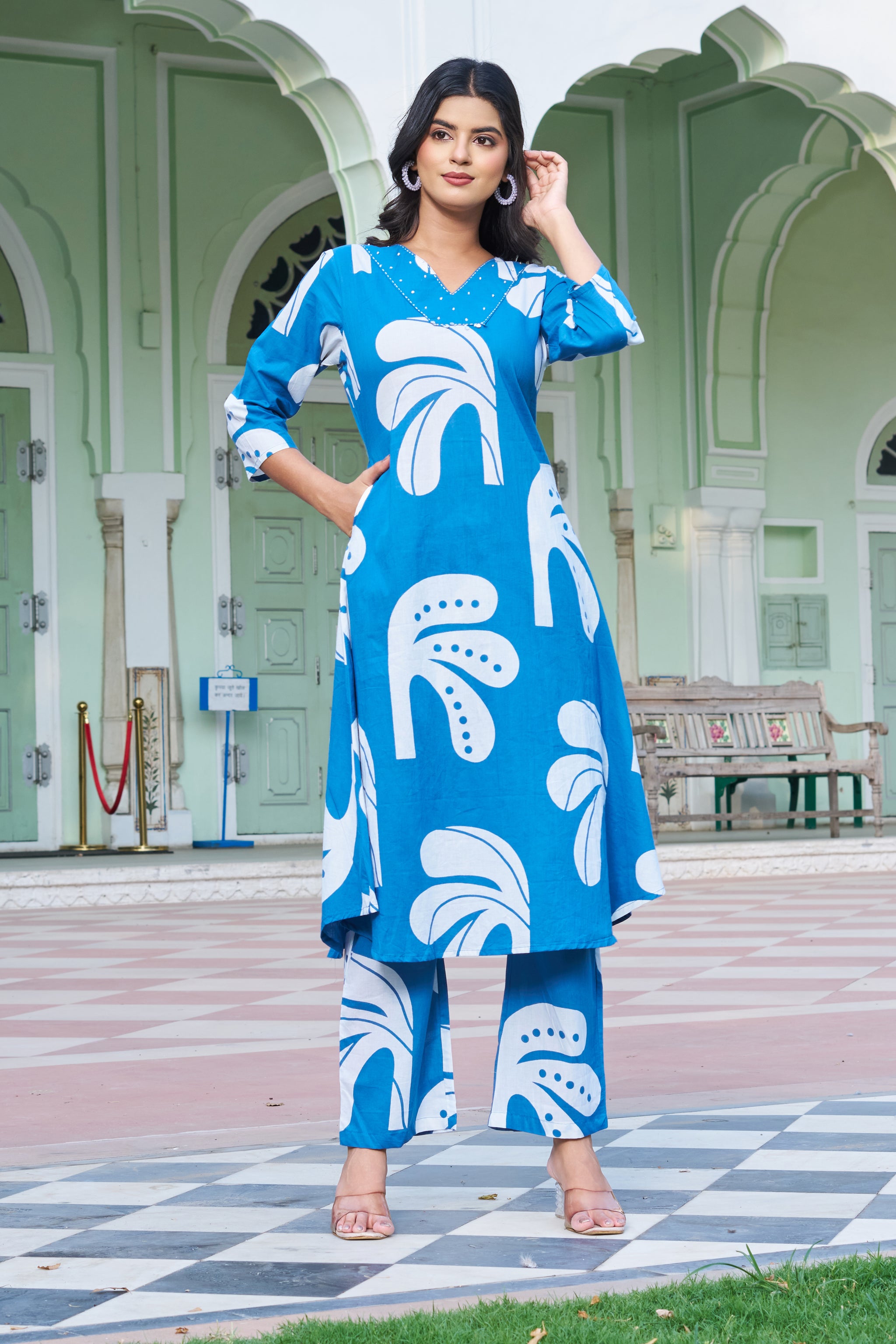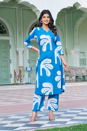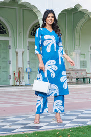 Channel playful elegance with our Blue Breeze co-ord set – a perfect blend of artistic flair and everyday ease. This long A-line kurta set features bold white tropical leaf motifs that lend a fresh, modern touch to classic ethnicwear.