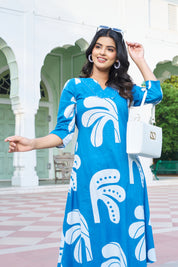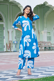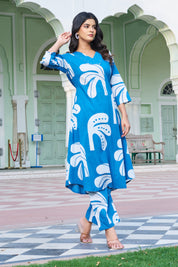 Blue Breeze: Tropical Leaf A-line Kurta Set
