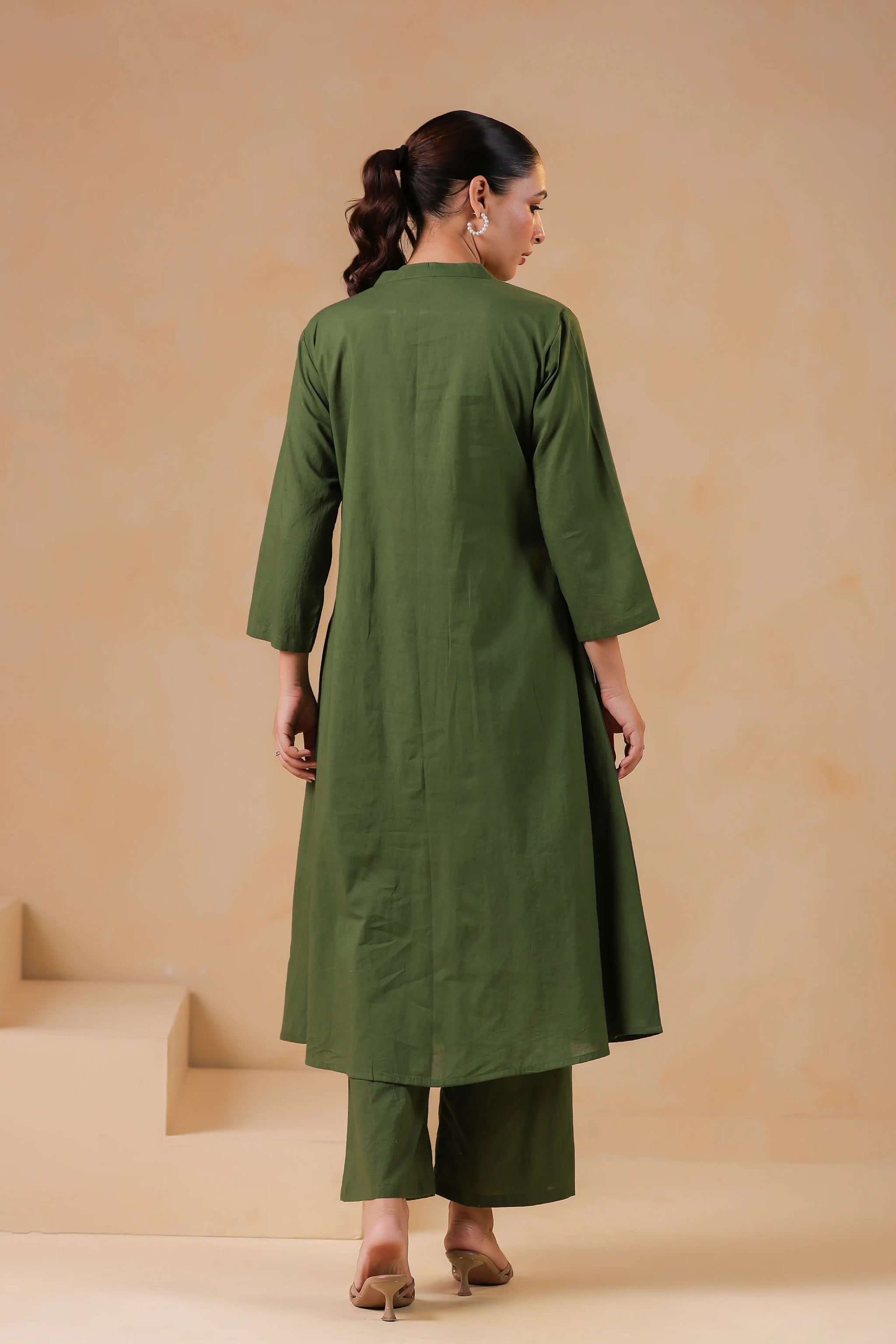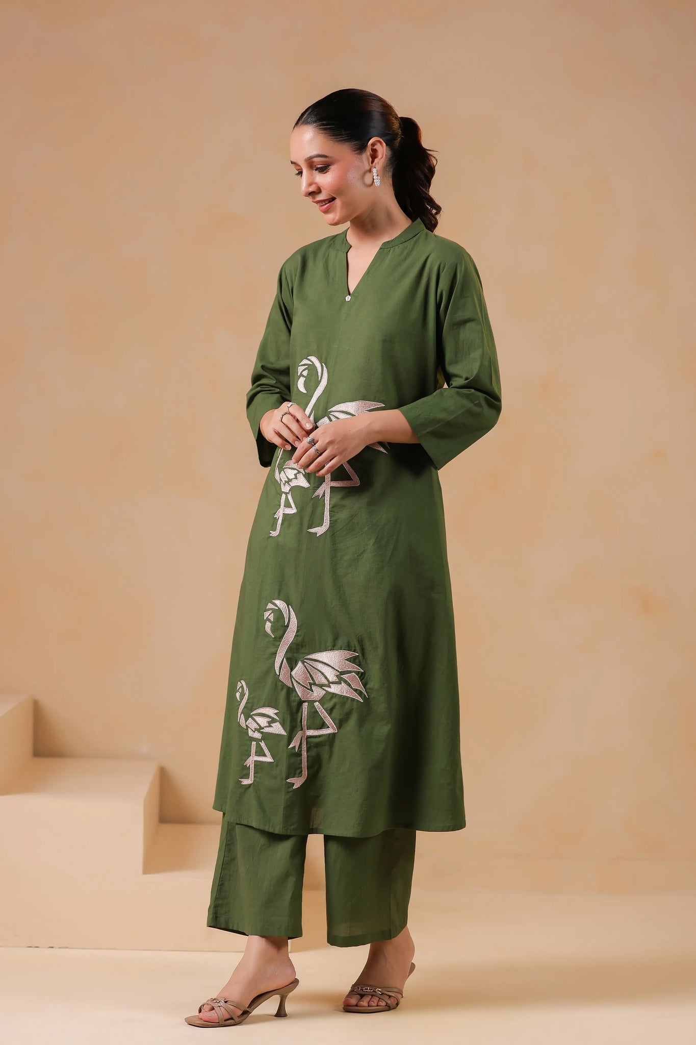Emerald Flamingo: Embroidered Cotton Kurta Set