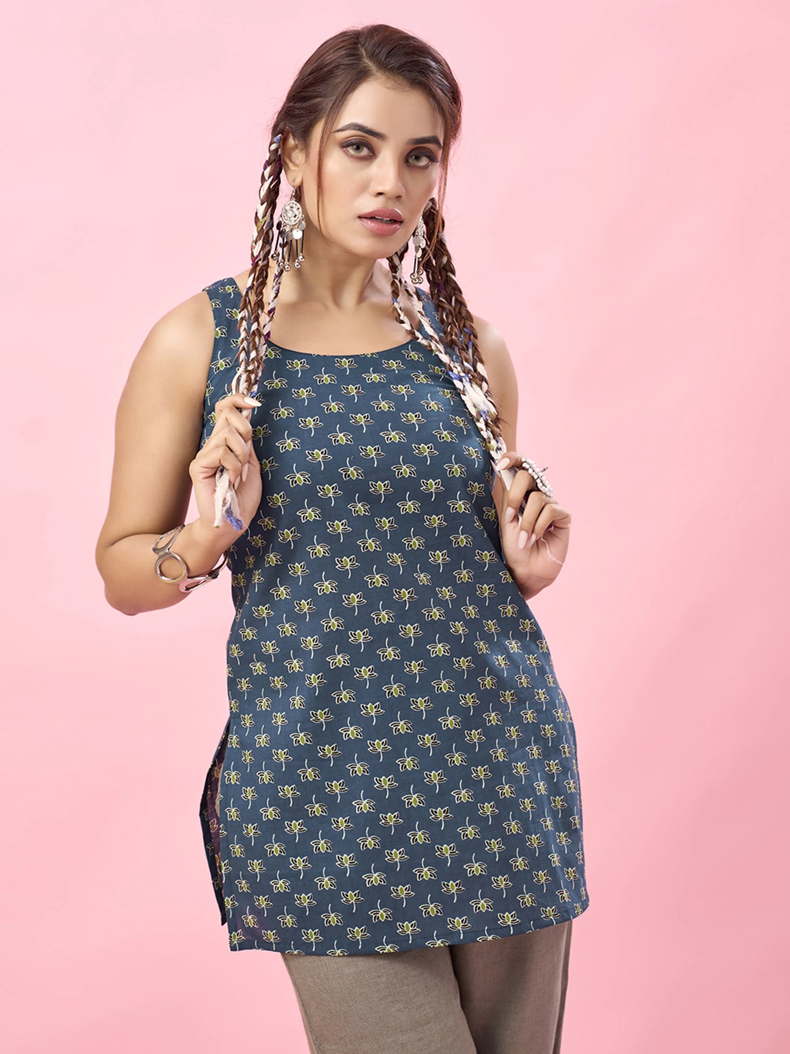 Blue Lotus Printed Cotton Short Kurti with Dori Back