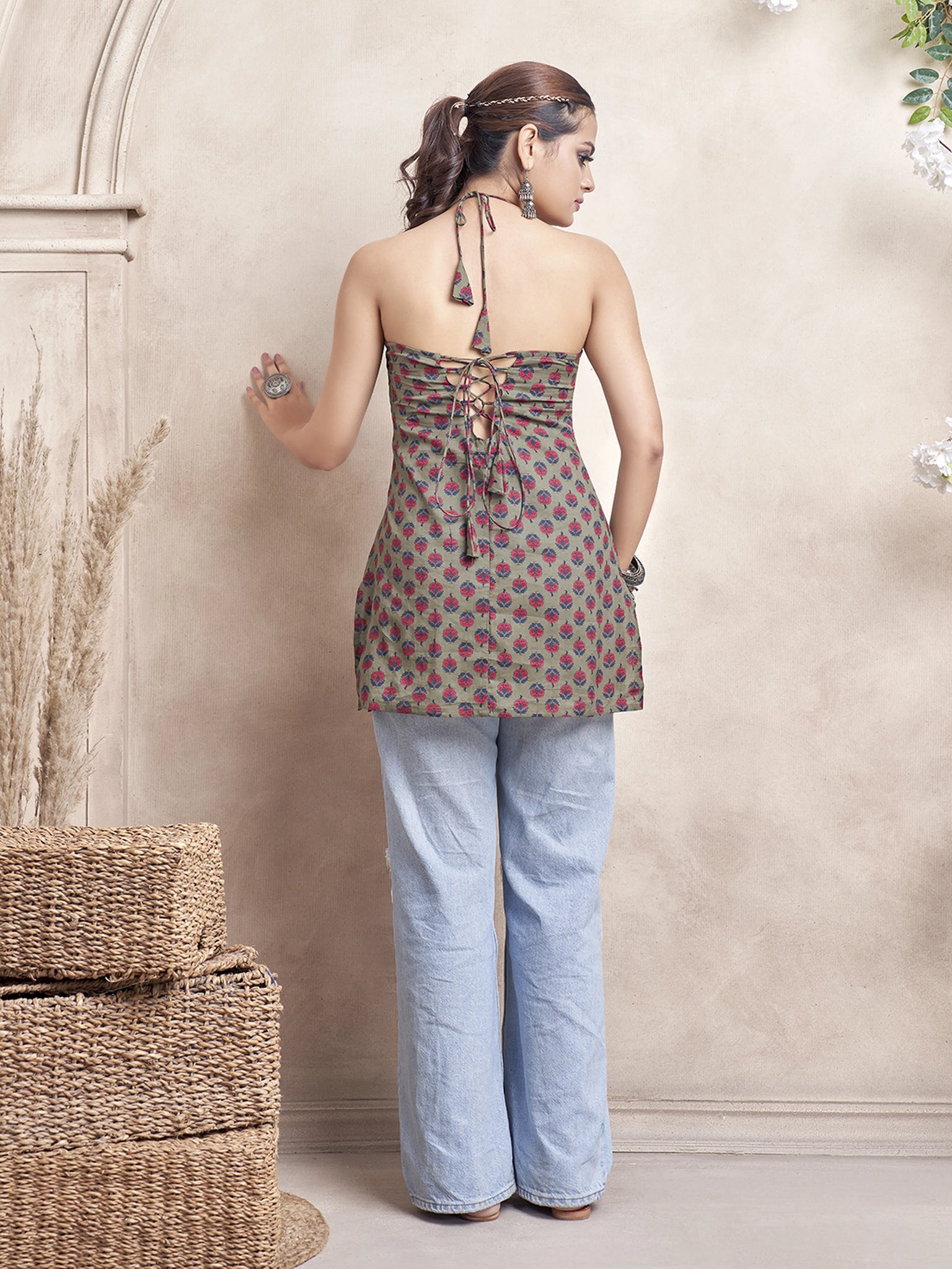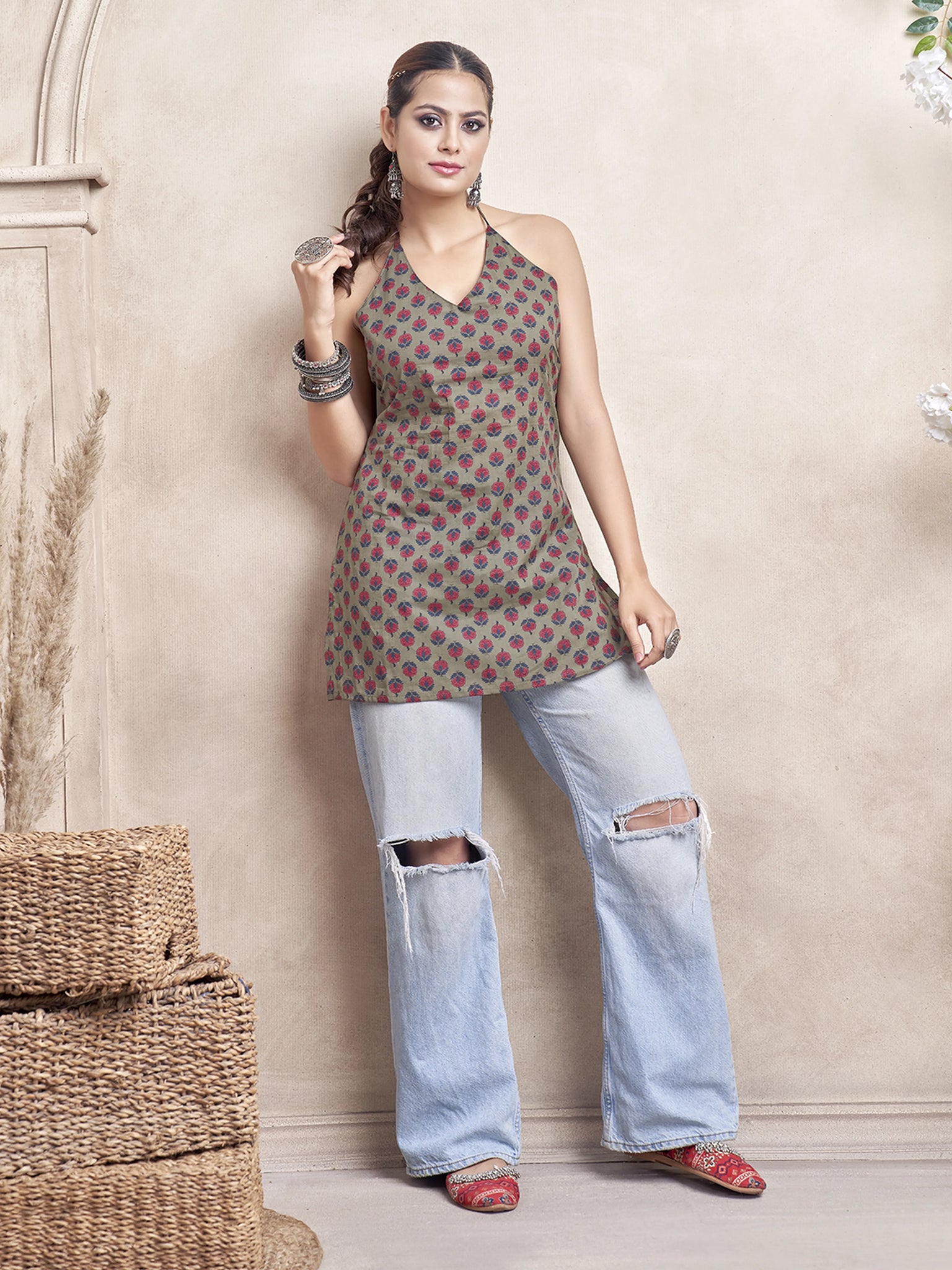 Olive Green Halter Neck Cotton Short Kurti with Floral Block Print
