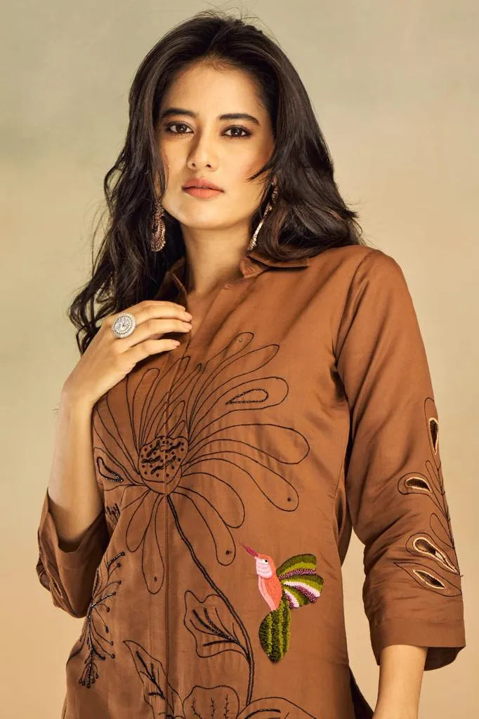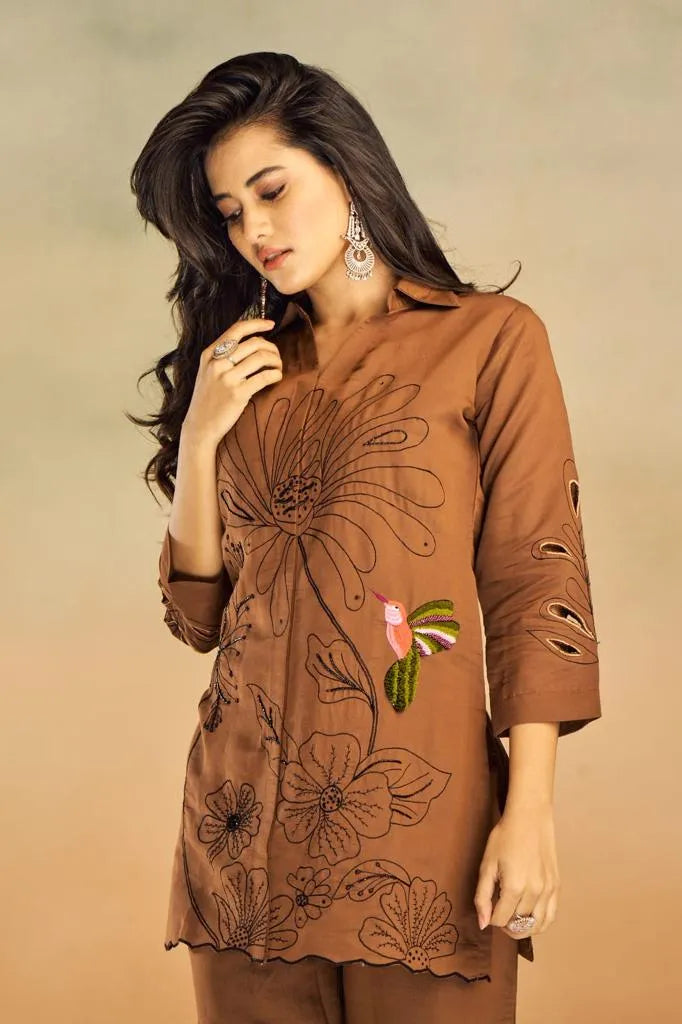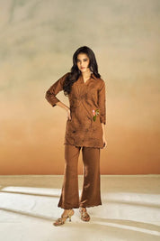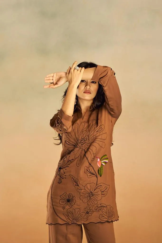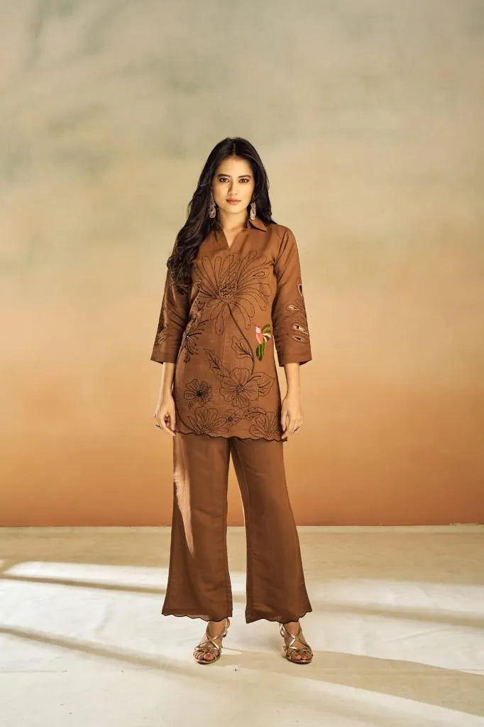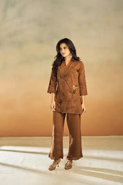 Brown Thread Work Tunic & Trouser Co-Ord Set