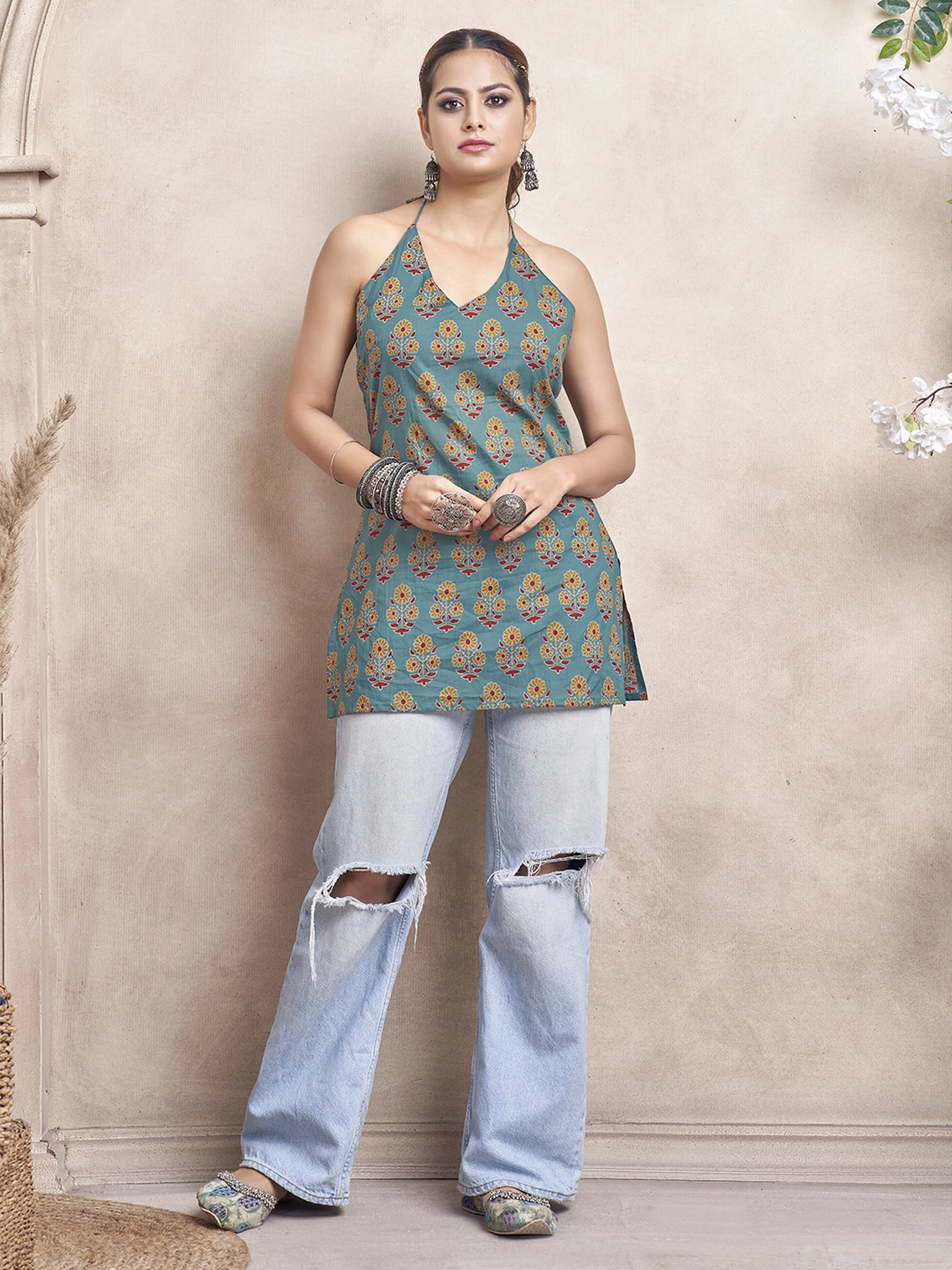 Muted Green Halter Neck Cotton Short Kurti with Floral Block Print