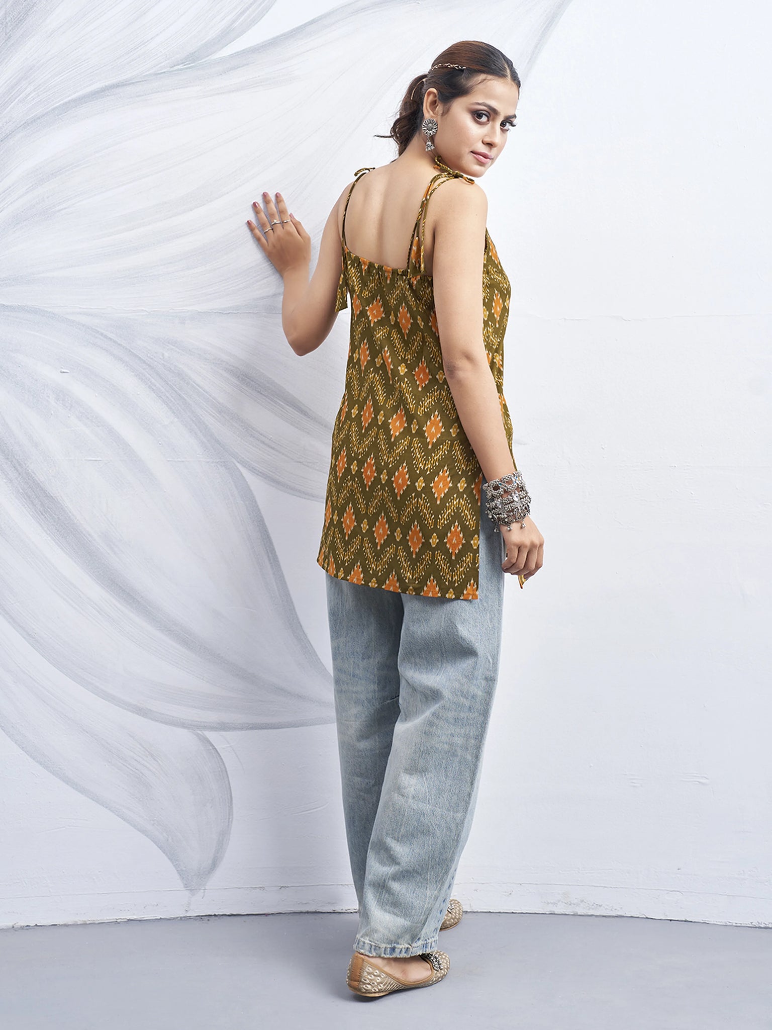 Rustic Ikat: Olive Green Tie-Knot Shoulder Cotton Short Kurti
