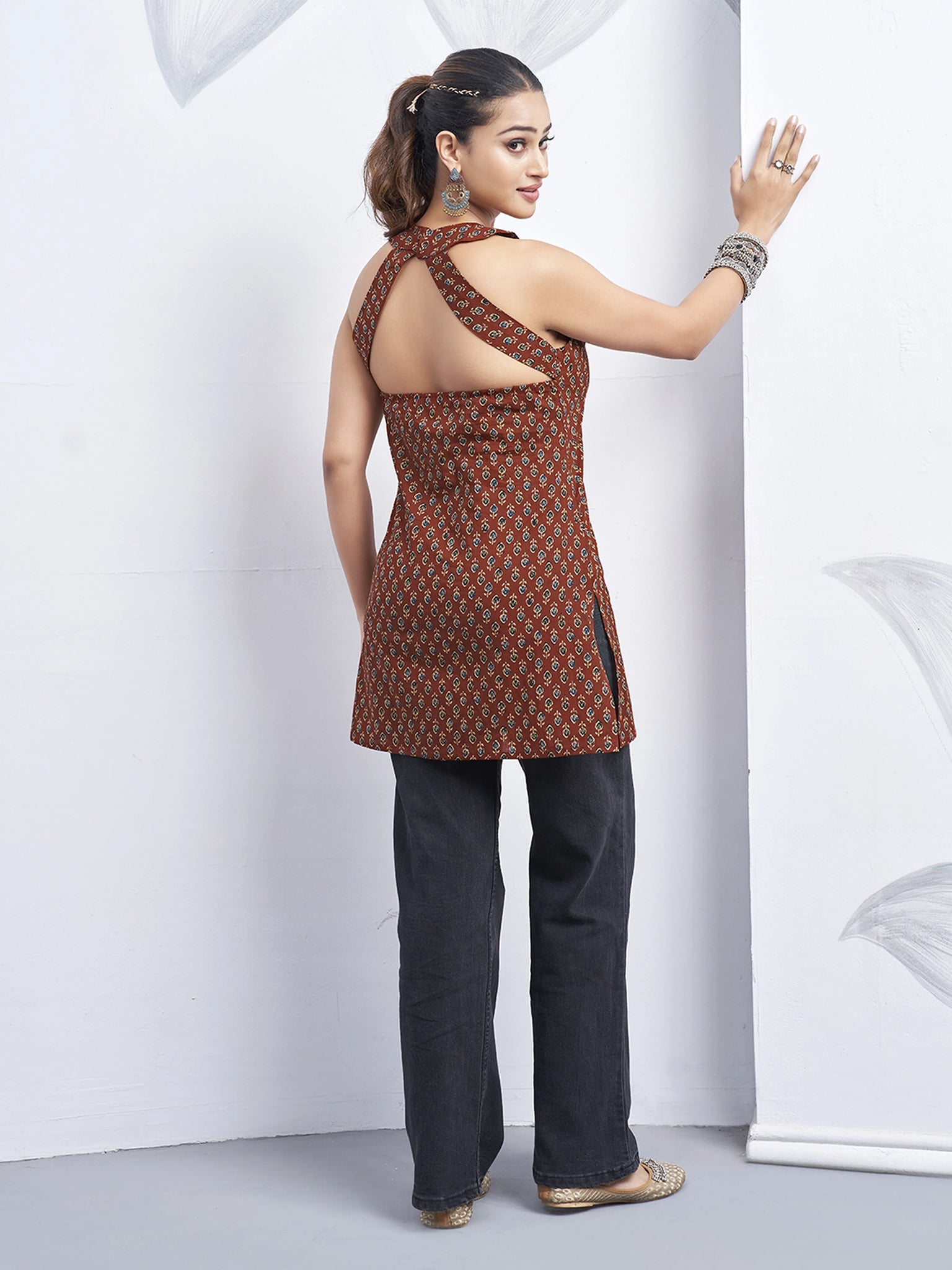 Traditional charm meets modern boldness in this red halter neck kurti, designed to stand out with effortless grace. Made from pure breathable cotton, it is adorned with kali booti block print motifs in earthy tones, giving it a timeless handcrafted appeal. The halter neckline with hook-and-eye fastening ensures a secure fit, while the cut-out back with backless detailing adds a daring twist. Sleeveless and versatile, this kurti is perfect for Indo-fusion looks that transition seamlessly from day outings to evening gatherings.