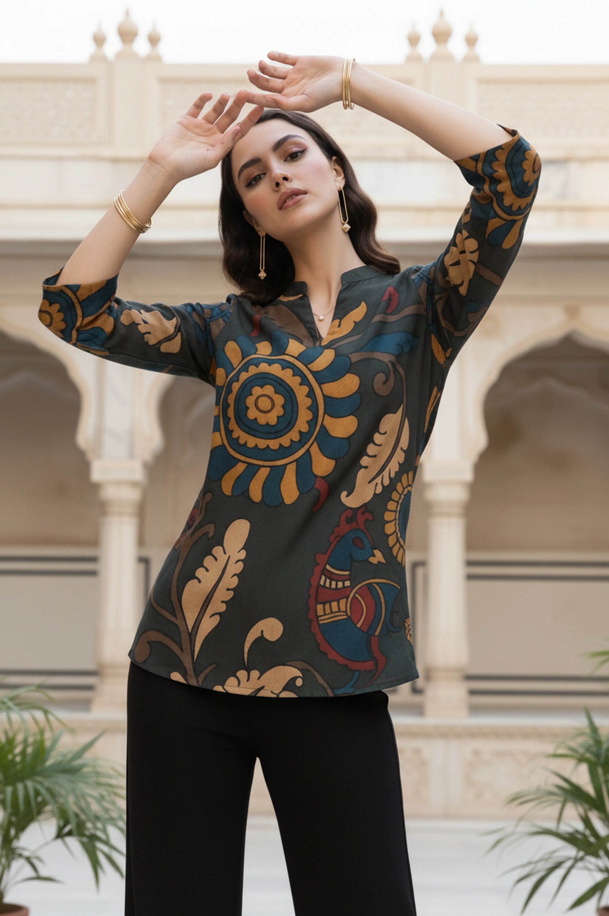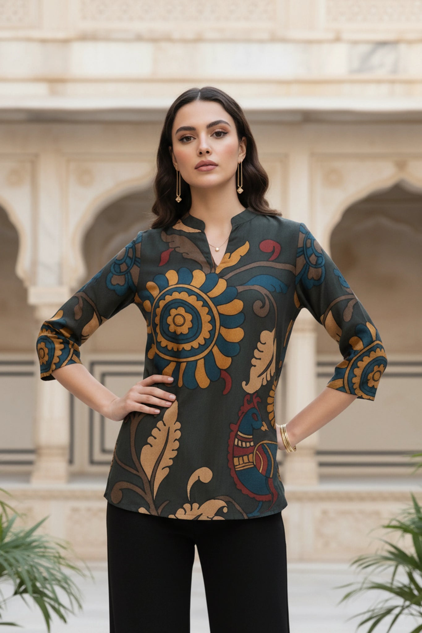 The design features a mandarin collar with a soft V-slit neckline, paired with 3/4th sleeves that keep the look refined and versatile. The body showcases vibrant Kalamkari-style prints — intricate florals, peacock accents, and ornamental patterns in earthy mustard, indigo, and maroon tones — all coming together in a richly detailed canvas.