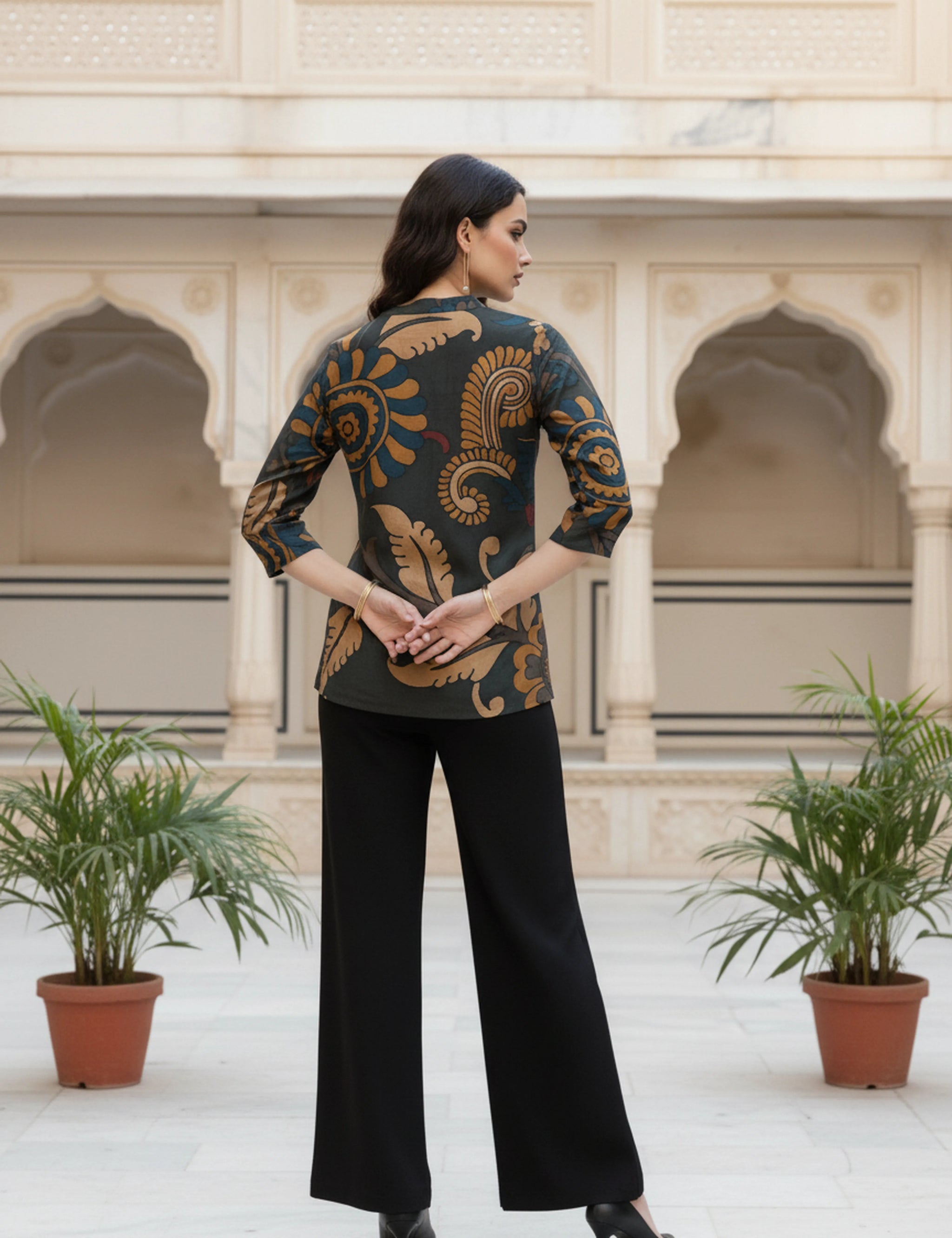 Pair with black or beige straight pants, oxidized earrings, and tan block heels for a boho-elegant finish.
