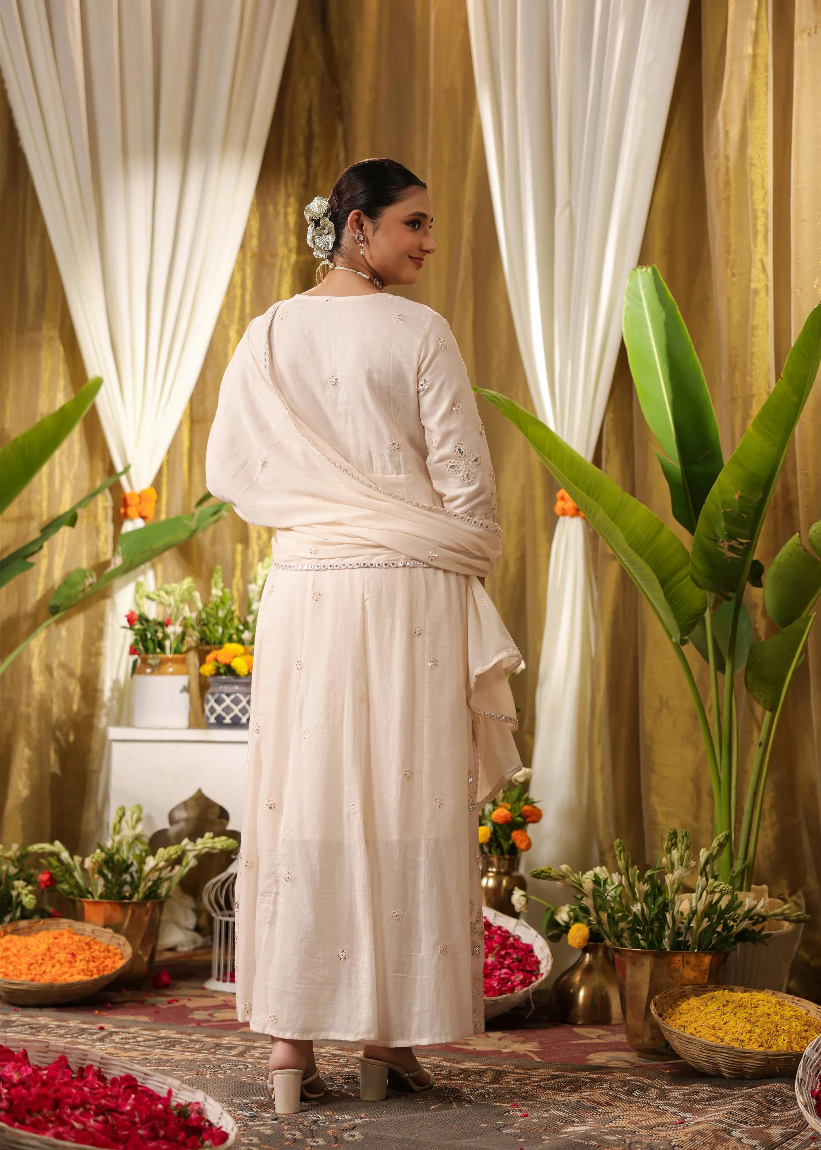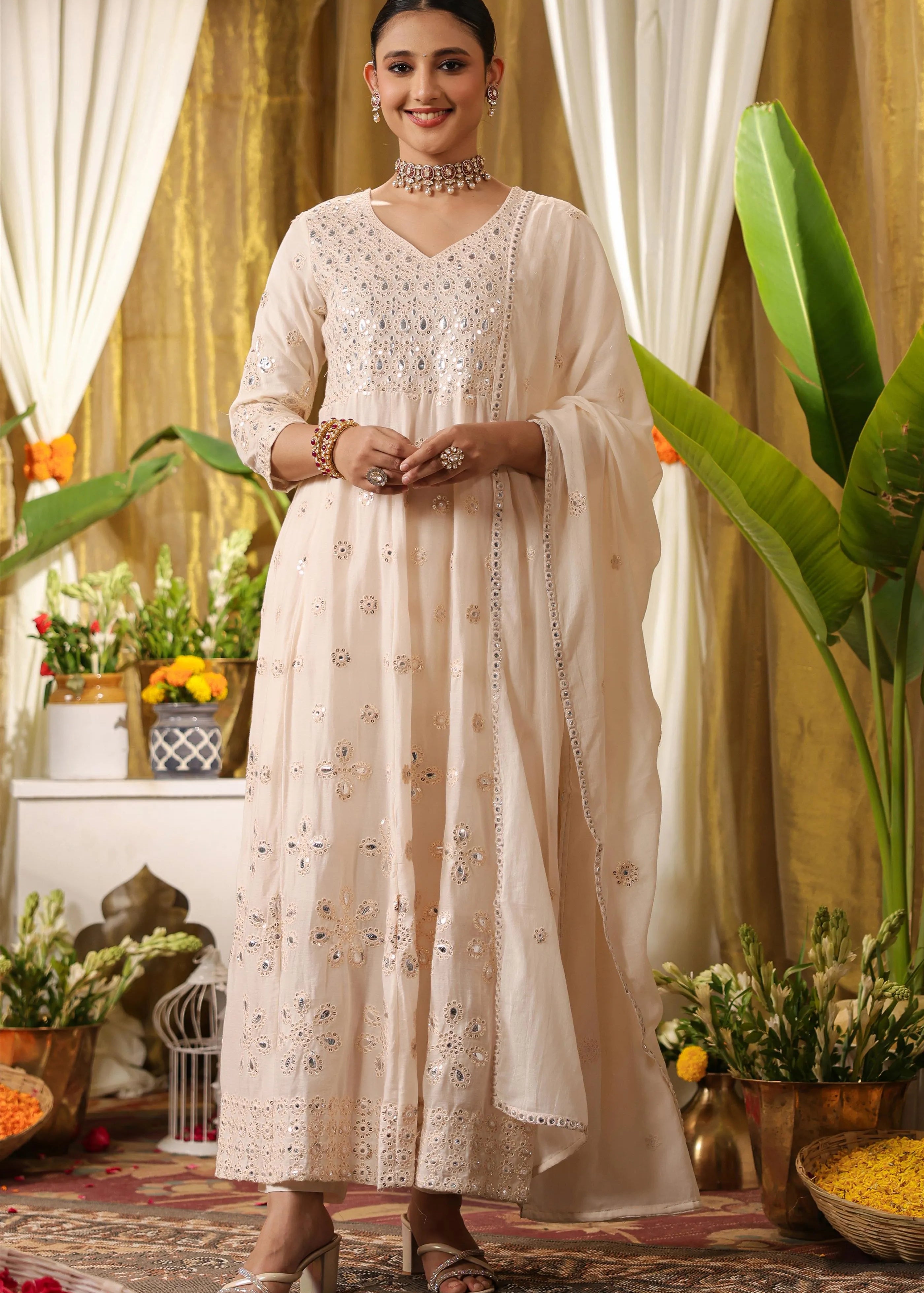 • Choose embellished juttis or heels to complement your outfit.