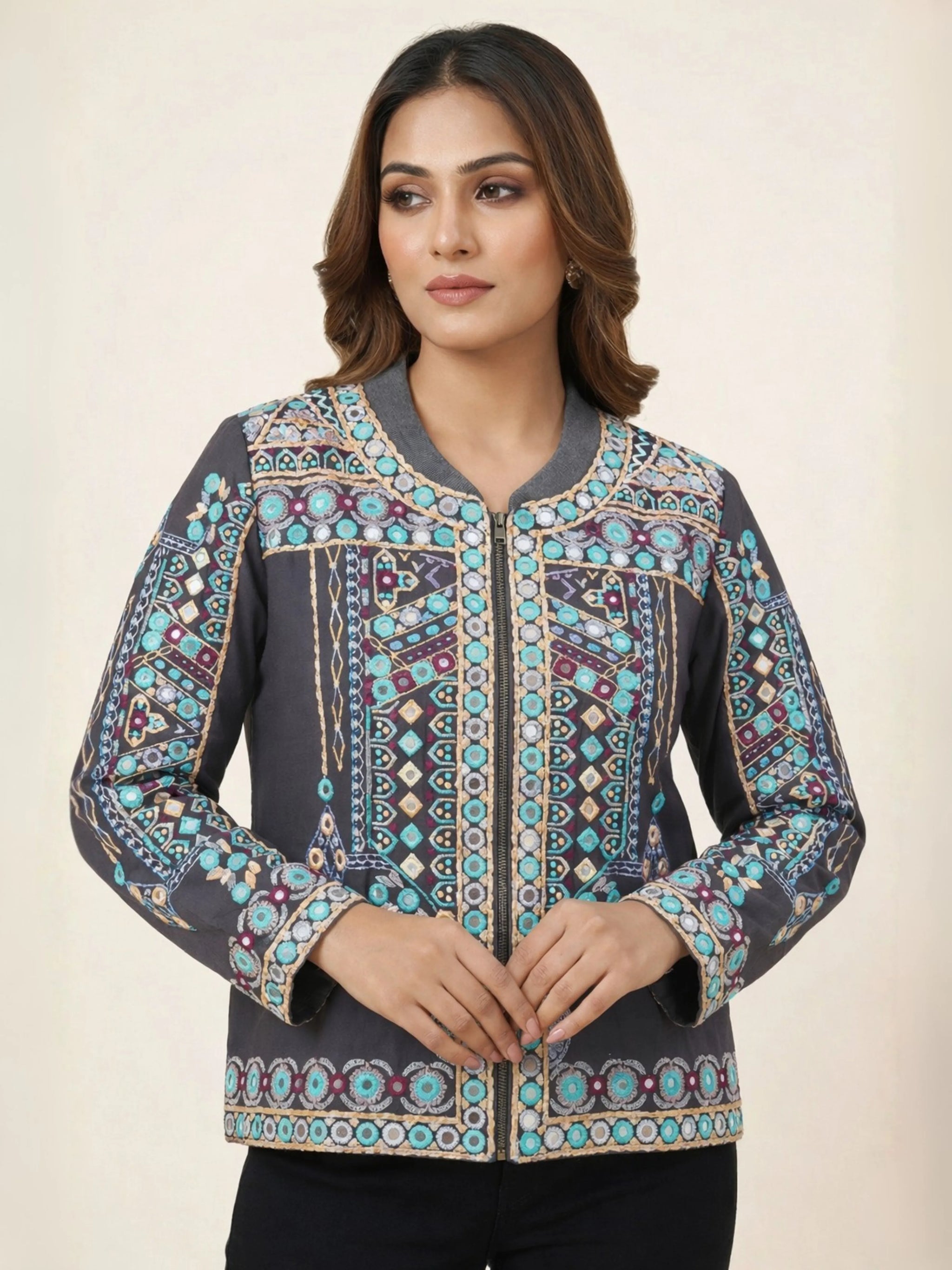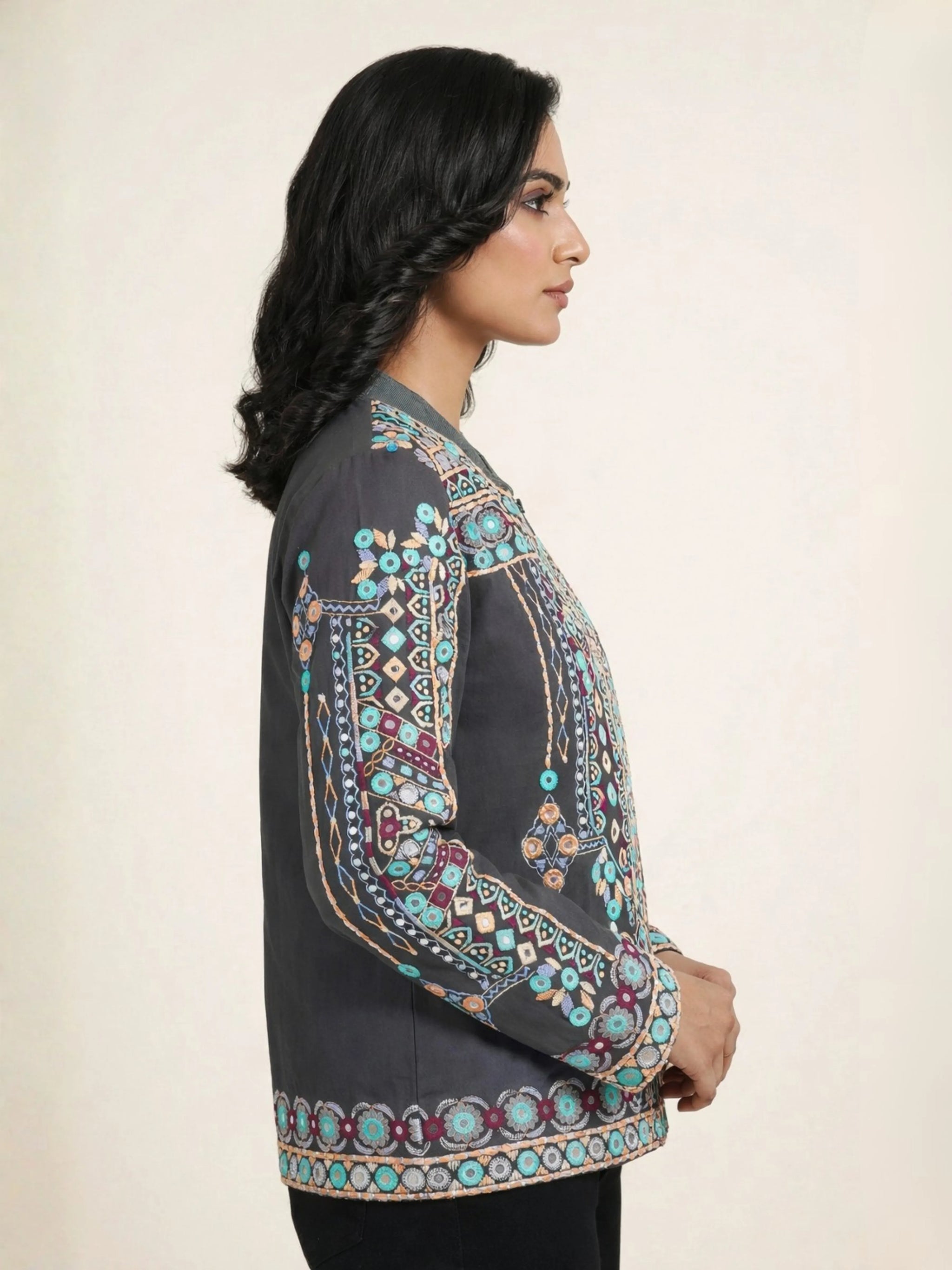 This grey, multicolored, cotton bomber jacket is a statement piece that combines traditional embroidery with modern styling. The jacket features intricate thread embroidery and mirror work, adding a unique and eye-catching touch. With a ribbed collar and long embroidered sleeves, this bomber jacket is designed to turn heads while offering a comfortable and stylish fit.